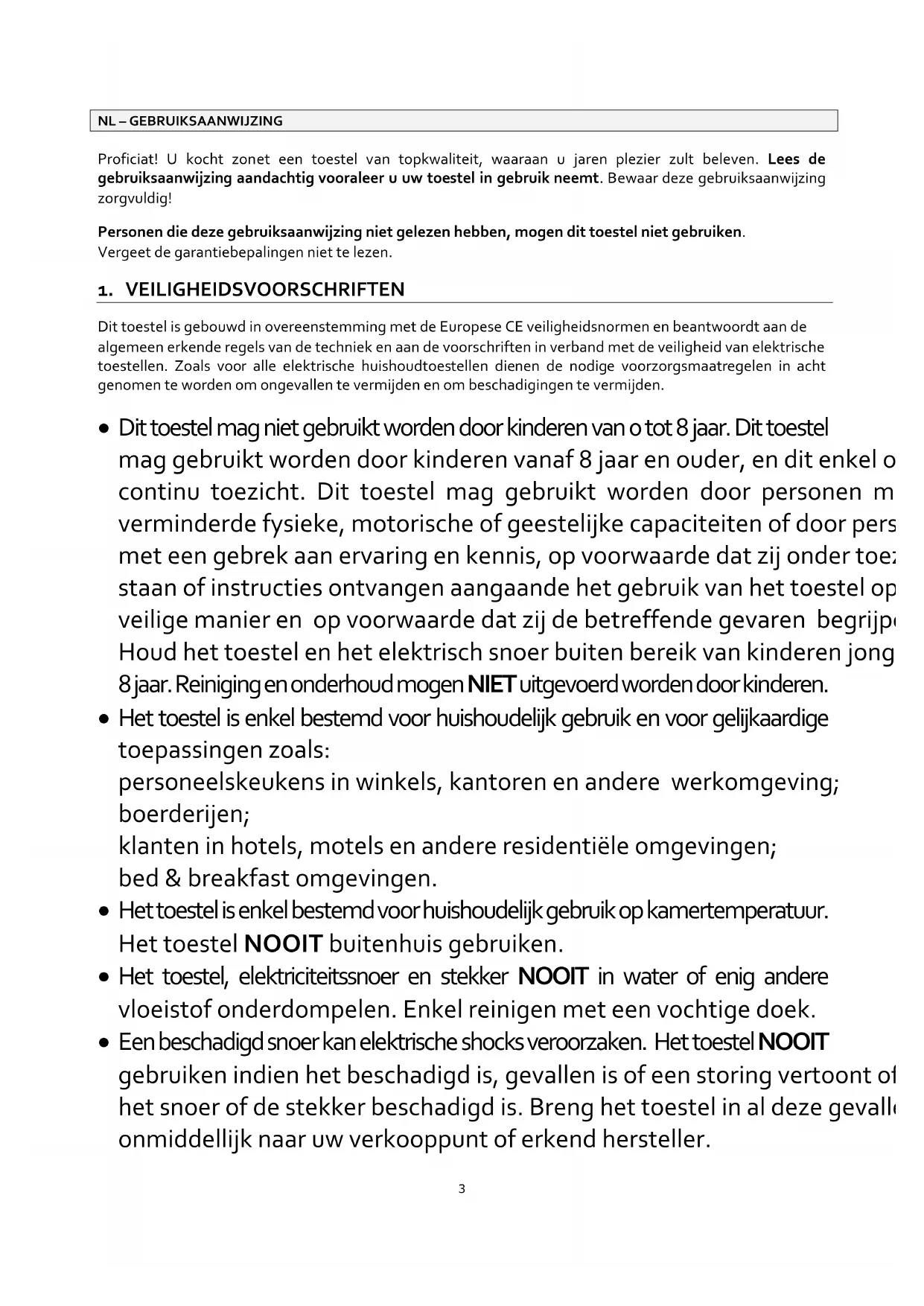 NL – GEBRUIKSAANWIJZING Proficiat! U kocht zonet een toestel van topkwaliteit, waaraan u jaren plezier zult beleven. Lees de gebruiksaanwijzing aandachtig vooraleer u uw toestel in gebruik neemt. Bewaar deze gebruiksaanwijzing zorgvuldig! Personen die deze gebruiksaanwijzing niet gelezen hebben, mogen dit toestel niet gebruiken. Vergeet de garantiebepalingen niet te lezen.