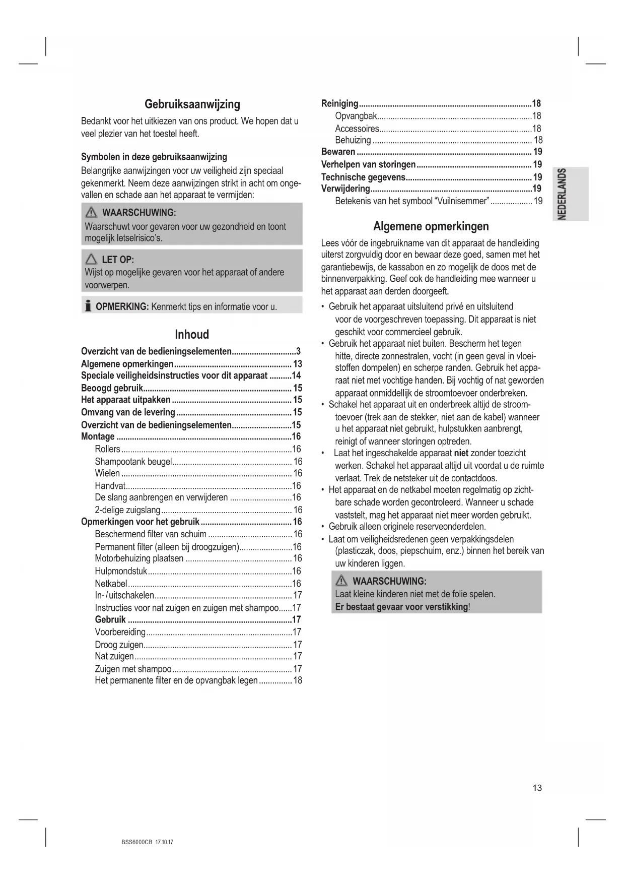- Instructies voor nat zuigen en zuigen met shampoo p. 17