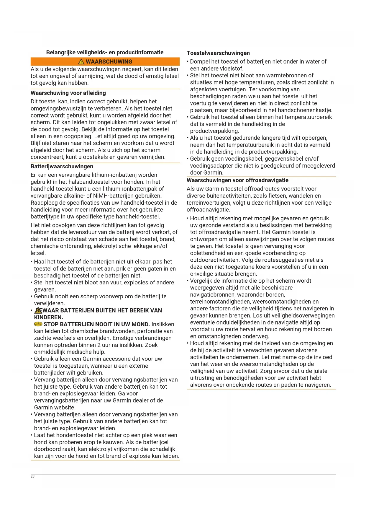 GARANTIE NIET WORDT GERESPECTEERD. U hebt 90 dagen garantie op gerepareerde of vervangen toestellen. Als het toestel ter reparatie wordt opgestuurd tijdens de originele garantieperiode, duurt de nieuwe garantieperiode 90 dagen of tot het einde van de originele garantieperiode van 1 jaar, naargelang welke periode het langst duurt. Raadpleeg de online hulpbronnen op support.garmin.com voordat u garantieservice aanvraagt. Als u deze informatie hebt geraadpleegd en het toestel daarna nog steeds niet naar behoren functioneert, kunt u contact opnemen met een bevoegde servicefaciliteit van Garmin in het land van aankoop of volgt u de instructies op 30support.garmin.com voor de garantieservice. Als u in de Verenigde Staten bent, kunt u ook 1-800-800-1020 bellen. Als u gebruik wilt maken van de garantieservice buiten het land van aankoop, kan Garmin niet garanderen dat de onderdelen of producten voor reparatie of vervanging beschikbaar zijn, wegens verschillen in productaanbod en toepasselijke standaarden en wet- en regelgeving. In dat geval repareert of vervangt Garmin naar eigen oordeel en krachtens de geldende wetgeving uw product mogelijk met vergelijkbare Garmin producten en onderdelen, of dient u uw product naar een bevoegde Garmin servicefaciliteit te verzenden in het land van aankoop of naar een bevoegde Garmin servicefaciliteit in een ander land die uw product in behandeling kan nemen. In dat geval draagt u zelf de verantwoordelijkheid voor conformiteit met alle toepasselijke import- en exportwet- en regelgeving en dient u zelf alle douanekosten, btw, verzendkosten en andere extra belastingen en kosten te betalen. In sommige gevallen kunnen Garmin en haar distributeurs uw toestel niet in behandeling nemen in een ander land dan het land van aankoop of een gerepareerd of vervangen product aan u retourneren in dat land, wegens toepasselijke standaarden en wet- en regelgeving in dat land. Aankopen op onlineveilingen: Aankoopbevestigingen van onlineveilingen worden niet geaccepteerd als garantiebewijs. Om gebruik te kunnen maken van de garantieservice, is de oorspronkelijke of een kopie van de aankoopnota vereist van de winkel waar u het systeem hebt gekocht. Garmin vervangt geen onderdelen van pakketten die zijn aangeschaft via een onlineveiling. Internationale aankopen: Distributeurs buiten de Verenigde Staten verstrekken mogelijk een aparte garantie voor toestellen die buiten de Verenigde Staten zijn aangeschaft. Dit kan per land verschillen. Indien van toepassing wordt deze garantie verstrekt door de lokale binnenlandse distributeur die ook lokaal service voor het toestel verleent. Garanties door distributeurs zijn alleen geldig in het gebied waarvoor de distributie is bedoeld. 31Vigtige sikkerheds- og produktinformationer ADVARSEL Hvis de følgende advarsler ignoreres, kan det resultere i ulykker eller sammenstød med død eller alvorlige personskader til følge. Advarsel om distraktion Enheden er beregnet til at forbedre brugerens opmærksomhed på situationer ved korrekt brug. Hvis den ikke bruges korrekt, kan brugeren blive distraheret af skærmen, og dette kan føre til en ulykke, der kan forårsage alvorlige personskader eller død. Kig kun et øjeblik ad gangen på de oplysninger, der vises på enheden. Hold altid øjnene på vejen, og undgå at stirre på skærmen eller blive distraheret af den. For meget fokus på skærmen, kan hindre dig i at undgå forhindringer og farer. Batteriadvarsler Lithiumionbatteripakken til hundehalsbåndsenheden kan udskiftes. Den håndholdte enhed kan bruge enten en lithiumionbatteripakke eller alkaline- eller NiMH-batterier, der kan udskiftes. Se i dokumentationen til den håndholdte enhed, hvor der er flere oplysninger om batteritypen til din specifikke håndholdte enhed. Hvis disse retningslinjer ikke overholdes, kan batterierne få en kortere levetid eller forårsage beskadigelse af enheden, brand, kemisk forbrænding, elektrolytlækage og/ eller personskade.