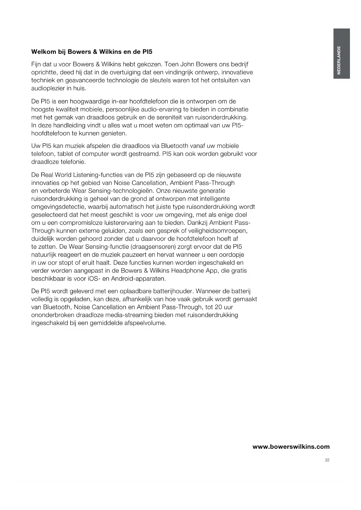 Se precisar de ajuda com a resolução de um problema especíco, ou se tiver apenas alguma questão, consulte inicialmente a secção de apoio relativa a auscultadores no Website da Bowers & Wilkins: www.bowerswilkins.com. Imagem5 Utilizar os auscultadores31 PORTUGUÊS Especicações Características técnicas Tecnologia True Wireless Bluetooth 5.0 com tecnologia AptX Auto ANC Carregamento sem os e USB-C Suporte para carregamento rápido Codecs Bluetooth AptX AAC SBC Pers Bluetooth A2DP v1.3.1 AVRCP v1.6.1 HFP v1.7.1 HSP v1.2 BLE GATT (Perl de Atributo Genérico) Banda de frequências Modo Tx: 2402MHz a 2480MHZ, banda ISM, Modo Rx: 2402MHz a 2480MHz, banda ISM Potência de saída RF <10,0dBm Diafragmas 9,2mm Dynamic Drive Gama de frequências 10Hz a 20kHz Distorção (THD) <0,3% (1kHz/10mW) Duração da bateria Até 4horas com Bluetooth Carregamento 15minutos de carga = 2horas Bluetooth Entradas Bluetooth Peso 7g para os auriculares, 47g para a caixa de carregamento32 NEDERLANDS www.bowerswilkins.com Welkom bij Bowers & Wilkins en de PI5 Fijn dat u voor Bowers & Wilkins hebt gekozen. Toen John Bowers ons bedrijf oprichtte, deed hij dat in de overtuiging dat een vindingrijk ontwerp, innovatieve techniek en geavanceerde technologie de sleutels waren tot het ontsluiten van audioplezier in huis. De PI5 is een hoogwaardige in-ear hoofdtelefoon die is ontworpen om de hoogste kwaliteit mobiele, persoonlijke audio-ervaring te bieden in combinatie met het gemak van draadloos gebruik en de sereniteit van ruisonderdrukking. In deze handleiding vindt u alles wat u moet weten om optimaal van uw PI5- hoofdtelefoon te kunnen genieten. Uw PI5 kan muziek afspelen die draadloos via Bluetooth vanaf uw mobiele telefoon, tablet of computer wordt gestreamd. PI5 kan ook worden gebruikt voor draadloze telefonie. De Real World Listening-functies van de PI5 zijn gebaseerd op de nieuwste innovaties op het gebied van Noise Cancellation, Ambient Pass-Through en verbeterde Wear Sensing-technologieën. Onze nieuwste generatie ruisonderdrukking is geheel van de grond af ontworpen met intelligente omgevingsdetectie, waarbij automatisch het juiste type ruisonderdrukking wordt geselecteerd dat het meest geschikt is voor uw omgeving, met als enige doel om u een compromisloze luisterervaring aan te bieden. Dankzij Ambient Pass- Through kunnen externe geluiden, zoals een gesprek of veiligheidsomroepen, duidelijk worden gehoord zonder dat u daarvoor de hoofdtelefoon hoeft af te zetten. De Wear Sensing-functie (draagsensoren) zorgt ervoor dat de PI5 natuurlijk reageert en de muziek pauzeert en hervat wanneer u een oordopje in uw oor stopt of eruit haalt. Deze functies kunnen worden ingeschakeld en verder worden aangepast in de Bowers & Wilkins Headphone App, die gratis beschikbaar is voor iOS- en Android-apparaten. De PI5 wordt geleverd met een oplaadbare batterijhouder. Wanneer de batterij volledig is opgeladen, kan deze, afhankelijk van hoe vaak gebruik wordt gemaakt van Bluetooth, Noise Cancellation en Ambient Pass-Through, tot 20uur ononderbroken draadloze media-streaming bieden met ruisonderdrukking ingeschakeld bij een gemiddelde afspeelvolume. NEDERLANDS Inhoud NEDERLANDS 32
