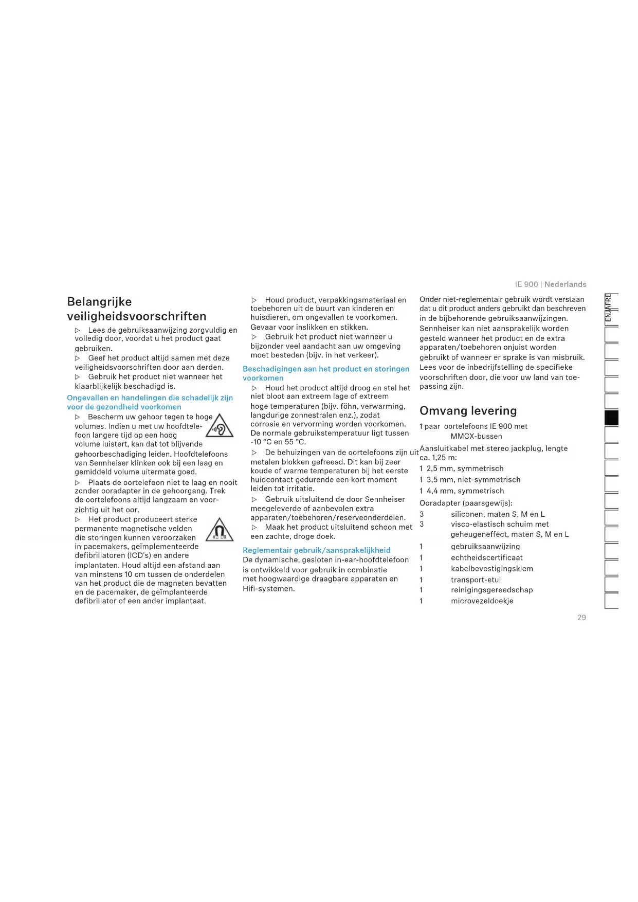 IE 900 | Nederlands Belangrijke veiligheidsvoorschriften ▷ Lees de gebruiksaanwijzing zorgvuldig en volledig door, voordat u het product gaat gebruiken. ▷ Geef het product altijd samen met deze veiligheidsvoorschriften door aan derden. ▷ Gebruik het product niet wanneer het klaarblijkelijk beschadigd is. Ongevallen en handelingen die schadelijk zijn voor de gezondheid voorkomen ▷ Bescherm uw gehoor tegen te hoge volumes. Indien u met uw hoofdtele- foon langere tijd op een hoog volume luistert, kan dat tot blijvende gehoorbeschadiging leiden. Hoofdtelefoons van Sennheiser klinken ook bij een laag en gemiddeld volume uitermate goed. ▷ Plaats de oortelefoon niet te laag en nooit zonder ooradapter in de gehoorgang. Trek de oortelefoons altijd langzaam en voor- zichtig uit het oor. ▷ Het product produceert sterke permanente magnetische velden die storingen kunnen veroorzaken in pacemakers, geïmplementeerde defibrillatoren (ICD's) en andere implantaten. Houd altijd een afstand aan van minstens 10 cm tussen de onderdelen van het product die de magneten bevatten en de pacemaker, de geïmplanteerde defibrillator of een ander implantaat. ▷ Houd product, verpakkingsmateriaal en toebehoren uit de buurt van kinderen en huisdieren, om ongevallen te voorkomen. Gevaar voor inslikken en stikken. ▷ Gebruik het product niet wanneer u bijzonder veel aandacht aan uw omgeving moet besteden (bijv. in het verkeer). Beschadigingen aan het product en storingen voorkomen ▷ Houd het product altijd droog en stel het niet bloot aan extreem lage of extreem hoge temperaturen (bijv. föhn, verwarming, langdurige zonnestralen enz.), zodat corrosie en vervorming worden voorkomen. De normale gebruikstemperatuur ligt tussen -10 °C en 55 °C. ▷ De behuizingen van de oortelefoons zijn uit metalen blokken gefreesd. Dit kan bij zeer koude of warme temperaturen bij het eerste huidcontact gedurende een kort moment leiden tot irritatie. ▷ Gebruik uitsluitend de door Sennheiser meegeleverde of aanbevolen extra apparaten/toebehoren/reserveonderdelen. ▷ Maak het product uitsluitend schoon met een zachte, droge doek. Reglementair gebruik/aansprakelijkheid De dynamische, gesloten in-ear-hoofdtelefoon is ontwikkeld voor gebruik in combinatie met hoogwaardige draagbare apparaten en Hifi-systemen. Onder niet-reglementair gebruik wordt verstaan dat u dit product anders gebruikt dan beschreven in de bijbehorende gebruiksaanwijzingen. Sennheiser kan niet aansprakelijk worden gesteld wanneer het product en de extra apparaten/toebehoren onjuist worden gebruikt of wanneer er sprake is van misbruik. Lees voor de inbedrijfstelling de specifieke voorschriften door, die voor uw land van toe- passing zijn. Omvang levering 1 paar oortelefoons IE 900 met MMCX-bussen Aansluitkabel met stereo jackplug, lengte ca. 1,25 m: 1 2,5 mm, symmetrisch 1 3,5 mm, niet-symmetrisch 1 4,4 mm, symmetrisch Ooradapter (paarsgewijs): 3 siliconen, maten S, M en L 3 visco-elastisch schuim met geheugeneffect, maten S, M en L 1 gebruiksaanwijzing 1 echtheidscertificaat 1 kabelbevestigingsklem 1 transport-etui 1 reinigingsgereedschap 1 microvezeldoekje30 Nederlands | IE 900 Uw Sennheiser IE 900 Voor veeleisende muziekliefhebbers is de zoektocht naar het ideale geluid een eindeloos streven naar perfectie. Geïnspireerd door deze passie is de IE 900 het nieuwe vlaggenschip in de in-ear-serie van Sennheiser. Het zet nieuwe maatstaven op het gebied van de getrouwe geluidsweergave. De voortreffelijke behuizing, een verbeterde versie van de veel geprezen 7 mm XWB- omzetter en de belangrijkste eigenschappen van het klankkanaal: er is bij de ontwikkeling op elk aspect gelet, hoe klein ook, om de uitgebreide kennis van Sennheiser op het gebied van akoestiek in deze in-ear- hoofdtelefoon hoorbaar te maken. Het nieuwe akoestische design heeft een verbeterde spreekspoel die de prestatie bij hoge frequenties voor een briljante, natuurlijke klank verbetert. Natuurlijke resonanties en harmonische vervormingen worden door een verbeterde membraanfolie tot een minimum beperkt. Het resultaat van al deze verfijningen is een buitengewoon natuurlijke geluidsweergave om zelfs de meest veeleisende audio-liefhebbers te belonen. De IE 900 wordt in de hoofdfabriek van Sennheiser in Duitsland geproduceerd, waarbij een team van experts ervoor zorgt dat minimale productietoleranties in acht worden genomen. Elke geluidsomvormer wordt twee keer volledig getest, zowel afzonderlijk vóór als samen na het samenvoegen van de rechter en linker oortelefoon. De geluidsomvormers van de rechter- en linkerkant worden gekozen om optimaal op elkaar afgestemd te zijn. Dit oog voor detail ziet u ook terug in het op professionele audio geïnspireerde premiumdesign. Elke behuizing wordt heel nauwkeurig uit één blok hoogwaardig aluminium gefreesd om een maximale audiokwaliteit en tegelijkertijd een buitengewone houdbaarheid te garanderen. De IE 900 biedt bovendien een uitstekende connectiviteit met hoogwaardige Fidelity