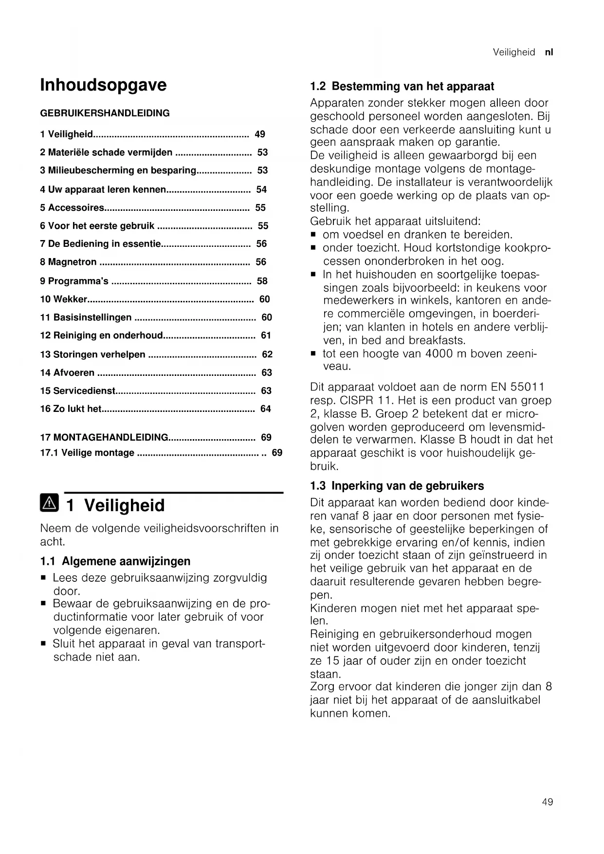 1 Veiligheid Neem de volgende veiligheidsvoorschriften in acht. 1.1 Algemene aanwijzingen ¡ Lees deze gebruiksaanwijzing zorgvuldig door. ¡ Bewaar de gebruiksaanwijzing en de pro- ductinformatie voor later gebruik of voor volgende eigenaren. ¡ Sluit het apparaat in geval van transport- schade niet aan. 1.2 Bestemming van het apparaat Apparaten zonder stekker mogen alleen door geschoold personeel worden aangesloten. Bij schade door een verkeerde aansluiting kunt u geen aanspraak maken op garantie. De veiligheid is alleen gewaarborgd bij een deskundige montage volgens de montage- handleiding. De installateur is verantwoordelijk voor een goede werking op de plaats van op- stelling. Gebruik het apparaat uitsluitend: ¡ om voedsel en dranken te bereiden. ¡ onder toezicht. Houd kortstondige kookpro- cessen ononderbroken in het oog. ¡ In het huishouden en soortgelijke toepas- singen zoals bijvoorbeeld: in keukens voor medewerkers in winkels, kantoren en ande- re commerciële omgevingen, in boerderi- jen; van klanten in hotels en andere verblij- ven, in bed and breakfasts. ¡ tot een hoogte van 4000m boven zeeni- veau. Dit apparaat voldoet aan de norm EN55011 resp. CISPR11. Het is een product van groep 2, klasse B. Groep 2 betekent dat er micro- golven worden geproduceerd om levensmid- delen te verwarmen. Klasse B houdt in dat het apparaat geschikt is voor huishoudelijk ge- bruik. 1.3 Inperking van de gebruikers Dit apparaat kan worden bediend door kinde- ren vanaf 8 jaar en door personen met fysie- ke, sensorische of geestelijke beperkingen of met gebrekkige ervaring en/of kennis, indien zij onder toezicht staan of zijn geïnstrueerd in het veilige gebruik van het apparaat en de daaruit resulterende gevaren hebben begre- pen. Kinderen mogen niet met het apparaat spe- len. Reiniging en gebruikersonderhoud mogen niet worden uitgevoerd door kinderen, tenzij ze 15jaar of ouder zijn en onder toezicht staan. Zorg ervoor dat kinderen die jonger zijn dan 8 jaar niet bij het apparaat of de aansluitkabel kunnen komen.nl Veiligheid