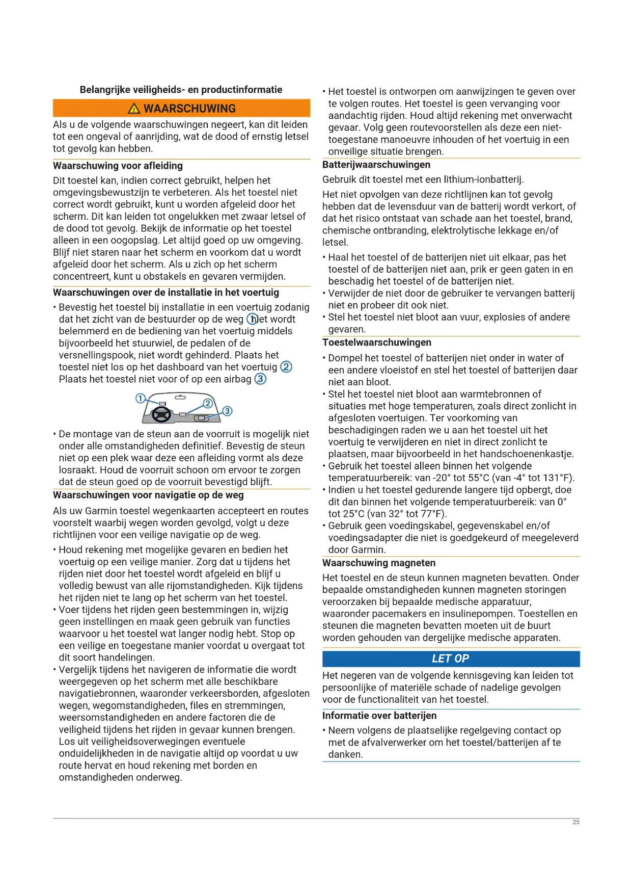- Voer tijdens het rijden geen bestemmingen in, wijzig geen instellingen en maak geen gebruik van functies waarvoor u het toestel wat langer nodig hebt. Stop op een veilige en toegestane manier voordat u overgaat tot dit soort handelingen.