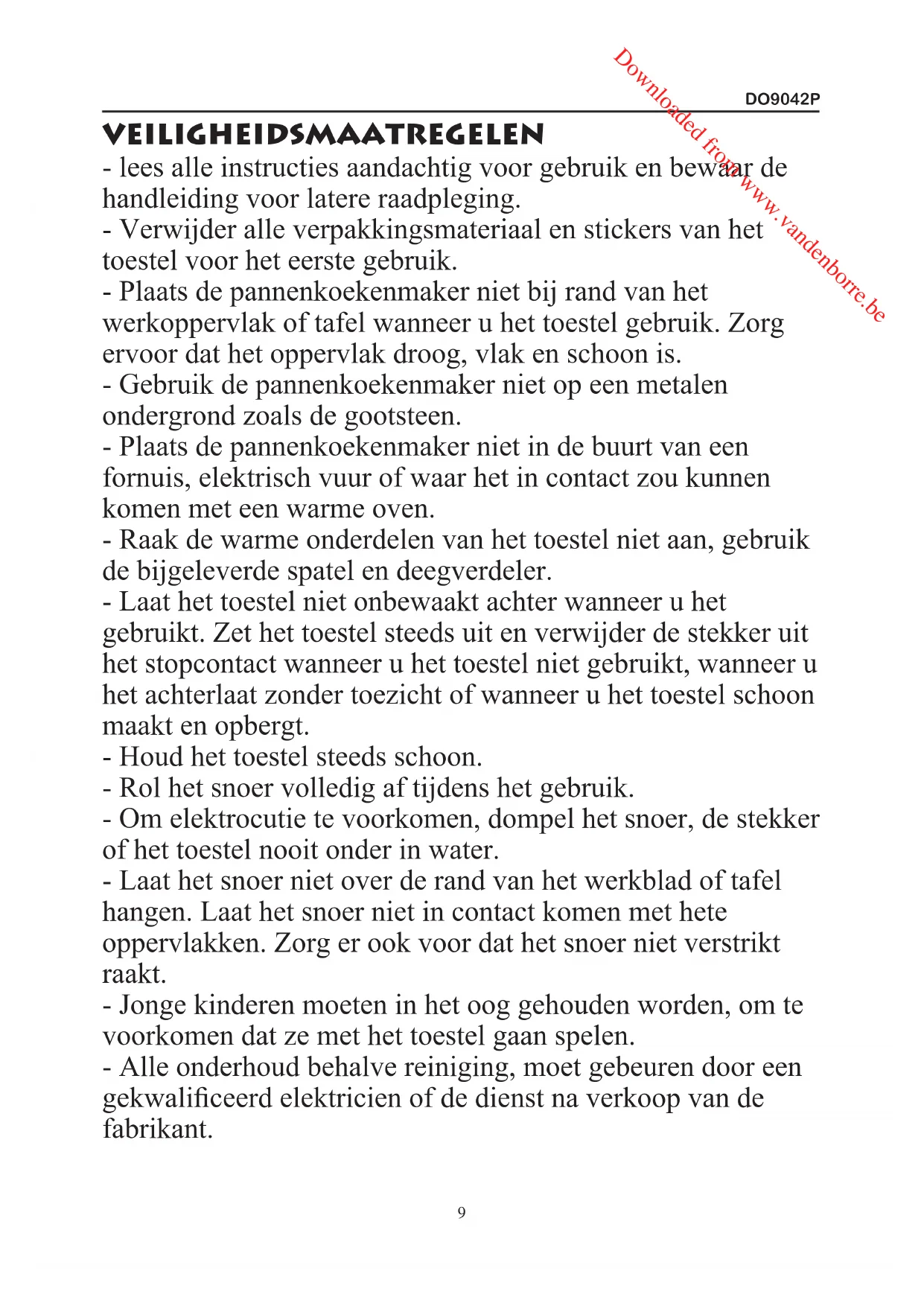 Downloaded from www.vandenborre.beDO9042P VEILIGHEIDSMAATREGELEN - lees alle instructies aandachtig voor gebruik en bewaar de handleiding voor latere raadpleging. - Verwijder alle verpakkingsmateriaal en stickers van het toestel voor het eerste gebruik. - Plaats de pannenkoekenmaker niet bij rand van het werkoppervlak of tafel wanneer u het toestel gebruik. Zorg ervoor dat het oppervlak droog, vlak en schoon is. - Gebruik de pannenkoekenmaker niet op een metalen ondergrond zoals de gootsteen. - Plaats de pannenkoekenmaker niet in de buurt van een fornuis, elektrisch vuur of waar het in contact zou kunnen komen met een warme oven. - Raak de warme onderdelen van het toestel niet aan, gebruik de bijgeleverde spatel en deegverdeler. - Laat het toestel niet onbewaakt achter wanneer u het gebruikt. Zet het toestel steeds uit en verwijder de stekker uit het stopcontact wanneer u het toestel niet gebruikt, wanneer u het achterlaat zonder toezicht of wanneer u het toestel schoon maakt en opbergt. - Houd het toestel steeds schoon. - Rol het snoer volledig af tijdens het gebruik. - Om elektrocutie te voorkomen, dompel het snoer, de stekker of het toestel nooit onder in water. - Laat het snoer niet over de rand van het werkblad of tafel hangen. Laat het snoer niet in contact komen met hete oppervlakken. Zorg er ook voor dat het snoer niet verstrikt raakt. - Jonge kinderen moeten in het oog gehouden worden, om te voorkomen dat ze met het toestel gaan spelen. - Alle onderhoud behalve reiniging, moet gebeuren door een gekwaliceerd elektricien of de dienst na verkoop van de fabrikant.