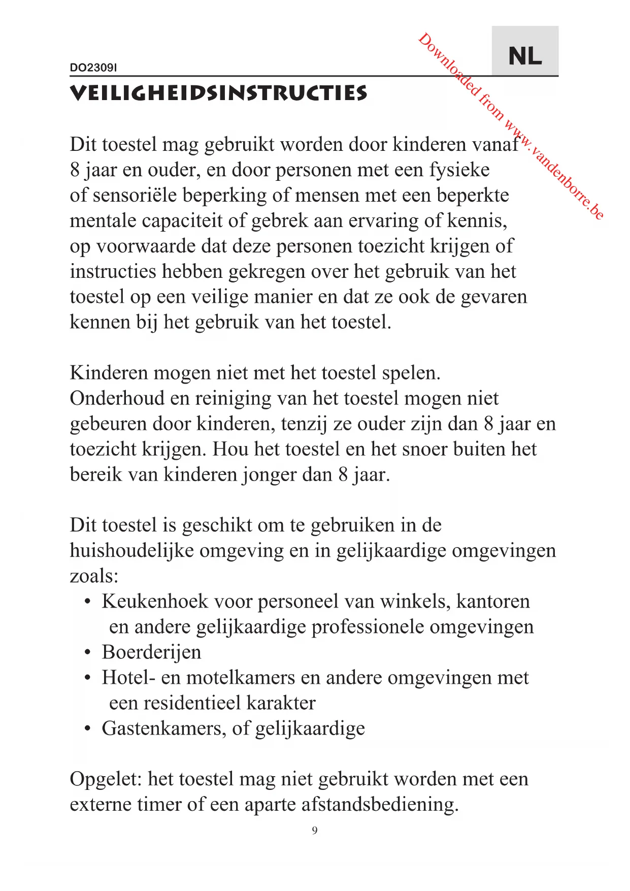 - Breng geen wijzigingen aan aan het toestel. Vervang het snoer bv. niet thuis. Herstellingen mogen enkel uitgevoerd worden bij een gespecialiseerde Downloaded from www.vandenborre.beDO2309I