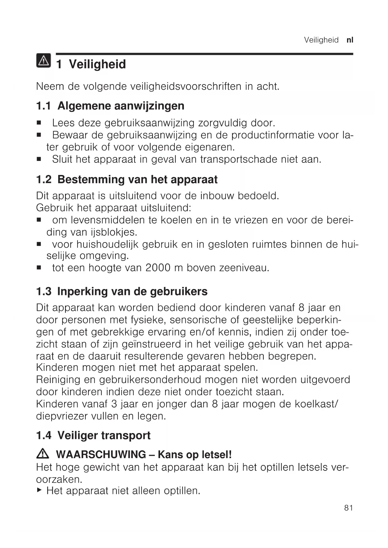 1 Veiligheid Neem de volgende veiligheidsvoorschriften in acht. 1.1 Algemene aanwijzingen ¡ Lees deze gebruiksaanwijzing zorgvuldig door. ¡ Bewaar de gebruiksaanwijzing en de productinformatie voor la- ter gebruik of voor volgende eigenaren. ¡ Sluit het apparaat in geval van transportschade niet aan. 1.2 Bestemming van het apparaat Dit apparaat is uitsluitend voor de inbouw bedoeld. Gebruik het apparaat uitsluitend: ¡ om levensmiddelen te koelen en in te vriezen en voor de berei- ding van ijsblokjes. ¡ voor huishoudelijk gebruik en in gesloten ruimtes binnen de hui- selijke omgeving. ¡ tot een hoogte van 2000m boven zeeniveau. 1.3 Inperking van de gebruikers Dit apparaat kan worden bediend door kinderen vanaf 8 jaar en door personen met fysieke, sensorische of geestelijke beperkin- gen of met gebrekkige ervaring en/of kennis, indien zij onder toe- zicht staan of zijn geïnstrueerd in het veilige gebruik van het appa- raat en de daaruit resulterende gevaren hebben begrepen. Kinderen mogen niet met het apparaat spelen. Reiniging en gebruikersonderhoud mogen niet worden uitgevoerd door kinderen indien deze niet onder toezicht staan. Kinderen vanaf 3 jaar en jonger dan 8 jaar mogen de koelkast/ diepvriezer vullen en legen. 1.4 Veiliger transport WAARSCHUWING‒Kans op letsel! Het hoge gewicht van het apparaat kan bij het optillen letsels ver- oorzaken.
