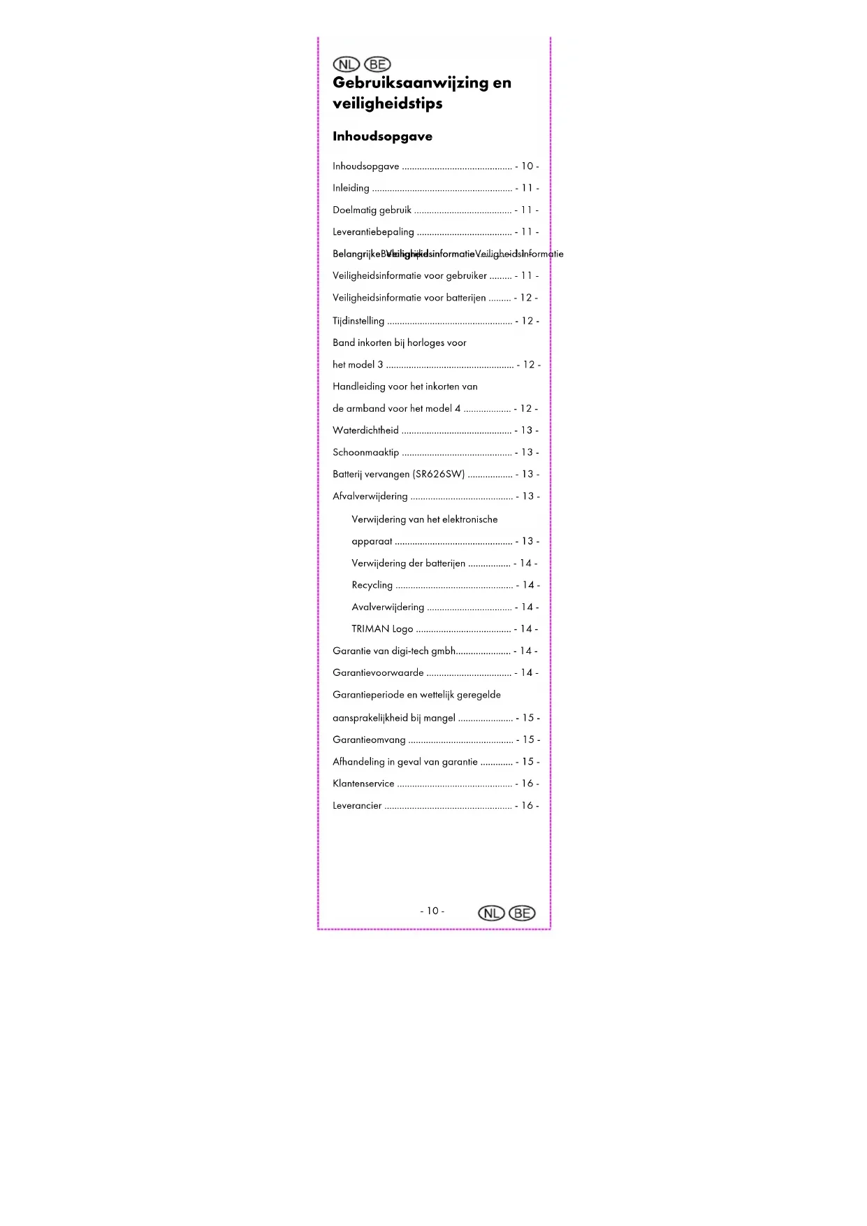Fournisseur Veuillez noter que l’adresse suivante n’est pas une adresse de SAV. Prière de contacter d’abord l’adresse indiquée plus haut. Nom: digi-tech gmbh Rue: Valterweg 27A Ville: DE-65817 Eppstein Pays: ALLEMAGNE- 10 - Gebruiksaanwijzing en veiligheidstips Inhoudsopgave Inhoudsopgave ............................................ - 10 - Inleiding ........................................................ - 11 - Doelmatig gebruik ....................................... - 11 - Leverantiebepaling ...................................... - 11 - Belangrijke BelangrijkeBelangrijke Belangrijke Veiligheidsinformatie VeiligheidsinformatieVeiligheidsinformatie Veiligheidsinformatie ........... - 11 - Veiligheidsinformatie voor gebruiker ......... - 11 - Veiligheidsinformatie voor batterijen ......... - 12 - Tijdinstelling .................................................. - 12 - Band inkorten bij horloges voor het model 3 ................................................... - 12 - Handleiding voor het inkorten van de armband voor het model 4 ................... - 12 - Waterdichtheid ............................................ - 13 - Schoonmaaktip ............................................ - 13 - Batterij vervangen (SR626SW) .................. - 13 - Afvalverwijdering ......................................... - 13 - Verwijdering van het elektronische apparaat ............................................... - 13 - Verwijdering der batterijen ................. - 14 - Recycling ............................................... - 14 - Avalverwijdering .................................. - 14 - TRIMAN Logo ...................................... - 14 - Garantie van digi-tech gmbh...................... - 14 - Garantievoorwaarde .................................. - 14 - Garantieperiode en wettelijk geregelde aansprakelijkheid bij mangel ...................... - 15 - Garantieomvang .......................................... - 15 - Afhandeling in geval van garantie ............. - 15 - Klantenservice .............................................. - 16 - Leverancier ................................................... - 16 -- 11 - HORLOGE Inleiding Gefeliciteerd met de aankoop van uw nieuwe horloge. U heeft hier een goede keus voor een hoogwaardig product gedaan. De handleiding is bestanddeel van dit horloge en bevat belangrijke aanwijzingen voor het gebruik, de veiligheid en de afvalverwijdering. Maakt u zich voor de ingebruikname van het horloge met alle gebruiks- en veiligheidsaanwzijzingen vertrouwd. Gebruik het horloge alleen zoals beschreven en alleen voor het aangegeven bereik. Gelieve aub de verpakking en instructies bij te houden voor eventuele verzoeken voor extra informatie. Doelmatig gebruik Het horloge is zowel voor tijdweergave als ook voor andere beschreven extra functies geschikt. Ieder ander gebruik en/of verandering van het horloge geldt als niet reglementair gebruik. De producent is niet aansprakelijk voor schade die door ondoelmatig gebruik en/of verkeerd gebruik wordt veroorzaakt. Dit horloge is niet voor industriele doeleinden geschikt. Leverantiebepaling Heenwijs: controleer na aankoop of de levering compleet is. Stel zeker, dat alle onderdelen voorhanden en niet defect zijn. 1 x Horloge incl. batterij 1 x Schakel voor het model 3 1 x Gebruiksaanwijzing Belangrijke Veiligheidsinformatie Veiligheidsinformatie voor gebruiker