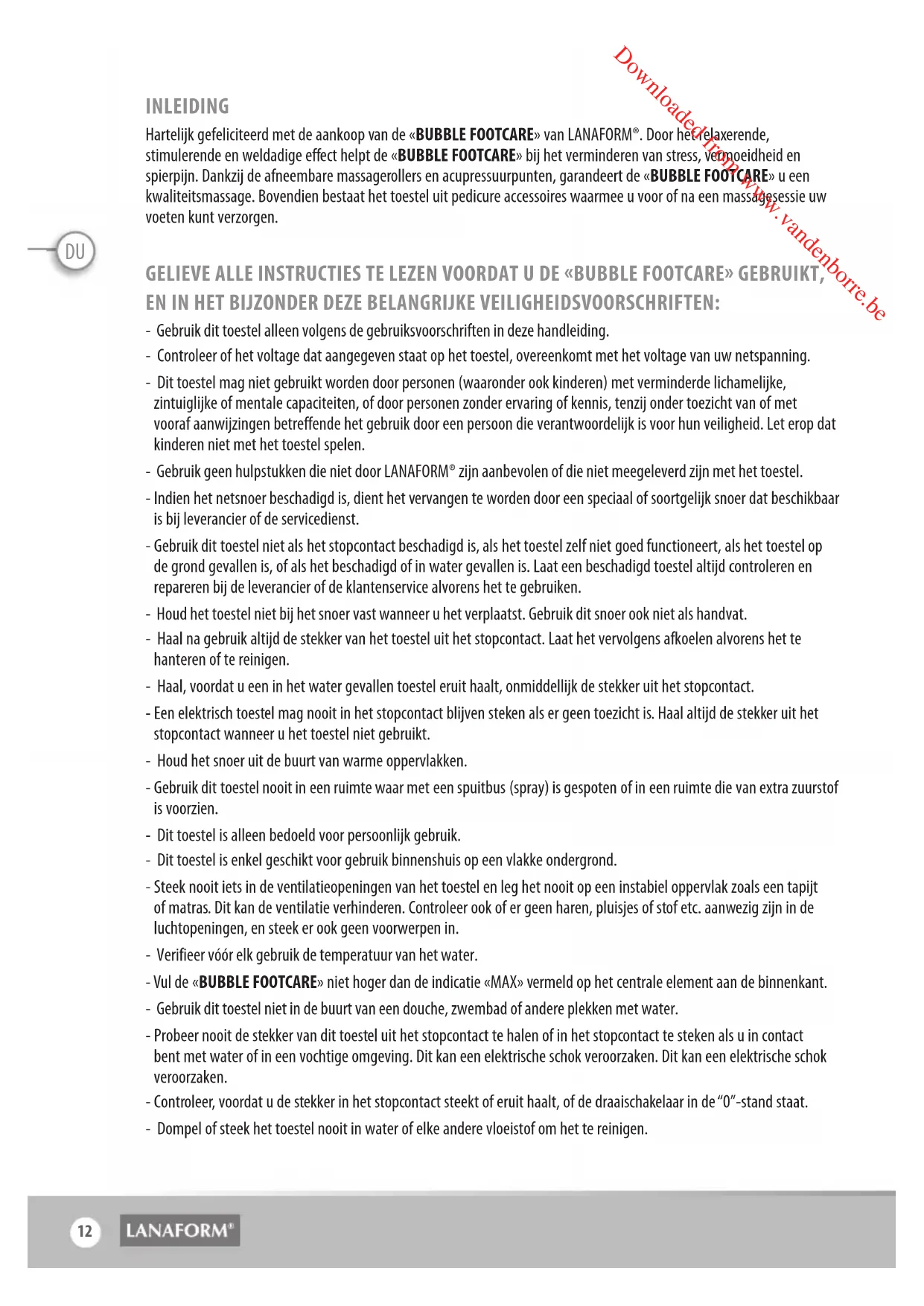 Downloaded from www.vandenborre.beDU INLEIDING Hartelijk gefeliciteerd met de aankoop van de «BUBBLE FOOTCARE» van LANAFORM®. Door het relaxerende, stimulerende en weldadige effect helpt de «BUBBLE FOOTCARE» bij het verminderen van stress, vermoeidheid en spierpijn. Dankzij de afneembare massagerollers en acupressuurpunten, garandeert de «BUBBLE FOOTCARE» u een kwaliteitsmassage. Bovendien bestaat het toestel uit pedicure accessoires waarmee u voor of na een massagesessie uw voeten kunt verzorgen. GELIEVE ALLE INSTRUCTIES TE LEZEN VOORDAT U DE «BUBBLE FOOTCARE» GEBRUIKT, EN IN HET BIJZONDER DEZE BELANGRIJKE VEILIGHEIDSVOORSCHRIFTEN: - Gebruik dit toestel alleen volgens de gebruiksvoorschriften in deze handleiding. - Controleer of het voltage dat aangegeven staat op het toestel, overeenkomt met het voltage van uw netspanning. - Dit toestel mag niet gebruikt worden door personen (waaronder ook kinderen) met verminderde lichamelijke, zintuiglijke of mentale capaciteiten, of door personen zonder ervaring of kennis, tenzij onder toezicht van of met vooraf aanwijzingen betreffende het gebruik door een persoon die verantwoordelijk is voor hun veiligheid. Let erop dat kinderen niet met het toestel spelen. - Gebruik geen hulpstukken die niet door LANAFORM® zijn aanbevolen of die niet meegeleverd zijn met het toestel. - Indien het netsnoer beschadigd is, dient het vervangen te worden door een speciaal of soortgelijk snoer dat beschikbaar is bij leverancier of de servicedienst. - Gebruik dit toestel niet als het stopcontact beschadigd is, als het toestel zelf niet goed functioneert, als het toestel op de grond gevallen is, of als het beschadigd of in water gevallen is. Laat een beschadigd toestel altijd controleren en repareren bij de leverancier of de klantenservice alvorens het te gebruiken. - Houd het toestel niet bij het snoer vast wanneer u het verplaatst. Gebruik dit snoer ook niet als handvat. - Haal na gebruik altijd de stekker van het toestel uit het stopcontact. Laat het vervolgens afkoelen alvorens het te hanteren of te reinigen. - Haal, voordat u een in het water gevallen toestel eruit haalt, onmiddellijk de stekker uit het stopcontact. - Een elektrisch toestel mag nooit in het stopcontact blijven steken als er geen toezicht is. Haal altijd de stekker uit het stopcontact wanneer u het toestel niet gebruikt. - Houd het snoer uit de buurt van warme oppervlakken. - Gebruik dit toestel nooit in een ruimte waar met een spuitbus (spray) is gespoten of in een ruimte die van extra zuurstof is voorzien. - Dit toestel is alleen bedoeld voor persoonlijk gebruik. - Dit toestel is enkel geschikt voor gebruik binnenshuis op een vlakke ondergrond. - Steek nooit iets in de ventilatieopeningen van het toestel en leg het nooit op een instabiel oppervlak zoals een tapijt of matras. Dit kan de ventilatie verhinderen. Controleer ook of er geen haren, pluisjes of stof etc. aanwezig zijn in de luchtopeningen, en steek er ook geen voorwerpen in. - Verifieer vóór elk gebruik de temperatuur van het water. - Vul de «BUBBLE FOOTCARE» niet hoger dan de indicatie «MAX» vermeld op het centrale element aan de binnenkant. - Gebruik dit toestel niet in de buurt van een douche, zwembad of andere plekken met water. - Probeer nooit de stekker van dit toestel uit het stopcontact te halen of in het stopcontact te steken als u in contact bent met water of in een vochtige omgeving. Dit kan een elektrische schok veroorzaken. Dit kan een elektrische schok veroorzaken. - Controleer, voordat u de stekker in het stopcontact steekt of eruit haalt, of de draaischakelaar in de “0”-stand staat. - Dompel of steek het toestel nooit in water of elke andere vloeistof om het te reinigen.