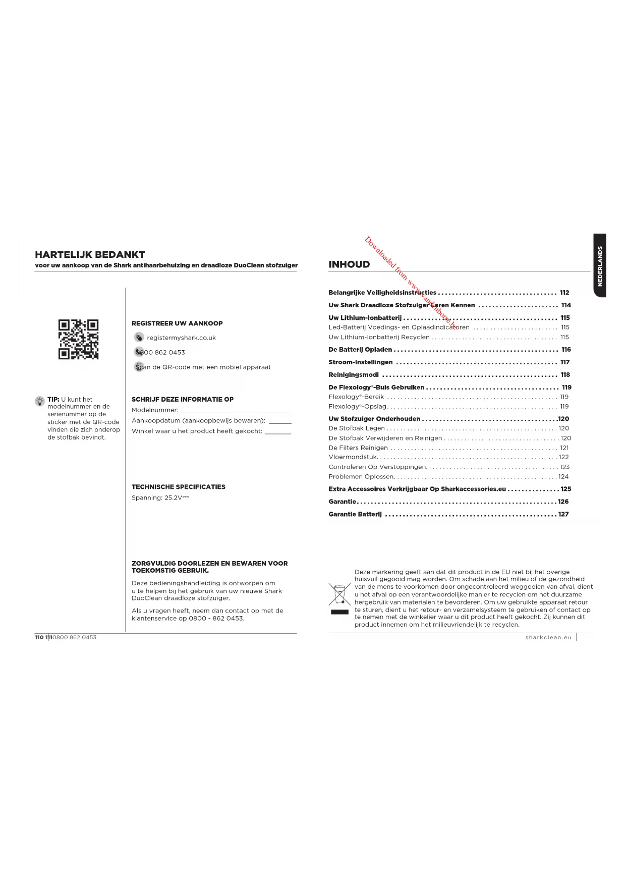 TOEKOMSTIG GEBRUIK. Deze bedieningshandleiding is ontworpen om ute helpen bij het gebruik van uw nieuwe Shark DuoClean draadloze stofzuiger. Als u vragen heeft, neem dan contact op met de klantenservice op 0800 - 862 0453. TECHNISCHE SPECIFICATIES Spanning: 25.2V TIP: U kunt het modelnummer en de serienummer op de sticker met de QR-code vinden die zich onderop de stofbak bevindt.