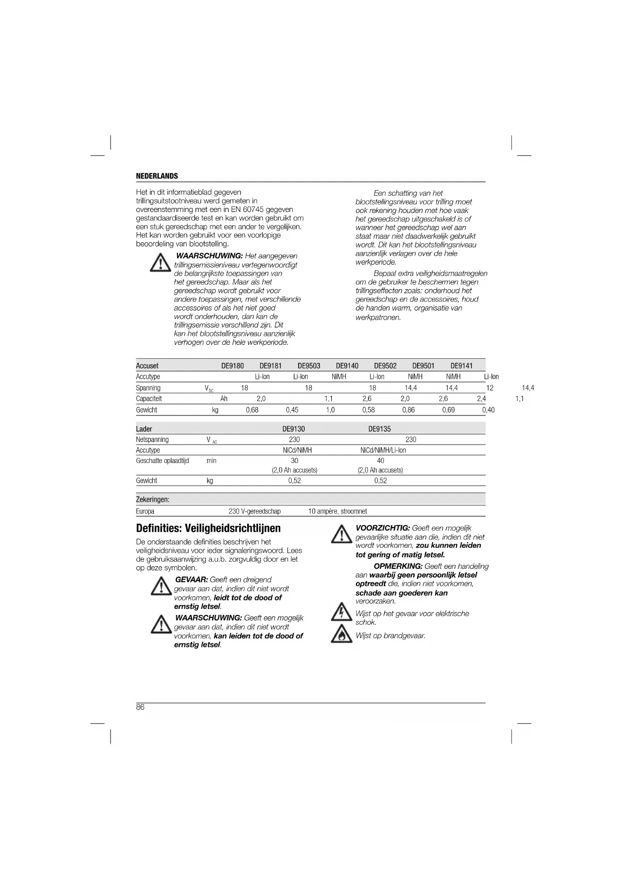 Accutype NiCd/NiMH NiCd/NiMH/Li-Ion Geschatte oplaadtijd min 30 40 (2,0 Ah accusets) (2,0 Ah accusets) Gewicht kg 0,52 0,52 Zekeringen: Europa 230 V-gereedschap 10 ampère, stroomnet Defi nities: Veiligheidsrichtlijnen De onderstaande definities beschrijven het veiligheidsniveau voor ieder signaleringswoord. Lees de gebruiksaanwijzing a.u.b. zorgvuldig door en let op deze symbolen. GEVAAR: Geeft een dreigend gevaar aan dat, indien dit niet wordt voorkomen, leidt tot de dood of ernstig letsel. WAARSCHUWING: Geeft een mogelijk gevaar aan dat, indien dit niet wordt voorkomen, kan leiden tot de dood of ernstig letsel. VOORZICHTIG: Geeft een mogelijk gevaarlijke situatie aan die, indien dit niet wordt voorkomen, zou kunnen leiden tot gering of matig letsel. OPMERKING: Geeft een handeling aan waarbij geen persoonlijk letsel optreedt die, indien niet voorkomen, schade aan goederen kan veroorzaken. Wijst op het gevaar voor elektrische schok. Wijst op brandgevaar.NEDERLANDS