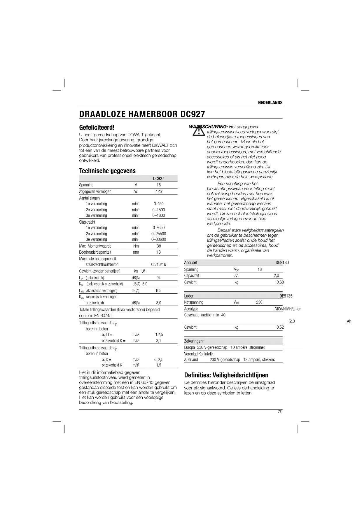 Accutype NiCd/NiMH/Li-Ion Geschatte laadtijd min 40 (2,0 Ah accusets) Gewicht kg 0,52 Zekeringen: Europa 230 V-gereedschap 10 ampère, stroomnet Verenigd Koninkrijk & Ierland 230 V-gereedschap 13 ampère, stekkers Defi nities: Veiligheidsrichtlijnen De definities hieronder beschrijven de ernstgraad voor elk signaalwoord. Gelieve de handleiding te lezen en op deze symbolen te letten. Gefeliciteerd! U heeft gereedschap van DEWALT gekocht. Door haar jarenlange ervaring, grondige productontwikkeling en innovatie heeft D EWALT zich tot één van de meest betrouwbare partners voor gebruikers van professioneel elektrisch gereedschap ontwikkeld. Technische gegevens DC927 Spanning V 18 Afgegeven vermogen W 425 Aantal slagen 1e versnelling min