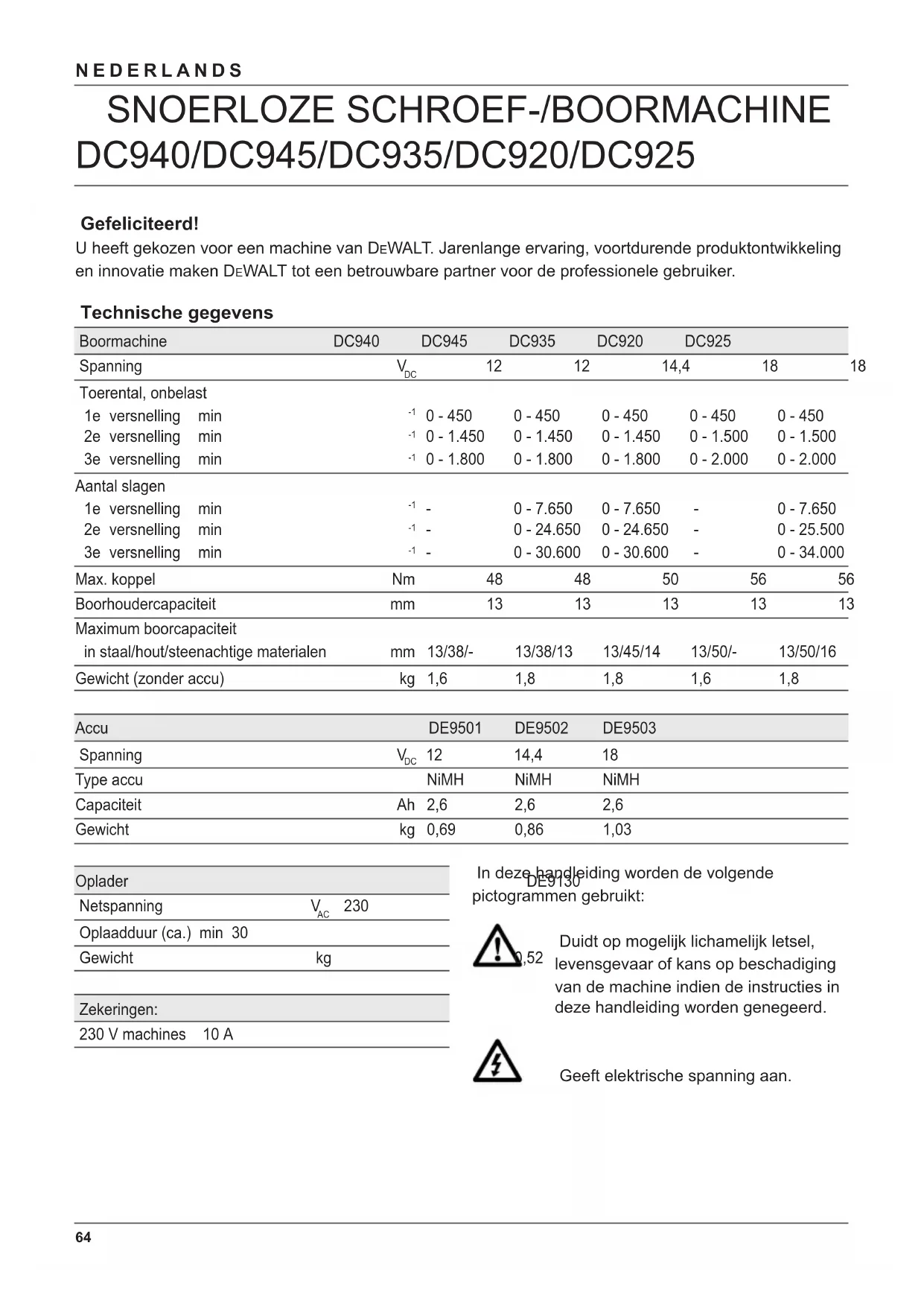 de maximum snoerlengte is 30 m. Monteren en instellen ● Verwijder vóór het monteren en instellen altijd de accu uit de machine. ● Schakel de machine altijd uit alvorens de accu aan te brengen of te verwijderen. Gebruik uitsluitend D E WALT-accu's en -opladers. Accu (fi g. A & B) Opladen (fi g. A) Als u de accu voor de eerste keer of na langdurige opslag oplaadt, zal deze slechts voor ca. 80% worden opgeladen. Na een aantal laad- en ontlaad- cycli wordt de accu echter compleet opgeladen. Controleer altijd de netspanning, voordat u de accu oplaadt. Als de netspanning normaal aanwezig is, maar de accu niet wordt opgeladen, breng dan uw oplader naar een erkend D E WALT Service-center. Tijdens het opladen kunnen oplader en accu warm aanvoelen. Dit is normaal en duidt niet op een defect. Laad de accu niet op bij omgevingstemperaturen <4 °C of >40 °C. Aanbevolen oplaadtemperatuur: ca. 24 °C. ● Plaats de accu (10) in de oplader (12) zoals afgebeeld en steek de stekker van de oplader in het contact. Let erop dat de accu goed in de oplader zit. De rode oplaad-indicatie (13) begint te knipperen. ● Na het opladen stopt de oplaad-indicatie met knipperen en brandt continu. De accu is nu volledig opgeladen. ● De accu kan op ieder gewenst moment uit de oplader worden gehaald of voor een langere tijd in de op het net aangesloten oplader blijven zitten (maximaal 14 dagen). Plaatsen en verwijderen van de accu ● Duw de accu in de greep totdat de accu vastklikt. ● Verwijder de accu door het tegelijkertijd indrukken van de twee vergrendelknoppen (11). Trek dan de accu uit de greep. Accu-afdekdop (fi g. B) De meegeleverde afdekdop wordt gebruikt om de contactpunten van de losse accu te beschermen. Zonder de afdekdop kunnen de contactpunten worden kortgesloten door rondslingerende metalen voorwerpen, waardoor brandgevaar ontstaat en de accu beschadigd raakt.70 NEDERLANDS ● Neem de afdekdop (14) af voordat u de accu (10) in de lader of de machine plaatst. ● Plaats de afdekdop over de contactpunten meteen nadat de accu uit de lader of machine is genomen. Zorg dat de afdekdop op zijn plaats zit voodat u een losse accu opbergt of transporteert. Automatische regeneratie In de automatische regeneratiestand worden de individuele cellen in de accu gecompenseerd of gebalanceerd op de maximale capaciteit van de accu. Accu's worden iedere nacht geregenereerd of na iedere 10de laad/ ontlaad-cyclus of wanneer de accu niet meer dezelfde prestatie levert. ● Voor het regenereren van uw accu plaatst u de accu in de oplader. Het rode lampje zal continu gaan knipperen om aan te geven dat de laadcyclus is begonnen. ● Na de laadcyclus, zal het lampje continu branden en niet langer knipperen. De accu is volledig opgeladen en is klaar voor gebruik. ● Als de accu in de oplader blijft zitten, start de oplader automatisch de regeneratiefunctie op. Deze functie duurt maximaal 8 uur, maar de accu kan op ieder willekeurig moment tijdens de regeneratiefunctie worden verwijderd. Vertraagd opladen van hete/koude accu's Wanneer een te hete of te koude accu in de oplader wordt geplaatst, wordt het oplaadproces automatisch uitgesteld. Als de accu een geschikte temperatuur heeft bereikt, schakelt de oplader automatisch over naar de laadstand. Hierdoor wordt een lange levensduur van de accu gegarandeerd. De rode oplaad-indicatie (13) knippert langzaam; gedurende de vertragingstijd knippert de indicatie snel. Plaatsen en verwijderen van een boortje of schroevendraaierbit (fi g. A & C) ● Open de boorhouder door de kraag (15) linksom te draaien en plaats het boortje of de schroevedraaierbit. ● Plaats het boortje of de schroevedraaierbit zo ver mogelijk in de boorhouder. Trek het boortje of de bit daarna iets terug. ● Klem het boortje of de bit stevig vast door de kraag rechtsom te draaien. ● Ga voor het verwijderen van het boortje in omgekeerde volgorde te werk. Kiezen van de boorstand of instellen van het koppel (fi g. D) De instelring kent een groot aantal verschillende posities voor het afstemmen van het koppel op de gebruikte schroeven en het materiaal van het werkstuk. Voor instelling van het koppel, zie "In- en uitdraaien van schroeven". ● Kies de gewenste boorstand of het juiste koppel door de instelring (4) te verdraaien tot het betreffende symbool of positienummer recht tegenover de indicatie (16) op het motorhuis staat. DC945/DC935/DC925 Deze machines kunnen worden gebruikt in de volgende functies: Boren: boren in staal, hout en kunststoffen Klopboren: boren in steen en beton L/R-schakelaar (fi g. E) ● Selecteer de draairichting (linksom of rechtsom) door het verschuiven van de L/R-schakelaar (2), zoals afgebeeld (zie de pijlen op de machine). Wijzig de draairichting uitsluitend als de machine volledig stilstaat. Mechanische toerenomschakelaar (fi g. F) Uw machine is uitgerust met een mechanische toerenomschakelaar (6) waarmee de verhouding tussen toerental en koppel kan worden gewijzigd.71 NEDERLANDS 1 lage snelheid/hoog koppel 2 middelhoge snelheid/middelhoog koppel 3 hoge snelheid/laag koppel Meer informatie over de toerentallen vindt u in de technische gegevens. Verdraai de schakelaar niet bij volle belasting of tijdens het gebruik. Aanwijzingen voor gebruik ● Neem altijd de veiligheidsinstructies in acht en houdt u aan de geldende voorschriften ● Let op de eventueel aanwezige gas-, water- en elektriciteitsleidingen. ● Forceer de machine niet. Overmatige druk op de machine versnelt het boren niet maar resulteert juist in slechtere prestaties en voortijdige slijtage van de machine. Voor gebruik: ● Zorg dat de accu (helemaal) is opgeladen. ● Zorg dat de accu goed op de plaats zit. ● Plaats het juiste boortje. ● Markeer de plaats waar het gat moet worden geboord. In- en uitschakelen (fi g. A & E) ● Druk op de schakelaar (1) om de machine te starten. Het toerental van de machine wordt bepaald door de druk die op de schakelaar wordt uitgeoefend. ● Stop de machine door de schakelaar l