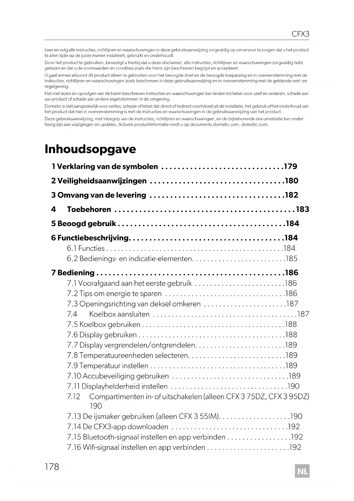 - Lees en volg alle instructies, richtlijnen en waarschuwingen in deze gebruiksaanwijzing zorgvuldig op om ervoor te zorgen dat u het product te allen tijde op de juiste manier installeert, gebruikt en onderhoudt. Door het product te gebruiken, bevestigt u hierbij dat u deze disclaimer, alle instructies, richtlijnen en waarschuwingen zorgvuldig hebt gelezen en dat u de voorwaarden en condities zoals die hierin zijn beschreven begrijpt en accepteert. U gaat ermee akkoord dit product alleen te gebruiken voor het beoogde doel en de beoogde toepassing en in overeenstemming met de instructies, richtlijnen en waarschuwingen zoals beschreven in deze gebruiksaanwijzing en in overeenstemming met de geldende wet- en regelgeving. Het niet lezen en opvolgen van de hierin beschreven instructies en waarschuwingen kan leiden tot letsel voor uzelf en anderen, schade aan uw product of schade aan andere eigendommen in de omgeving. Dometic is niet aansprakelijk voor verlies, schade of letsel dat direct of indirect voortvloeit uit de installatie, het gebruik of het onderhoud van het product dat niet in overeenstemming is met de instructies en waarschuwingen in de gebruiksaanwijzing van het product. Deze gebruiksaanwijzing, met inbegrip van de instructies, richtlijnen en waarschuwingen, en de bijbehorende documentatie kan onder- hevig zijn aan wijzigingen en updates. Actuele productinformatie vindt u op documents.dometic.com, dometic.com. Inhoudsopgave 1 Verklaring van de symbolen p. 179