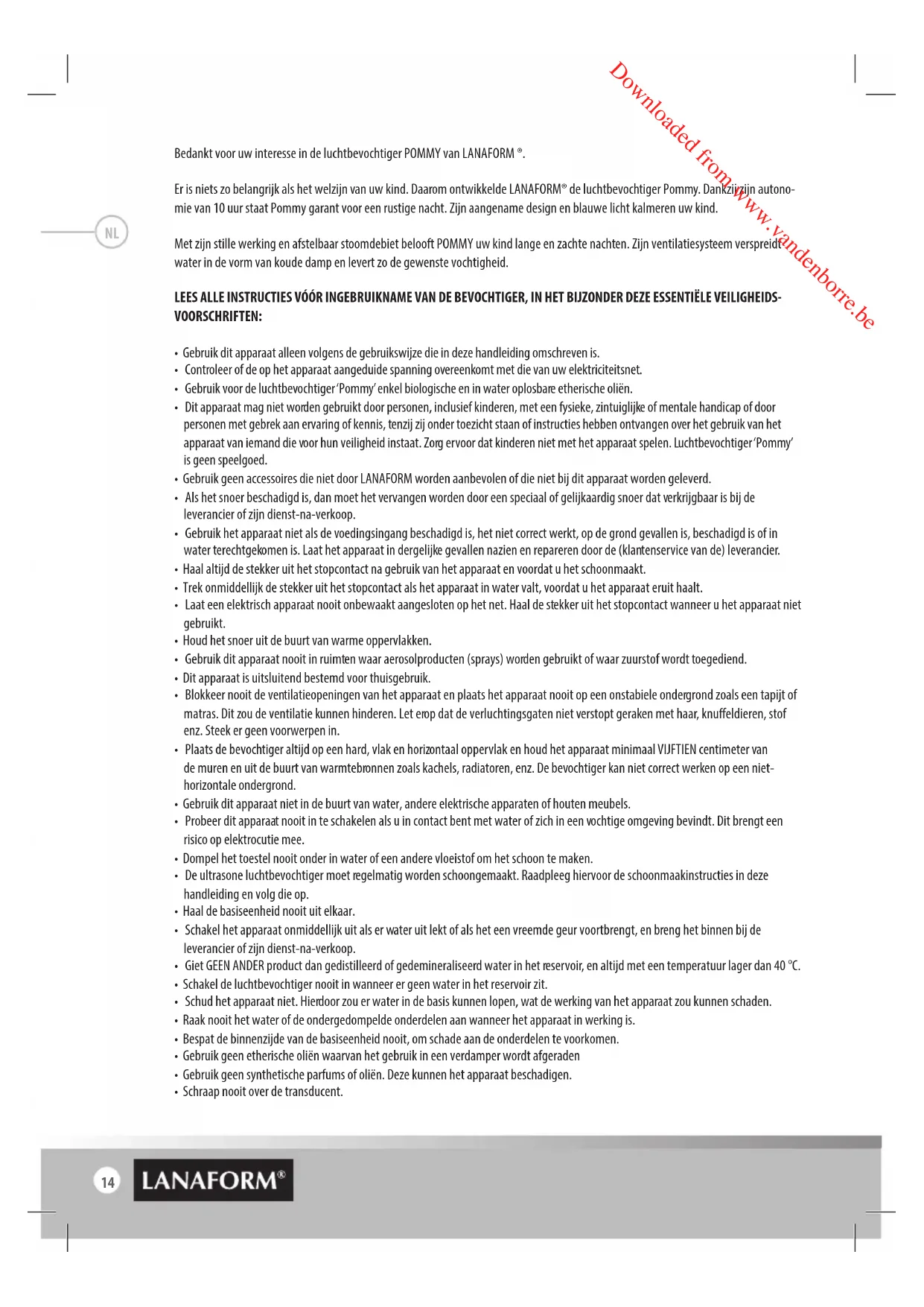 Downloaded from www.vandenborre.be14 Bedankt voor uw interesse in de luchtbevochtiger POMMY van LANAFORM ®. Er is niets zo belangrijk als het welzijn van uw kind. Daarom ontwikkelde LANAFORM® de luchtbevochtiger Pommy. Dankzij zijn autono- mie van 10 uur staat Pommy garant voor een rustige nacht. Zijn aangename design en blauwe licht kalmeren uw kind. Met zijn stille werking en afstelbaar stoomdebiet belooft POMMY uw kind lange en zachte nachten. Zijn ventilatiesysteem verspreidt water in de vorm van koude damp en levert zo de gewenste vochtigheid. LEES ALLE INSTRUCTIES VÓÓR INGEBRUIKNAME VAN DE BEVOCHTIGER, IN HET BIJZONDER DEZE ESSENTIËLE VEILIGHEIDS- VOORSCHRIFTEN: