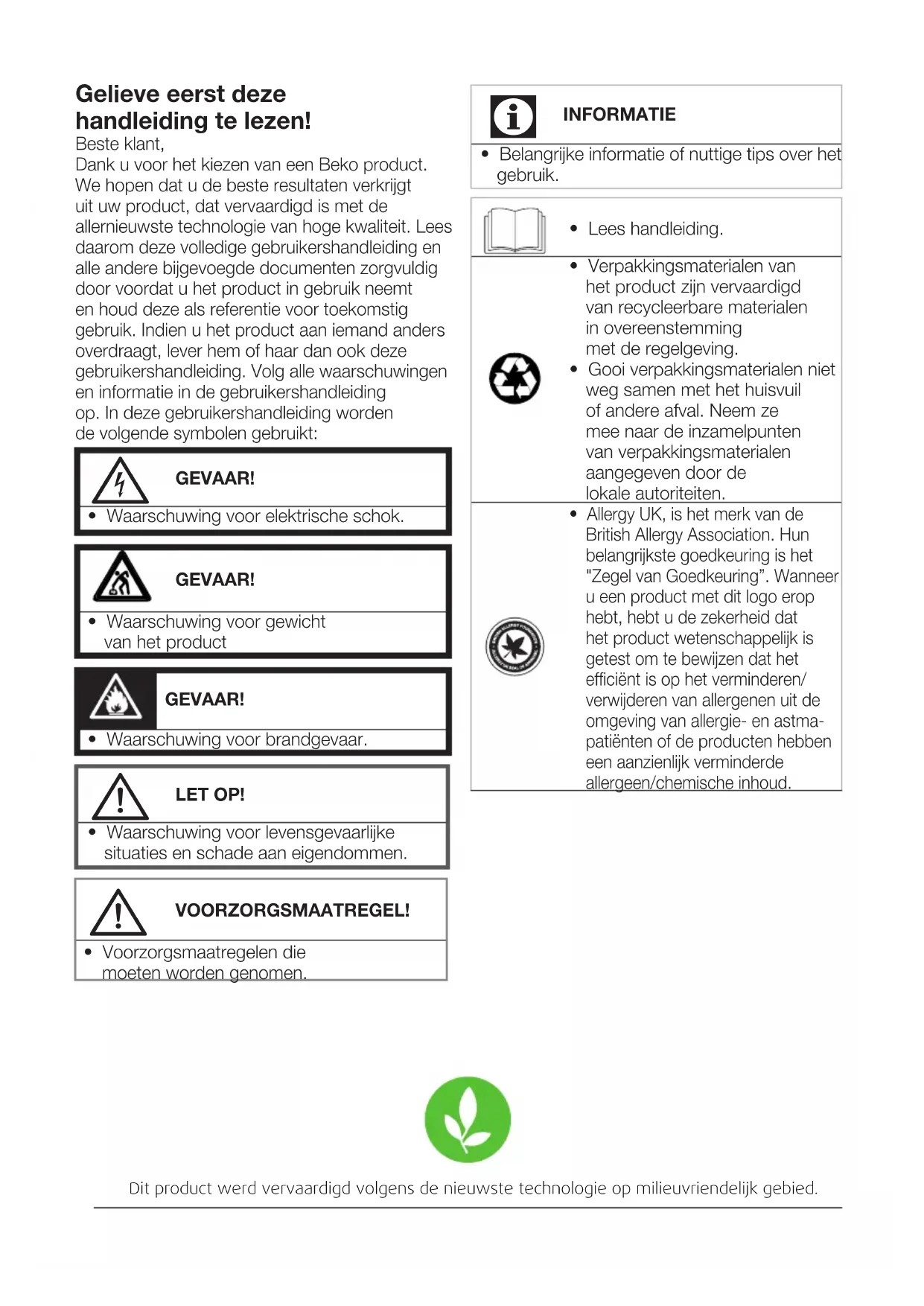 - Allergy UK, is het merk van de British Allergy Association. Hun belangrijkste goedkeuring is het "Zegel van Goedkeuring”. Wanneer u een product met dit logo erop hebt, hebt u de zekerheid dat het product wetenschappelijk is getest om te bewijzen dat het efficiënt is op het verminderen/ verwijderen van allergenen uit de omgeving van allergie- en astma- patiënten of de producten hebben een aanzienlijk verminderde allergeen/chemische inhoud.47 / NLWasdroogcombinatie / Gebruiker Handleiding 1 Belangrijke instructies voor veiligheid en milieu Dit hoofdstuk bevat veiligheidsinstructies die helpen beschermen tegen het risico van persoonlijk letsel of materiële schade. Indien deze instructies niet worden opgevolgd, vervalt de garantie.