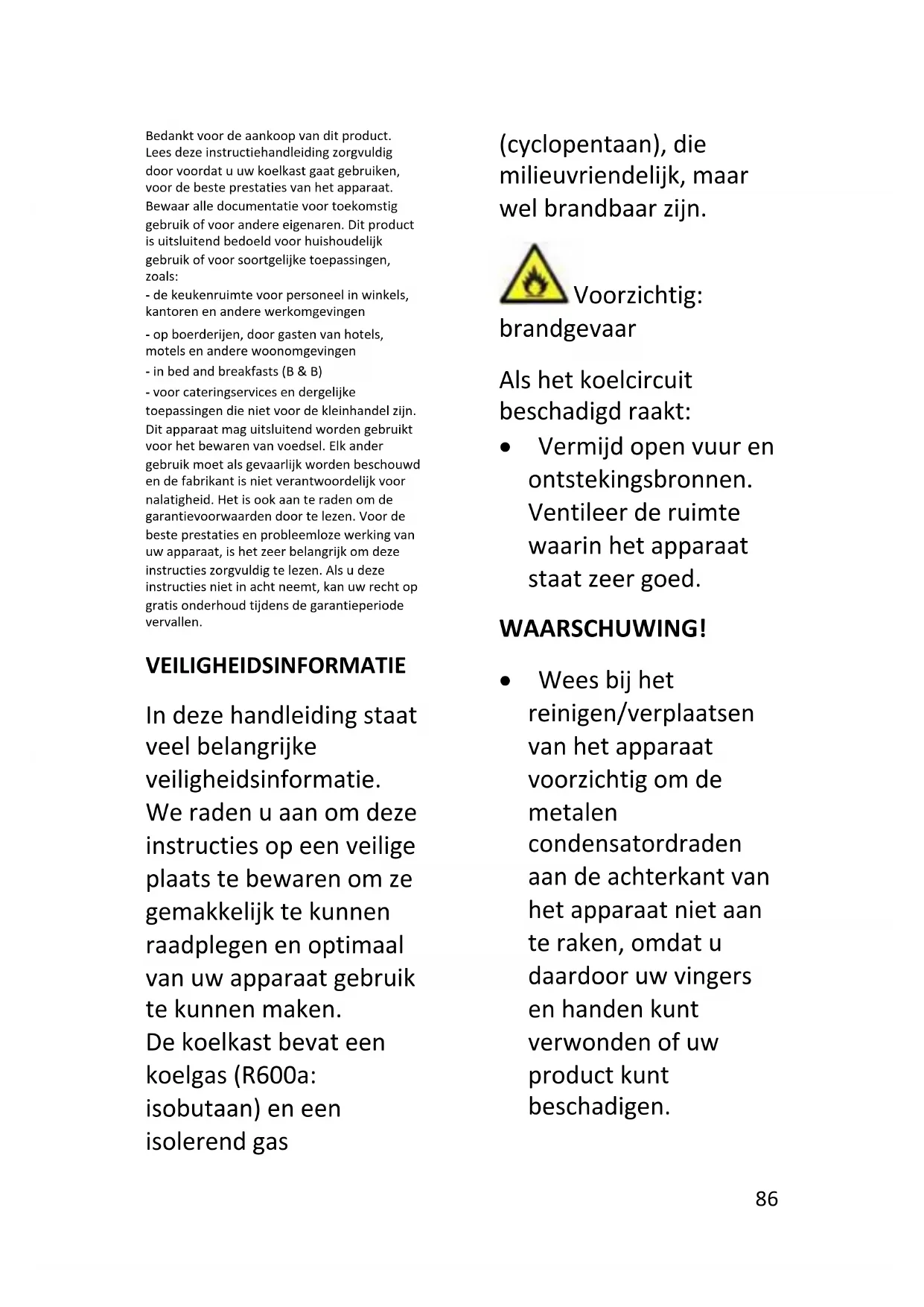 - Remova o pó presente na traseira do aparelho.86 Bedankt voor de aankoop van dit product. Lees deze instructiehandleiding zorgvuldig door voordat u uw koelkast gaat gebruiken, voor de beste prestaties van het apparaat. Bewaar alle documentatie voor toekomstig gebruik of voor andere eigenaren. Dit product is uitsluitend bedoeld voor huishoudelijk gebruik of voor soortgelijke toepassingen, zoals: - de keukenruimte voor personeel in winkels, kantoren en andere werkomgevingen - op boerderijen, door gasten van hotels, motels en andere woonomgevingen - in bed and breakfasts (B & B) - voor cateringservices en dergelijke toepassingen die niet voor de kleinhandel zijn. Dit apparaat mag uitsluitend worden gebruikt voor het bewaren van voedsel. Elk ander gebruik moet als gevaarlijk worden beschouwd en de fabrikant is niet verantwoordelijk voor nalatigheid. Het is ook aan te raden om de garantievoorwaarden door te lezen. Voor de beste prestaties en probleemloze werking van uw apparaat, is het zeer belangrijk om deze instructies zorgvuldig te lezen. Als u deze instructies niet in acht neemt, kan uw recht op gratis onderhoud tijdens de garantieperiode vervallen. VEILIGHEIDSINFORMATIE In deze handleiding staat veel belangrijke veiligheidsinformatie. We raden u aan om deze instructies op een veilige plaats te bewaren om ze gemakkelijk te kunnen raadplegen en optimaal van uw apparaat gebruik te kunnen maken. De koelkast bevat een koelgas (R600a: isobutaan) en een isolerend gas (cyclopentaan), die milieuvriendelijk, maar wel brandbaar zijn. Voorzichtig: brandgevaar Als het koelcircuit beschadigd raakt: