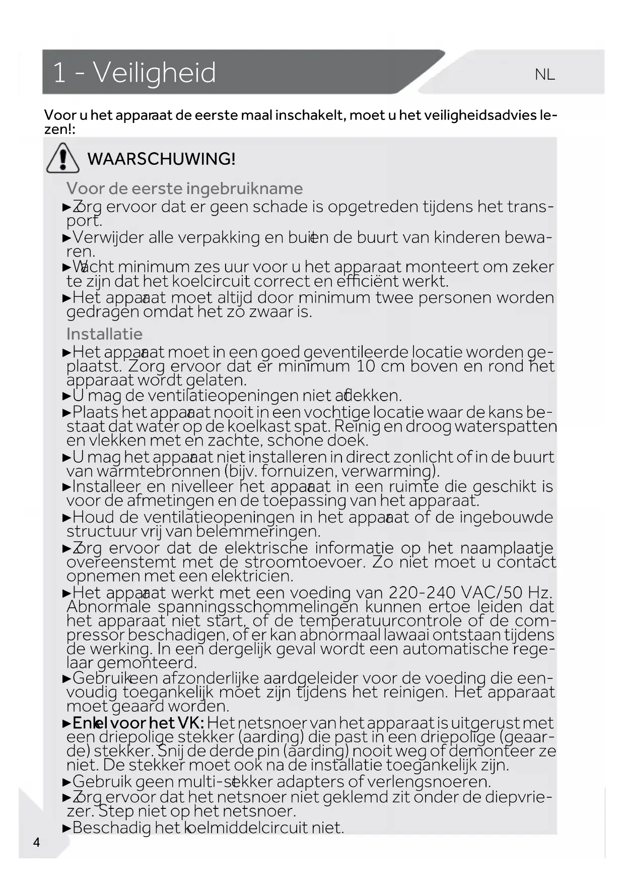 AARSCHUWING! Voor de eerste ingebruikname ▶ Z org ervoor dat er geen schade is opgetreden tijdens het trans- port. ▶ Verwijder alle verpakking en buit en de buurt van kinderen bewa- ren. ▶ W acht minimum zes uur voor u het apparaat monteert om zeker te zijn dat het koelcircuit correct en eciënt werkt. ▶ Het appar aat moet altijd door minimum twee personen worden gedragen omdat het zo zwaar is. Installatie ▶ Het appar aat moet in een goed geventileerde locatie worden ge- plaatst. Zorg ervoor dat er minimum 10 cm boven en rond het apparaat wordt gelaten. ▶ U mag de ventilatieopeningen niet af dekken. ▶ Plaats het appar aat nooit in een vochtige locatie waar de kans be- staat dat water op de koelkast spat. Reinig en droog waterspatten en vlekken met en zachte, schone doek. ▶ U mag het appar aat niet installeren in direct zonlicht of in de buurt van warmtebronnen (bijv. fornuizen, verwarming). ▶ Installeer en nivelleer het appar aat in een ruimte die geschikt is voor de afmetingen en de toepassing van het apparaat. ▶ Houd de ventilatieopeningen in het appar aat of de ingebouwde structuur vrij van belemmeringen. ▶ Z org ervoor dat de elektrische informatie op het naamplaatje overeenstemt met de stroomtoevoer. Zo niet moet u contact opnemen met een elektricien. ▶ Het appar aat werkt met een voeding van 220-240 VAC/50 Hz. Abnormale spanningsschommelingen kunnen ertoe leiden dat het apparaat niet start, of de temperatuurcontrole of de com- pressor beschadigen, of er kan abnormaal lawaai ontstaan tijdens de werking. In een dergelijk geval wordt een automatische rege- laar gemonteerd. ▶ Gebruik een afzonderlijke aardgeleider voor de voeding die een- voudig toegankelijk moet zijn tijdens het reinigen. Het apparaat moet geaard worden. ▶ Enk el voor het VK: Het netsnoer van het apparaat is uitgerust met een driepolige stekker (aarding) die past in een driepolige (geaar- de) stekker. Snij de derde pin (aarding) nooit weg of demonteer ze niet. De stekker moet ook na de installatie toegankelijk zijn. ▶ Gebruik geen multi-st ekker adapters of verlengsnoeren. ▶ Z org ervoor dat het netsnoer niet geklemd zit onder de diepvrie- zer. Step niet op het netsnoer. ▶ Beschadig het k oelmiddelcircuit niet.