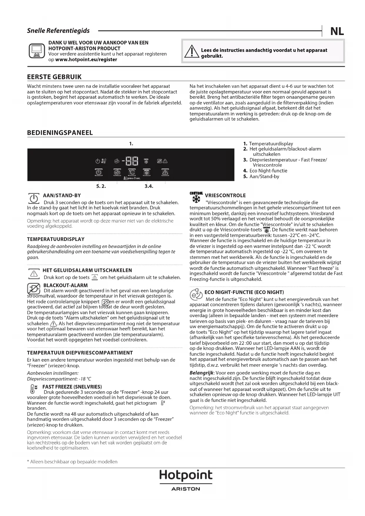 - Disponible sur certains modèles uniquement FRNL Snelle Referentiegids DANK U WEL VOOR UW AANKOOP VAN EEN HOTPOINT-ARISTON PRODUCT Voor verdere assistentie kunt u het apparaat registeren op www.hotpoint.eu/register Lees de instructies aandachtig voordat u het apparaat gebruikt. EERSTE GEBRUIK Wacht minstens twee uren na de installatie vooraleer het apparaat aan te sluiten op het stopcontact. Nadat de stekker in het stopcontact is gestoken, begint het apparaat automatisch te werken. De ideale opslagtemperaturen voor etenswaar zijn vooraf in de fabriek afgesteld. Na het inschakelen van het apparaat dient u 4-6 uur te wachten tot de juiste opslagtemperatuur voor een normaal gevuld apparaat is bereikt. Breng het antibacteriële lter tegen onaangename geuren op de ventilator aan, zoals aangeduid in de lterverpakking (indien aanwezig). Als het geluidssignaal afgaat, betekent dit dat het temperatuuralarm in werking is getreden: druk op de knop om de geluidsalarmen uit te schakelen. BEDIENINGSPANEEL