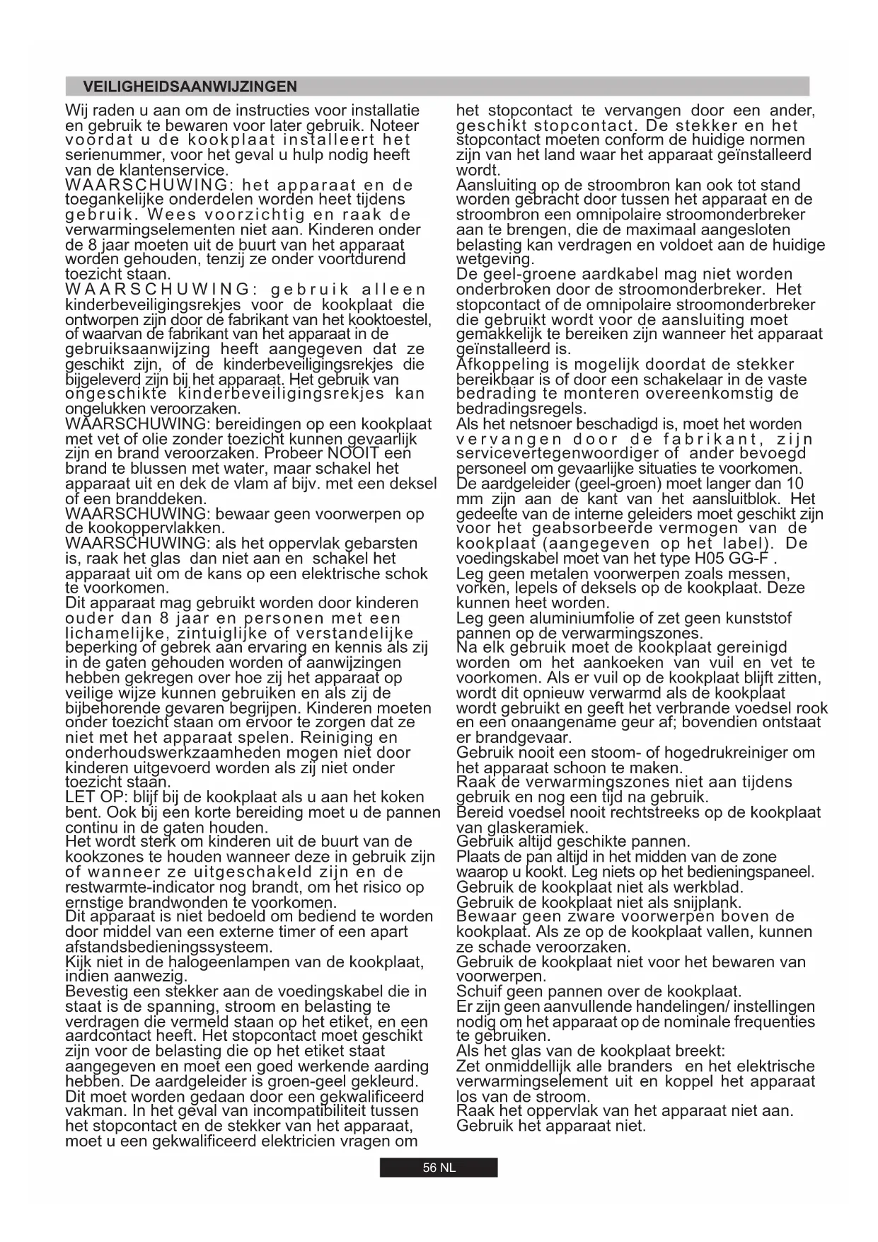 Înainte de a curăţa plita, lăsaţi-o să se răcească. Scoateţi ştecherul din priză sau (dacă este conexiune directă) deconectaţi aparatul de la sursa de alimentare cu energie. Nu permiteţi copiilor să realizeze operaţiuni de curăţare şi întreţinere, fără supravegherea unui adult. Pentru curăţarea suprafeţelor din email, lăcuite sau cromate, utilizaţi o soluţie de apă şi detergent lichid sau un detergent care să nu fie caustic. Pentru suprafeţele din inox, utiilzaţi o soluţie specială pentru curăţarea inoxului. Arzătoarele pot fi spălate cu o soluţie de apă cu detergent lichid. Pentru a le reda strălucirea originală, puteţi utiliza o soluţie specială pentru curăţarea suprafeţelor din inox. După curăţare, ştergeţi bine arzătoarele şi aşezaţi-le la loc. Arzătoarele şi suporturile cromate au tendinţa de a se decolora in timp. Acest fapt nu va influenţa performanţeledeutilizare ale plitei. Este foarte important ca arzătoarele săfieaşezate corect. Pentru piese de schimb, vă rugăm să luaţi legătura cu centrele de service autorizate. Arzătoare şi suporturi cromate Nu utilizaţi substanţe abrazive, detergenţi corozivi, agenţi de înnălbire sau substanţe acide. Nu aplicaţi substanţe alcaline sau acide (suc de lămâie, oţet etc.) pe suprafeţel emailate, lăcuite sau din inox.e56 NL Dit apparaat is niet bedoeld om bediend te worden door middel van een externe timer of een apart afstandsbedieningssysteem. WAARSCHUWING: het apparaat en de toegankelijke onderdelen worden heet tijdens gebruik. Wees voorzichtig en raak de verwarmingselementen niet aan. Kinderen onder de 8 jaar moeten uit de buurt van het apparaat worden gehouden, tenzij ze onder voortdurend toezicht staan. Kijk niet in de halogeenlampen van de kookplaat, indien aanwezig. WAARSCHUWING: bereidingen op een kookplaat met vet of olie zonder toezicht kunnen gevaarlijk zijn en brand veroorzaken. Probeer NOOIT een brand te blussen met water, maar schakel het apparaat uit en dek de vlam af bijv. met een deksel of een branddeken. Bevestig een stekker aan de voedingskabel die in staat is de spanning, stroom en belasting te verdragen die vermeld staan op het etiket, en een aardcontact heeft. Het stopcontact moet geschikt zijn voor de belasting die op het etiket staat aangegeven en moet een goed werkende aarding hebben. De aardgeleider is groen-geel gekleurd. Dit moet worden gedaan door een gekwalificeerd vakman. In het geval van incompatibiliteit tussen het stopcontact en de stekker van het apparaat, moet u een gekwalificeerd elektricien vragen om WAARSCHUWING: bewaar geen voorwerpen op de kookoppervlakken. Wij raden u aan om de instructies voor installatie en gebruik te bewaren voor later gebruik. Noteer voordat u de kookplaat installeert het serienummer, voor het geval u hulp nodig heeft van de klantenservice. Dit apparaat mag gebruikt worden door kinderen ouder dan 8 jaar en personen met een lichamelijke, zintuiglijke of verstandelijke beperking of gebrek aan ervaring en kennis als zij in de gaten gehouden worden of aanwijzingen hebben gekregen over hoe zij het apparaat op veilige wijze kunnen gebruiken en als zij de bijbehorende gevaren begrijpen. Kinderen moeten onder toezicht staan om ervoor te zorgen dat ze niet met het apparaat spelen. Reiniging en onderhoudswerkzaamheden mogen niet door kinderen uitgevoerd worden als zij niet onder toezicht staan. Het wordt sterk om kinderen uit de buurt van de kookzones te houden wanneer deze in gebruik zijn of wanneer ze uitgeschakeld zijn en de restwarmte-indicator nog brandt, om het risico op ernstige brandwonden te voorkomen. WAARSCHUWING: als het oppervlak gebarsten is, raak het glas dan niet aan en schakel het apparaat uit om de kans op een elektrische schok te voorkomen. WAARSCHUWING: gebruik alleen kinderbeveiligingsrekjes voor de kookplaat die ontworpen zijn door de fabrikant van het kooktoestel, of waarvan de fabrikant van het apparaat in de gebruiksaanwijzing heeft aangegeven dat ze geschikt zijn, of de kinderbeveiligingsrekjes die bijgeleverd zijn bij het apparaat. Het gebruik van ongeschikte kinderbeveiligingsrekjes kan ongelukken veroorzaken. LET OP: blijf bij de kookplaat als u aan het koken bent. Ook bij een korte bereiding moet u de pannen continu in de gaten houden. VEILIGHEIDSAANWIJZINGEN Er zjn geen aanvullende handelngen/ nstellngen nodg om het apparaat op de nomnale frequentes te gebruken. Gebruik de kookplaat niet voor het bewaren van voorwerpen. Schuif geen pannen over de kookplaat. Zet onmddelljk alle branders en het elektrsche verwarmngselement ut en koppel het apparaat los van de stroom. het stopcontact te vervangen door een ander, geschikt stopcontact. De stekker en het stopcontact moeten conform de huidige normen zijn van het land waar het apparaat geïnstalleerd wordt. Als het netsnoer beschadigd is, moet het worden vervangen door de fabrikant, zijn servicevertegenwoordiger of ander bevoegd personeel om gevaarlijke situaties te voorkomen. De aardgeleider (geel-groen) moet langer dan 10 mm zijn aan de kant van het aansluitblok. Het gedeelte van de interne geleiders moet geschikt zijn voor het geabsorbeerde vermogen van de kookplaat (aangegeven op het label). De voedingskabel moet van het type H05 GG-F . Leg geen metalen voorwerpen zoals messen, vorken, lepels of deksels op de kookplaat. Deze kunnen heet worden. Aansluiting op de stroombron kan ook tot stand worden gebracht door tussen het apparaat en de stroombron een omnipolaire stroomonderbreker aan te brengen, die de maximaal aangesloten belasting kan verdragen en voldoet aan de huidige wetgeving. Na elk gebruik moet de kookplaat gereinigd worden om het aankoeken van vuil en vet te voorkomen. Als er vuil op de kookplaat blijft zitten, wordt dit opnieuw verwarmd als de kookplaat wordt gebruikt en geeft het verbrande voedsel rook en een onaangename geur af; bovendien ontstaat er brandgevaar. Gebruik nooit een stoom- of hogedrukreiniger om het ap
