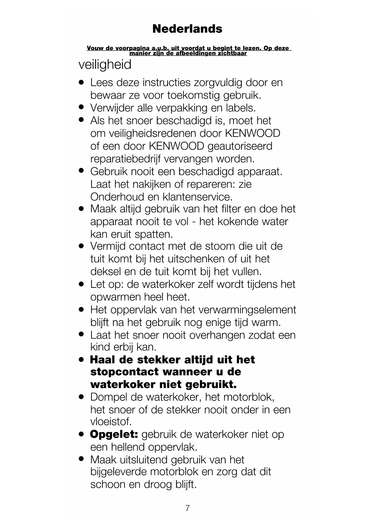 Als u in een gebied met hard water woont, raden wij u aan gefilterd water te gebruiken om ervoor te zorgen dat uw waterkoker efficiënt blijft functioneren en er goed uit blijft zien. Wees zuinig en kook niet meer water dan u nodig heeft. Om de kwaliteit van uw dranken te verbeteren, moet u altijd vers water gebruiken. Personen met verminderde lichamelijke, sensorische of geestelijke capaciteiten of gebrek aan kennis die dit apparaat gebruiken, moeten onder toezicht staan of instructie hebben gekregen over het veilig gebruik van het apparaat en de betrokken zich bewust zijn van de gevaren.