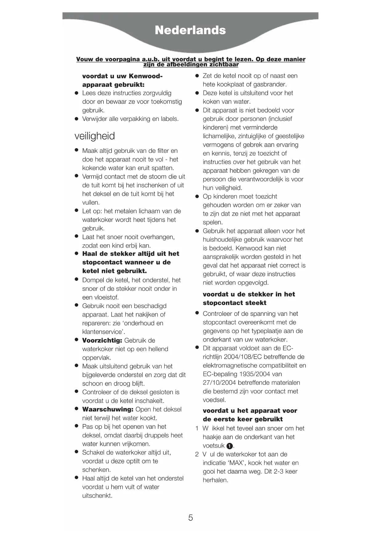 Dit apparaat voldoet aan de EC- richtlijn 2004/108/EC betreffende de elektromagnetische compatibiliteit en EC-bepaling 1935/2004 van 27/10/2004 betreffende materialen die bestemd zijn voor contact met voedsel. voordat u het apparaat voor de eerste keer gebruikt 1Wikkel het teveel aan snoer om het haakje aan de onderkant van het voetsuk . 2Vul de waterkoker tot aan de indicatie ‘MAX’, kook het water en gooi het daarna weg. Dit 2-3 keer herhalen. Nederlands