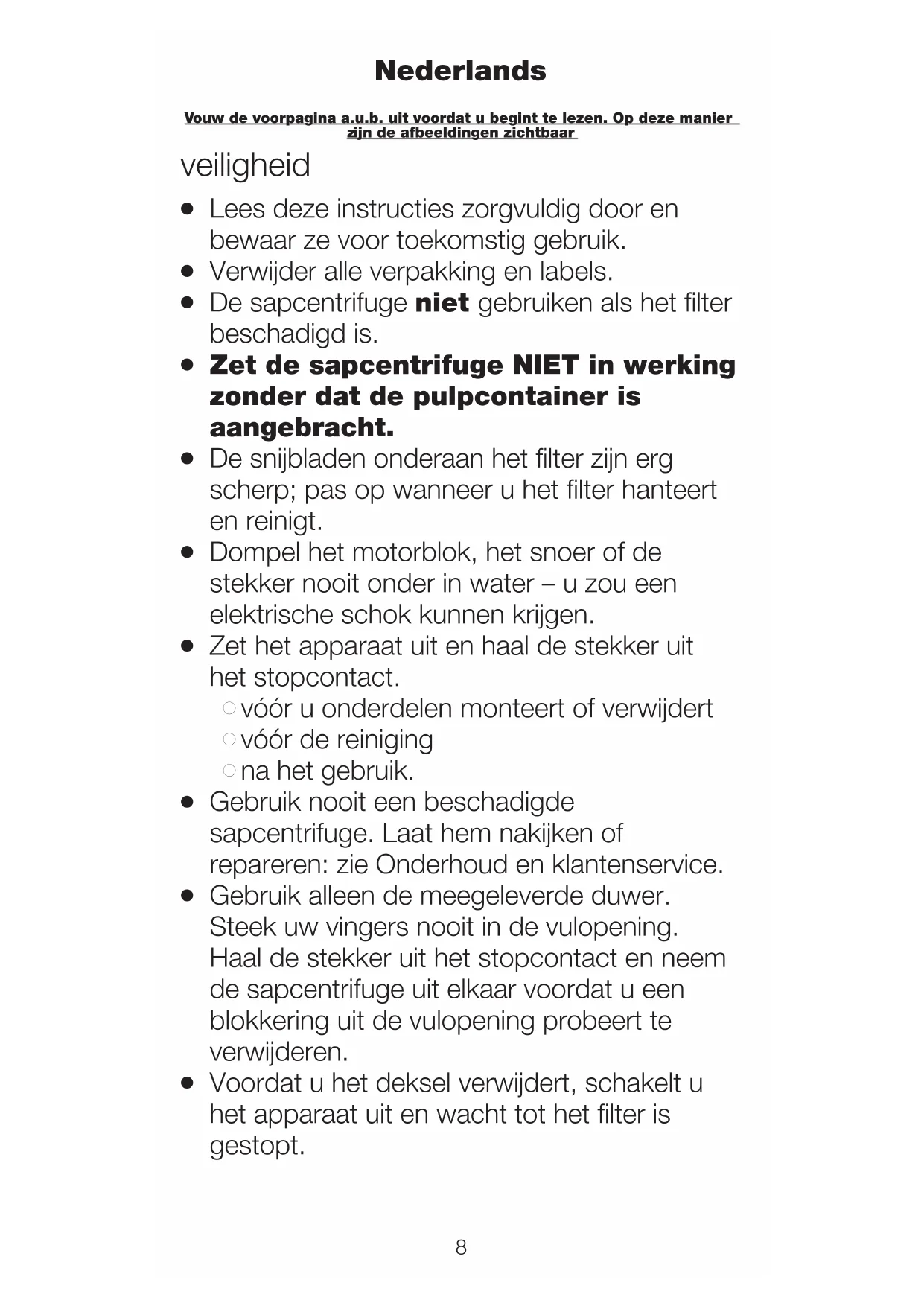 ouw de voorpagina a.u.b. uit voordat u begint te lezen. Op deze manier ijn de afbeeldingen zichtbaar Nederlands● Laat het snoer nooit in aanraking komen met hete oppervlakken en laat het niet naar beneden hangen waar een kind erbij kan.