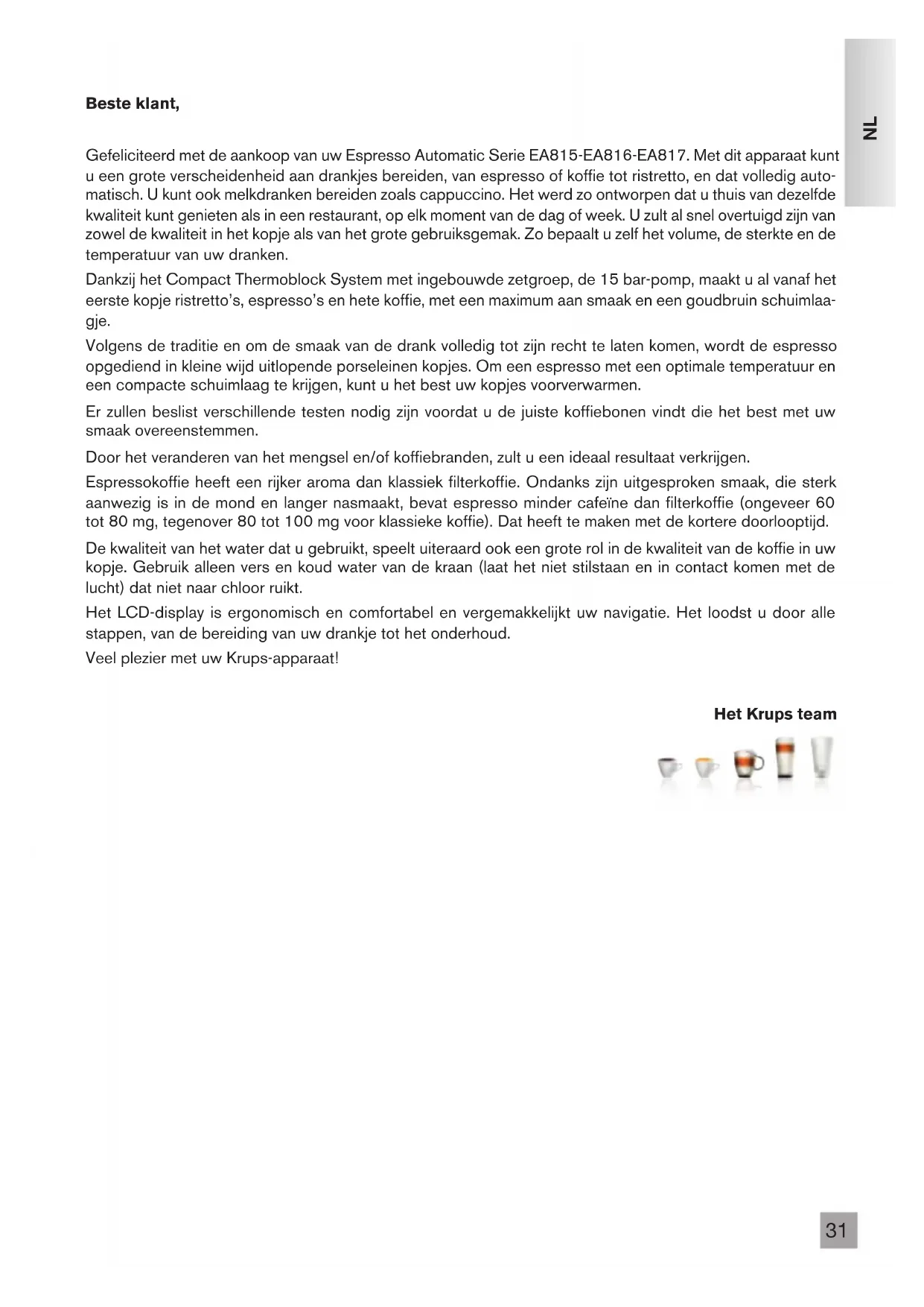 Beste klant, Gefeliciteerd met de aankoop van uw Espresso Automatic Serie EA815-EA816-EA817. Met dit apparaat kunt u een grote verscheidenheid aan drankjes bereiden, van espresso of koffie tot ristretto, en dat volledig auto- matisch. U kunt ook melkdranken bereiden zoals cappuccino. Het werd zo ontworpen dat u thuis van dezelfde kwaliteit kunt genieten als in een restaurant, op elk moment van de dag of week. U zult al snel overtuigd zijn van zowel de kwaliteit in het kopje als van het grote gebruiksgemak. Zo bepaalt u zelf het volume, de sterkte en de temperatuur van uw dranken. Dankzij het Compact Thermoblock System met ingebouwde zetgroep, de 15 bar-pomp, maakt u al vanaf het eerste kopje ristretto’s, espresso’s en hete koffie, met een maximum aan smaak en een goudbruin schuimlaa- gje. Volgens de traditie en om de smaak van de drank volledig tot zijn recht te laten komen, wordt de espresso opgediend in kleine wijd uitlopende porseleinen kopjes. Om een espresso met een optimale temperatuur en een compacte schuimlaag te krijgen, kunt u het best uw kopjes voorverwarmen. Er zullen beslist verschillende testen nodig zijn voordat u de juiste koffiebonen vindt die het best met uw smaak overeenstemmen. Door het veranderen van het mengsel en/of koffiebranden, zult u een ideaal resultaat verkrijgen. Espressokoffie heeft een rijker aroma dan klassiek filterkoffie. Ondanks zijn uitgesproken smaak, die sterk aanwezig is in de mond en langer nasmaakt, bevat espresso minder cafeïne dan filterkoffie (ongeveer 60 tot 80 mg, tegenover 80 tot 100 mg voor klassieke koffie). Dat heeft te maken met de kortere doorlooptijd. De kwaliteit van het water dat u gebruikt, speelt uiteraard ook een grote rol in de kwaliteit van de koffie in uw kopje. Gebruik alleen vers en koud water van de kraan (laat het niet stilstaan en in contact komen met de lucht) dat niet naar chloor ruikt. Het LCD-display is ergonomisch en comfortabel en vergemakkelijkt uw navigatie. Het loodst u door alle stappen, van de bereiding van uw drankje tot het onderhoud. Veel plezier met uw Krups-apparaat! Het Krups team32 TABEL MET DE BETEKENISSEN VAN DE FUNCTIETOETSEN EN -KNOPPEN