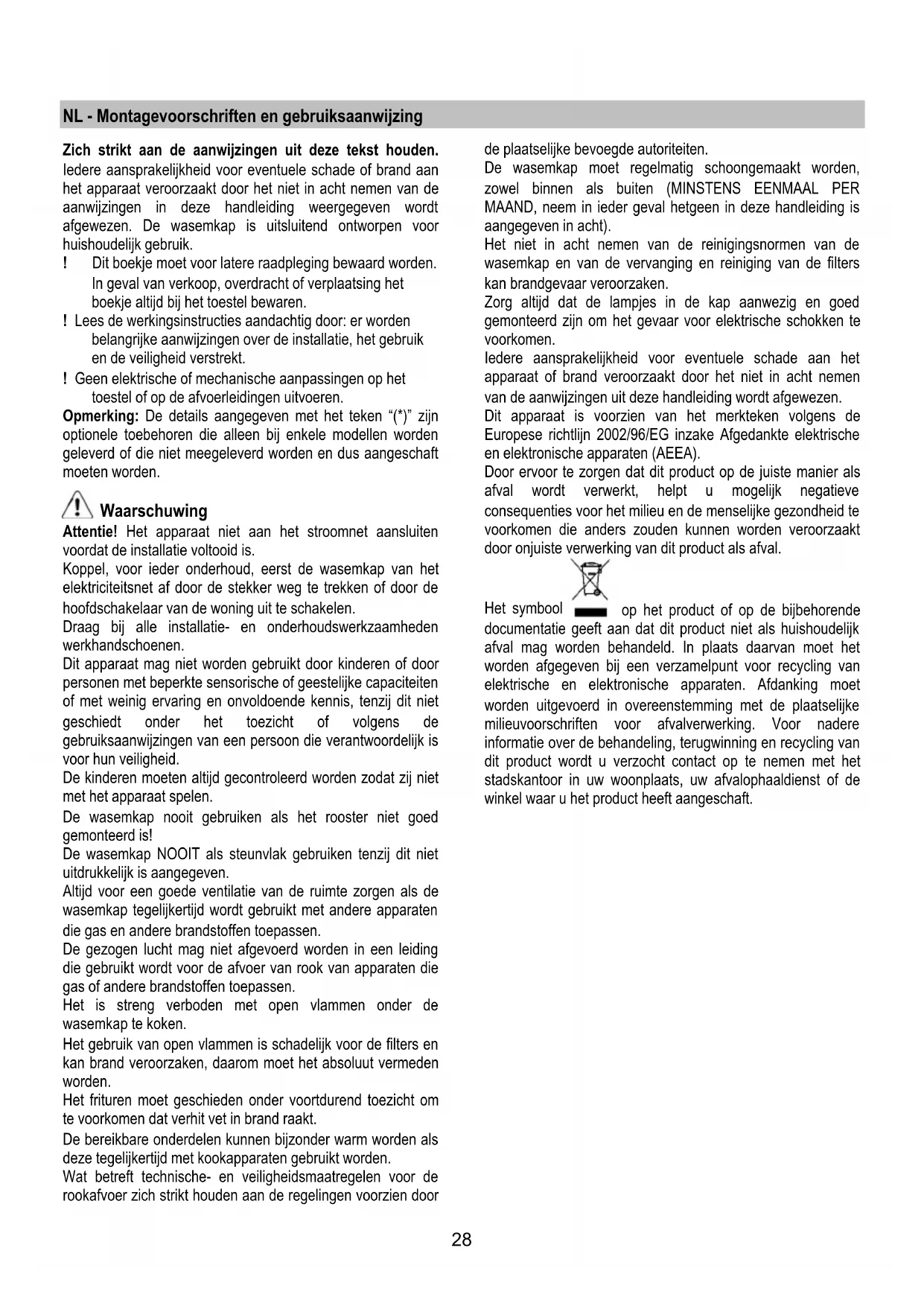 Hvis belysningen ikke fungerer, skal man kontrollere, at lampen er korrekt indsat i fatningen, før der rettes henvendelse til et servicecenter.28 NL - Montagevoorschriften en gebruiksaanwijzing Zich strikt aan de aanwijzingen uit deze tekst houden. Iedere aansprakelijkheid voor eventuele schade of brand aan het apparaat veroorzaakt door het niet in acht nemen van de aanwijzingen in deze handleiding weergegeven wordt afgewezen. De wasemkap is uitsluitend ontworpen voor huishoudelijk gebruik. ! Dit boekje moet voor latere raadpleging bewaard worden. In geval van verkoop, overdracht of verplaatsing het boekje altijd bij het toestel bewaren. ! Lees de werkingsinstructies aandachtig door: er worden belangrijke aanwijzingen over de installatie, het gebruik en de veiligheid verstrekt. ! Geen elektrische of mechanische aanpassingen op het toestel of op de afvoerleidingen uitvoeren. Opmerking: De details aangegeven met het teken “(*)” zijn optionele toebehoren die alleen bij enkele modellen worden geleverd of die niet meegeleverd worden en dus aangeschaft moeten worden. Waarschuwing Attentie! Het apparaat niet aan het stroomnet aansluiten voordat de installatie voltooid is. Koppel, voor ieder onderhoud, eerst de wasemkap van het elektriciteitsnet af door de stekker weg te trekken of door de hoofdschakelaar van de woning uit te schakelen. Draag bij alle installatie- en onderhoudswerkzaamheden werkhandschoenen. Dit apparaat mag niet worden gebruikt door kinderen of door personen met beperkte sensorische of geestelijke capaciteiten of met weinig ervaring en onvoldoende kennis, tenzij dit niet geschiedt onder het toezicht of volgens de gebruiksaanwijzingen van een persoon die verantwoordelijk is voor hun veiligheid. De kinderen moeten altijd gecontroleerd worden zodat zij niet met het apparaat spelen. De wasemkap nooit gebruiken als het rooster niet goed gemonteerd is! De wasemkap NOOIT als steunvlak gebruiken tenzij dit niet uitdrukkelijk is aangegeven. Altijd voor een goede ventilatie van de ruimte zorgen als de wasemkap tegelijkertijd wordt gebruikt met andere apparaten die gas en andere brandstoffen toepassen. De gezogen lucht mag niet afgevoerd worden in een leiding die gebruikt wordt voor de afvoer van rook van apparaten die gas of andere brandstoffen toepassen. Het is streng verboden met open vlammen onder de wasemkap te koken. Het gebruik van open vlammen is schadelijk voor de filters en kan brand veroorzaken, daarom moet het absoluut vermeden worden. Het frituren moet geschieden onder voortdurend toezicht om te voorkomen dat verhit vet in brand raakt. De bereikbare onderdelen kunnen bijzonder warm worden als deze tegelijkertijd met kookapparaten gebruikt worden. Wat betreft technische- en veiligheidsmaatregelen voor de rookafvoer zich strikt houden aan de regelingen voorzien door de plaatselijke bevoegde autoriteiten. De wasemkap moet regelmatig schoongemaakt worden, zowel binnen als buiten (MINSTENS EENMAAL PER MAAND, neem in ieder geval hetgeen in deze handleiding is aangegeven in acht). Het niet in acht nemen van de reinigingsnormen van de wasemkap en van de vervanging en reiniging van de filters kan brandgevaar veroorzaken. Zorg altijd dat de lampjes in de kap aanwezig en goed gemonteerd zijn om het gevaar voor elektrische schokken te voorkomen. Iedere aansprakelijkheid voor eventuele schade aan het apparaat of brand veroorzaakt door het niet in acht nemen van de aanwijzingen uit deze handleiding wordt afgewezen. Dit apparaat is voorzien van het merkteken volgens de Europese richtlijn 2002/96/EG inzake Afgedankte elektrische en elektronische apparaten (AEEA). Door ervoor te zorgen dat dit product op de juiste manier als afval wordt verwerkt, helpt u mogelijk negatieve consequenties voor het milieu en de menselijke gezondheid te voorkomen die anders zouden kunnen worden veroorzaakt door onjuiste verwerking van dit product als afval. Het symbool op het product of op de bijbehorende documentatie geeft aan dat dit product niet als huishoudelijk afval mag worden behandeld. In plaats daarvan moet het worden afgegeven bij een verzamelpunt voor recycling van elektrische en elektronische apparaten. Afdanking moet worden uitgevoerd in overeenstemming met de plaatselijke milieuvoorschriften voor afvalverwerking. Voor nadere informatie over de behandeling, terugwinning en recycling van dit product wordt u verzocht contact op te nemen met het stadskantoor in uw woonplaats, uw afvalophaaldienst of de winkel waar u het product heeft aangeschaft.29 Het gebruik De kap is vervaardigd voor gebruik in de afzuigversie met afvoer naar buiten, of de filtrerende versie, met luchtcirculatie. Uitvoering als afzuigend apparaat De wasemkap heeft een luchtuitgang aan de bovenkant B voor de afvoer van de dampen naar buiten (afvoerpijp en bevestigingsbandjes niet meegeleverd). afb. 1 Filterend apparaat Als het niet mogelijk is rook en kookdampen naar buiten af te voeren, kan de afzuigkap als filterend apparaat worden gebruikt door 1 of 2 koolstoffilters (*) te monteren. Rook en dampen worden weer in de keuken teruggevoerd. afb. 2 De modellen zonder afzuigmotor werken alleen als apparaten met afvoer van de lucht naar buiten, en moeten worden verbonden met een perifere afzuigunit (niet meegeleverd). De instructies voor de aansluiting worden met de perifere afzuigunit geleverd. Het installeren afb. 3-4-5-6-7-8-9-10 De minimum afstand tussen het kookvlak van het fornuis en het laagste deel van de afzuigkap mag niet onder de 50cm liggen, in geval van een elektrisch fornuis en 65cm, in geval van een gas- of gemengd fornuis. Indien in de installatie-aanwijzing van het gaskooktoestel een grotere afstand wordt aangegeven moet hiermee rekening worden gehouden. Elektrische aansluiting De netspanning moet corresponderen met de spanning die vermeld wordt op het etiket met eigenschappen, aan de binnenkant van de wasemkap. Als de wasemkap een stekker heeft, moet deze in een stopcontact worden gestoken dat voldoet aan de geldend
