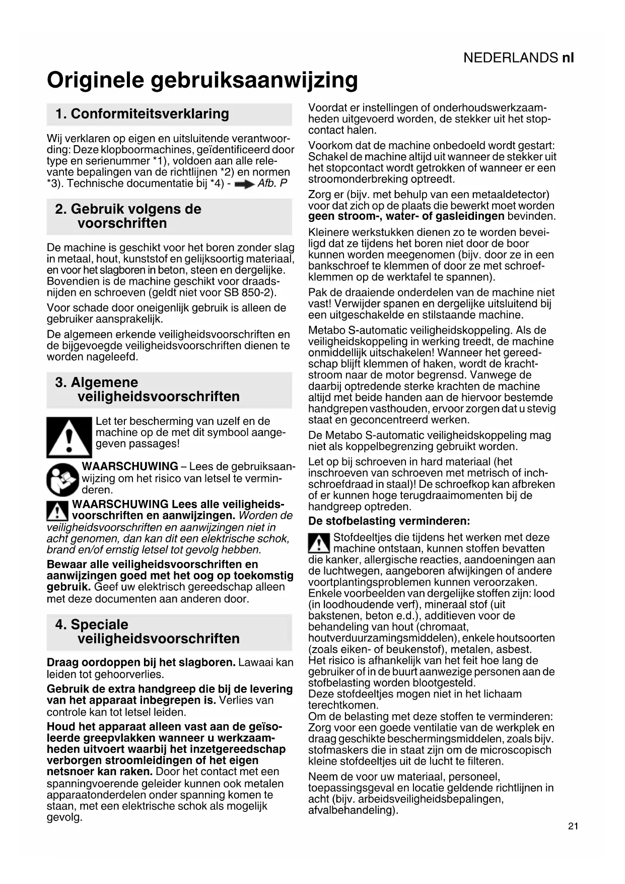 b. P De machine is geschikt voor het boren zonder slag in metaal, hout, kunststof en gelijksoortig materiaal, en voor het slagboren in beton, steen en dergelijke. Bovendien is de machine geschikt voor draads- nijden en schroeven (geldt niet voor SB 850-2). Voor schade door oneigenlijk gebruik is alleen de gebruiker aansprakelijk. De algemeen erkende veiligheidsvoorschriften en de bijgevoegde veiligheidsvoorschriften dienen te worden nageleefd. Let ter bescherming van uzelf en de machine op de met dit symbool aange- geven passages! WAARSCHUWING – Lees de gebruiksaan- wijzing om het risico van letsel te vermin- deren. WAARSCHUWING Lees alle veiligheids- voorschriften en aanwijzingen. Worden de veiligheidsvoorschriften en aanwijzingen niet in acht genomen, dan kan dit een elektrische schok, brand en/of ernstig letsel tot gevolg hebben. Bewaar alle veiligheidsvoorschriften en aanwijzingen goed met het oog op toekomstig gebruik. Geef uw elektrisch gereedschap alleen met deze documenten aan anderen door. Draag oordoppen bij het slagboren. Lawaai kan leiden tot gehoorverlies. Gebruik de extra handgreep die bij de levering van het apparaat inbegrepen is. Verlies van controle kan tot letsel leiden. Houd het apparaat alleen vast aan de geïso- leerde greepvlakken wanneer u werkzaam- heden uitvoert waarbij het inzetgereedschap verborgen stroomleidingen of het eigen netsnoer kan raken. Door het contact met een spanningvoerende geleider kunnen ook metalen apparaatonderdelen onder spanning komen te staan, met een elektrische schok als mogelijk gevolg. Voordat er instellingen of onderhoudswerkzaam- heden uitgevoerd worden, de stekker uit het stop- contact halen. Voorkom dat de machine onbedoeld wordt gestart: Schakel de machine altijd uit wanneer de stekker uit het stopcontact wordt getrokken of wanneer er een stroomonderbreking optreedt. Zorg er (bijv. met behulp van een metaaldetector) voor dat zich op de plaats die bewerkt moet worden geen stroom-, water- of gasleidingen bevinden. Kleinere werkstukken dienen zo te worden bevei- ligd dat ze tijdens het boren niet door de boor kunnen worden meegenomen (bijv. door ze in een bankschroef te klemmen of door ze met schroef- klemmen op de werktafel te spannen). Pak de draaiende onderdelen van de machine niet vast! Verwijder spanen en dergelijke uitsluitend bij een uitgeschakelde en stilstaande machine. Metabo S-automatic veiligheidskoppeling. Als de veiligheidskoppeling in werking treedt, de machine onmiddellijk uitschakelen! Wanneer het gereed- schap blijft klemmen of haken, wordt de kracht- stroom naar de motor begrensd. Vanwege de daarbij optredende sterke krachten de machine altijd met beide handen aan de hiervoor bestemde handgrepen vasthouden, ervoor zorgen dat u stevig staat en geconcentreerd werken. De Metabo S-automatic veiligheidskoppeling mag niet als koppelbegrenzing gebruikt worden. Let op bij schroeven in hard materiaal (het inschroeven van schroeven met metrisch of inch- schroefdraad in staal)! De schroefkop kan afbreken of er kunnen hoge terugdraaimomenten bij de handgreep optreden. De stofbelasting verminderen: Stofdeeltjes die tijdens het werken met deze machine ontstaan, kunnen stoffen bevatten die kanker, allergische reacties, aandoeningen aan de luchtwegen, aangeboren afwijkingen of andere voortplantingsproblemen kunnen veroorzaken. Enkele voorbeelden van dergelijke stoffen zijn: lood (in loodhoudende verf), mineraal stof (uit bakstenen, beton e.d.), additieven voor de behandeling van hout (chromaat, houtverduurzamingsmiddelen), enkele houtsoorten (zoals eiken- of beukenstof), metalen, asbest. Het risico is afhankelijk van het feit hoe lang de gebruiker of in de buurt aanwezige personen aan de stofbelasting worden blootgesteld. Deze stofdeeltjes mogen niet in het lichaam terechtkomen. Om de belasting met deze stoffen te verminderen: Zorg voor een goede ventilatie van de werkplek en draag geschikte beschermingsmiddelen, zoals bijv. stofmaskers die in staat zijn om de microscopisch kleine stofdeeltjes uit de lucht te filteren. Neem de voor uw materiaal, personeel, toepassingsgeval en locatie geldende richtlijnen in acht (bijv. arbeidsveiligheidsbepalingen, afvalbehandeling).