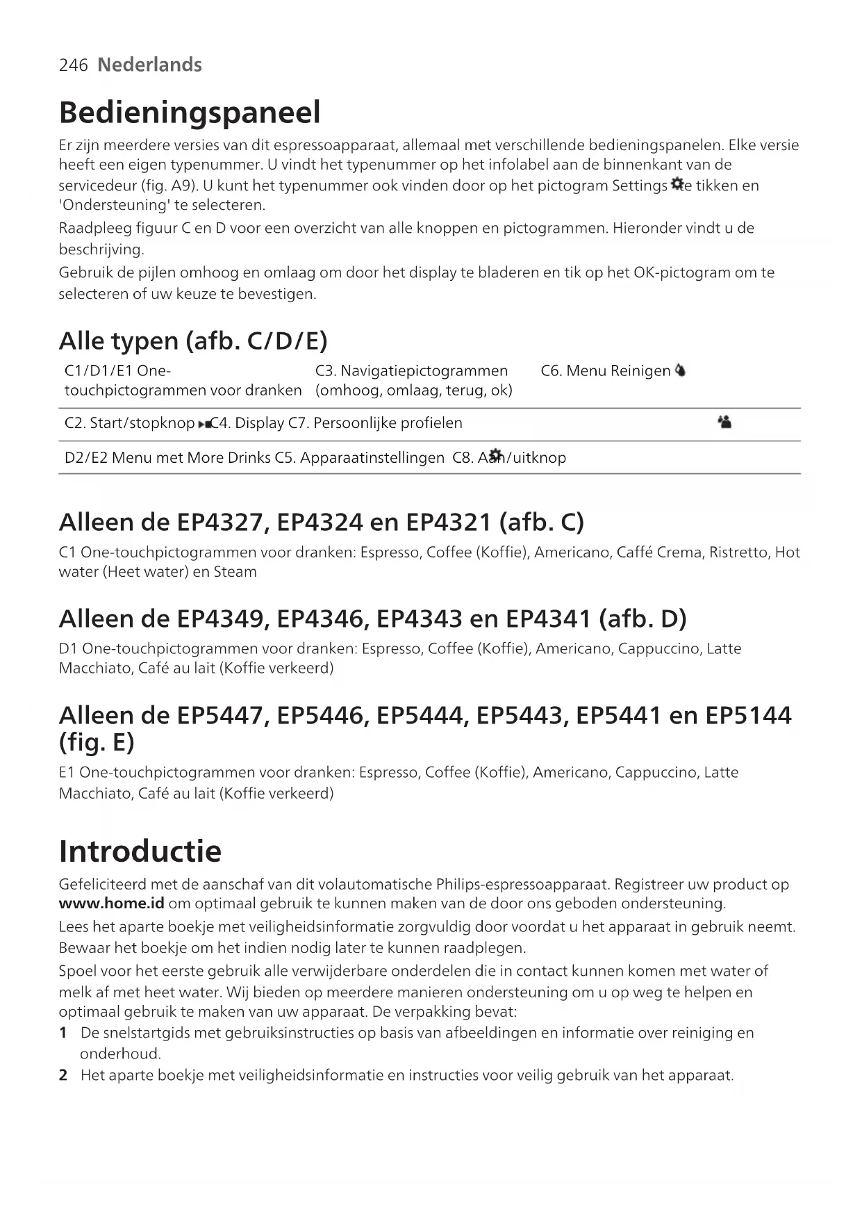 Nederlands NederlandsNederlands Inhoud Apparaatoverzicht (afb. A)________________________________________________________________ 245Bedieningspaneel________________________________________________________________________ 246Introductie ______________________________________________________________________________ 246Vóór het eerste gebruik __________________________________________________________________ 247Dranken bereiden________________________________________________________________________ 248Dranken aan uw voorkeur aanpassen _____________________________________________________ 251Apparaatinstellingen aanpassen __________________________________________________________ 252De zetgroep plaatsen en verwijderen______________________________________________________ 253Schoonmaken en onderhoud _____________________________________________________________ 253 AquaClean-waterfilter ___________________________________________________________________ 256 Ontkalkingsprocedure (30 min.) __________________________________________________________ 257 Accessoires bestellen_____________________________________________________________________ 258Problemen oplossen _____________________________________________________________________ 259Technische gegevens_____________________________________________________________________ 265 Apparaatoverzicht (afb. A) A1 Bedieningspaneel A10 Infolabel met typenummerA2 Kophouder A11 WaterreservoirA3 Compartiment voor voorgemalen koffie A12 HeetwaterpijpjeA4 Deksel van bonenreservoir A13 KoffiedikbakA5 Verstelbare koffie-uitloop A14 Voorpaneel van koffiedikbakA6 Maalgraadknop A15 Rooster lekbakA7 Bonenreservoir A16 LekbakA8 Zetgroep A17 Indicator 'lekbak vol'A9 Servicedeur Accessoires A18 AquaClean-waterfilter A21 Klassieke melkopschuimer (alleenbepaalde modelnummers)A19 Maatschep A22 LatteGo (melkreservoir) (alleen bepaaldemodelnummers)A20 Teststrip voor waterhardheid246 Nederlands Bedieningspaneel Er zijn meerdere versies van dit espressoapparaat, allemaal met verschillende bedieningspanelen. Elke versie heeft een eigen typenummer. U vindt het typenummer op het infolabel aan de binnenkant van de servicedeur (fig. A9). U kunt het typenummer ook vinden door op het pictogram Settings te tikken en 'Ondersteuning' te selecteren. Raadpleeg figuur C en D voor een overzicht van alle knoppen en pictogrammen. Hieronder vindt u de beschrijving. Gebruik de pijlen omhoog en omlaag om door het display te bladeren en tik op het OK-pictogram om te selecteren of uw keuze te bevestigen. Alle typen (afb. C/D/E) C1/D1/E1 One- touchpictogrammen voor dranken C3. Navigatiepictogrammen (omhoog, omlaag, terug, ok) C6. Menu Reinigen C2. Start/stopknop C4. Display C7. Persoonlijke profielen D2/E2 Menu met More Drinks C5. Apparaatinstellingen C8. Aan/uitknop Alleen de EP4327, EP4324 en EP4321 (afb. C) C1 One-touchpictogrammen voor dranken: Espresso, Coffee (Koffie), Americano, Caffé Crema, Ristretto, Hot water (Heet water) en Steam Alleen de EP4349, EP4346, EP4343 en EP4341 (afb. D) D1 One-touchpictogrammen voor dranken: Espresso, Coffee (Koffie), Americano, Cappuccino, Latte Macchiato, Café au lait (Koffie verkeerd) Alleen de EP5447, EP5446, EP5444, EP5443, EP5441 en EP5144 (fig. E) E1 One-touchpictogrammen voor dranken: Espresso, Coffee (Koffie), Americano, Cappuccino, Latte Macchiato, Café au lait (Koffie verkeerd) Introductie Gefeliciteerd met de aanschaf van dit volautomatische Philips-espressoapparaat. Registreer uw product op www.home.id om optimaal gebruik te kunnen maken van de door ons geboden ondersteuning. Lees het aparte boekje met veiligheidsinformatie zorgvuldig door voordat u het apparaat in gebruik neemt. Bewaar het boekje om het indien nodig later te kunnen raadplegen. Spoel voor het eerste gebruik alle verwijderbare onderdelen die in contact kunnen komen met water of melk af met heet water. Wij bieden op meerdere manieren ondersteuning om u op weg te helpen en optimaal gebruik te maken van uw apparaat. De verpakking bevat: 1 De snelstartgids met gebruiksinstructies op basis van afbeeldingen en informatie over reiniging en onderhoud. 2 Het aparte boekje met veiligheidsinformatie en instructies voor veilig gebruik van het apparaat.247 Nederlands Nederlands 3 Voor online ondersteuning (deze uitgebreide gebruikershandleiding, veelgestelde vragen, video's enzovoorts), scant u de QR-code op de voorpagina van dit boekje om de app HomeID te downloaden of gaat u naar www.home.id/support. U kunt de QR-code ook vinden door op het pictogram Instellingen te tikken en Ondersteuning te selecteren. Dit apparaat is getest met koffie. Hoewel het apparaat zorgvuldig is schoongemaakt, kunnen er wat koffieresten zijn achtergebleven. We garanderen dat het apparaat helemaal nieuw is. Het apparaat past automatisch de hoeveelheid gemalen koffie aan die wordt gebruikt, om de lekkerste koffie te maken. Na de eerste vijf koppen koffie is het apparaat helemaal goed ingesteld. Spoel de LatteGo (melkreservoir) of de klassieke melkopschuimer af voor het eerste gebruik. Vóór het eerste gebruik