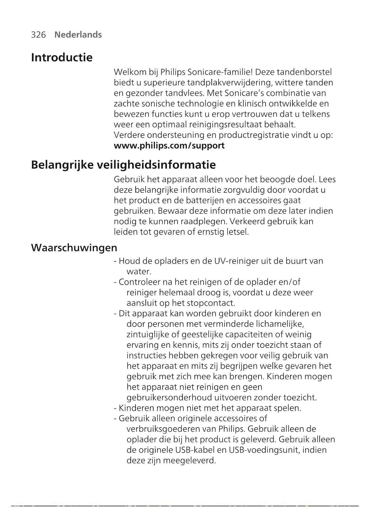 Nederlands Introductie Welkom bij Philips Sonicare-familie! Deze tandenborstel biedt u superieure tandplakverwijdering, wittere tanden en gezonder tandvlees. Met Sonicare’s combinatie van zachte sonische technologie en klinisch ontwikkelde en bewezen functies kunt u erop vertrouwen dat u telkens weer een optimaal reinigingsresultaat behaalt. Verdere ondersteuning en productregistratie vindt u op: www.philips.com/support Belangrijke veiligheidsinformatie Gebruik het apparaat alleen voor het beoogde doel. Lees deze belangrijke informatie zorgvuldig door voordat u het product en de batterijen en accessoires gaat gebruiken. Bewaar deze informatie om deze later indien nodig te kunnen raadplegen. Verkeerd gebruik kan leiden tot gevaren of ernstig letsel. Waarschuwingen - Houd de opladers en de UV-reiniger uit de buurt van water. - Controleer na het reinigen of de oplader en/of reiniger helemaal droog is, voordat u deze weer aansluit op het stopcontact. - Dit apparaat kan worden gebruikt door kinderen en door personen met verminderde lichamelijke, zintuiglijke of geestelijke capaciteiten of weinig ervaring en kennis, mits zij onder toezicht staan of instructies hebben gekregen voor veilig gebruik van het apparaat en mits zij begrijpen welke gevaren het gebruik met zich mee kan brengen. Kinderen mogen het apparaat niet reinigen en geen gebruikersonderhoud uitvoeren zonder toezicht. - Kinderen mogen niet met het apparaat spelen. - Gebruik alleen originele accessoires of verbruiksgoederen van Philips. Gebruik alleen de oplader die bij het product is geleverd. Gebruik alleen de originele USB-kabel en USB-voedingsunit, indien deze zijn meegeleverd.327 Nederlands - Dit apparaat bevat geen onderdelen die door de gebruiker gerepareerd kunnen worden. Gebruik het apparaat niet meer als het beschadigd is en neem contact op met het Klantenservice in uw land. Alleen bij apparaten met snoer: als het snoer beschadigd is, vervang dan de oplader met de reiniger door een nieuwe. - Gebruik de oplader en/of reiniger niet buitenshuis of in de buurt van hete oppervlakken. - Maak geen enkel onderdeel van het product schoon in de vaatwasmachine. - Dit apparaat is alleen bedoeld voor de reiniging van tanden, tandvlees en de tong. - Houd de uv-reiniger altijd buiten het bereik van kinderen. - Stop met het gebruik van de UV-reiniger als de UV- lamp blijft branden wanneer het deurtje open staat. uv-licht kan schadelijk zijn voor ogen en huid. - Gebruik de reiniger alleen als het afdekscherm op zijn plaats zit. - Raak de UV-lamp van de UV-reiniger niet aan wanneer deze heet is. - Gebruik een opzetborstel niet als de borstelharen verbogen of geknakt zijn. Vervang de opzetborstel elke 3 maanden of eerder indien deze tekenen van slijtage vertoont. - Vermijd direct contact met producten die essentiële oliën of kokosolie bevatten. Als gevolg van dergelijk contact kunnen borstelharen losraken. - Stop met het gebruik van het apparaat en raadpleeg uw tandarts/arts als er na gebruik sprake is van overmatig bloeden, als er na 1 week gebruik nog steeds bloedingen optreden of als u ongemak of pijn ervaart. - Raadpleeg uw tandarts voordat u dit apparaat gebruikt als u in de afgelopen 2 maanden een chirurgische behandeling aan uw mond of uw tandvlees hebt ondergaan.328 Nederlands - Als u een pacemaker of ander geïmplanteerd apparaat hebt, neemt u vóór gebruik van het apparaat contact op met uw arts of de fabrikant van het geïmplanteerde apparaat. - Raadpleeg uw arts voordat u dit apparaat gebruikt als u medische klachten hebt. - Dit apparaat is bedoeld voor thuisgebruik en is niet bedoeld om door meerdere personen te worden gebruikt in een tandartsenpraktijk of een instelling. Veiligheidsinstructies voor batterijen - Dit apparaat bevat batterijen die alleen door vakkundige personen mogen worden vervangen. - Gebruik het apparaat alleen voor het beoogde doel. Lees deze informatie zorgvuldig door voordat u het product en de batterijen en accessoires gaat gebruiken. Bewaar het boekje om het indien nodig later te kunnen raadplegen. Verkeerd gebruik kan leiden tot gevaren of ernstig letsel. De meegeleverde accessoires kunnen per product verschillen. - Gebruik alleen originele accessoires en verbruiksgoederen van Philips. Gebruik alleen de verwijderbare voedingen TCBxxxx, HX6100, HX6110, HX6160 of WAAxxxx. - Houd het product en de batterijen uit de buurt van vuur en stel ze niet bloot aan direct zonlicht of hoge temperaturen. - Als het product erg heet wordt, een abnormale geur afgeeft, van kleur verandert of als het opladen veel langer duurt dan gewoonlijk, mag u het product niet meer gebruiken of opladen. Neem contact op met Philips. - Plaats producten en bijbehorende batterijen niet in een magnetron of op een inductiekookplaat. - Om te voorkomen dat batterijen te heet worden of giftige of gevaarlijke stoffen afgeven, mag u het product en de batterij niet openen, aanpassen, doorboren, beschadigen of uit elkaar nemen. Sluit de batterijen niet kort, laad ze niet te veel op en let bij het opladen op de juiste polariteit.329 Nederlands - Dit apparaat bevat batterijen die niet vervangbaar zijn. Als de batterij het einde van de levensduur heeft bereikt, moet het apparaat op de juiste wijze worden afgevoerd. Raadpleeg hiervoor de paragraaf over recycling. - Als batterijen beschadigd zijn of lekken, dient u contact met de huid of ogen te vermijden. Als er toch contact met de huid of ogen optreedt, spoel dan onmiddellijk grondig met water en roep medische hulp in. - Zorg dat uw handen, het product en de batterijen droog zijn wanneer u de batterijen hanteert. - Laat de batterijaansluitingen niet in aanraking komen met een metalen voorwerp (zoals een munt, haarspeld of ring) om te voorkomen dat de batterijen na verwijdering kortsluiten. Wikkel batterijen niet in aluminiumfolie. Plak de batterijpolen af met tape of doe de batterijen in een plastic zak voordat u ze weggooit. - Laad het product op en gebruik het bij een temperatuur tussen 0°C en 