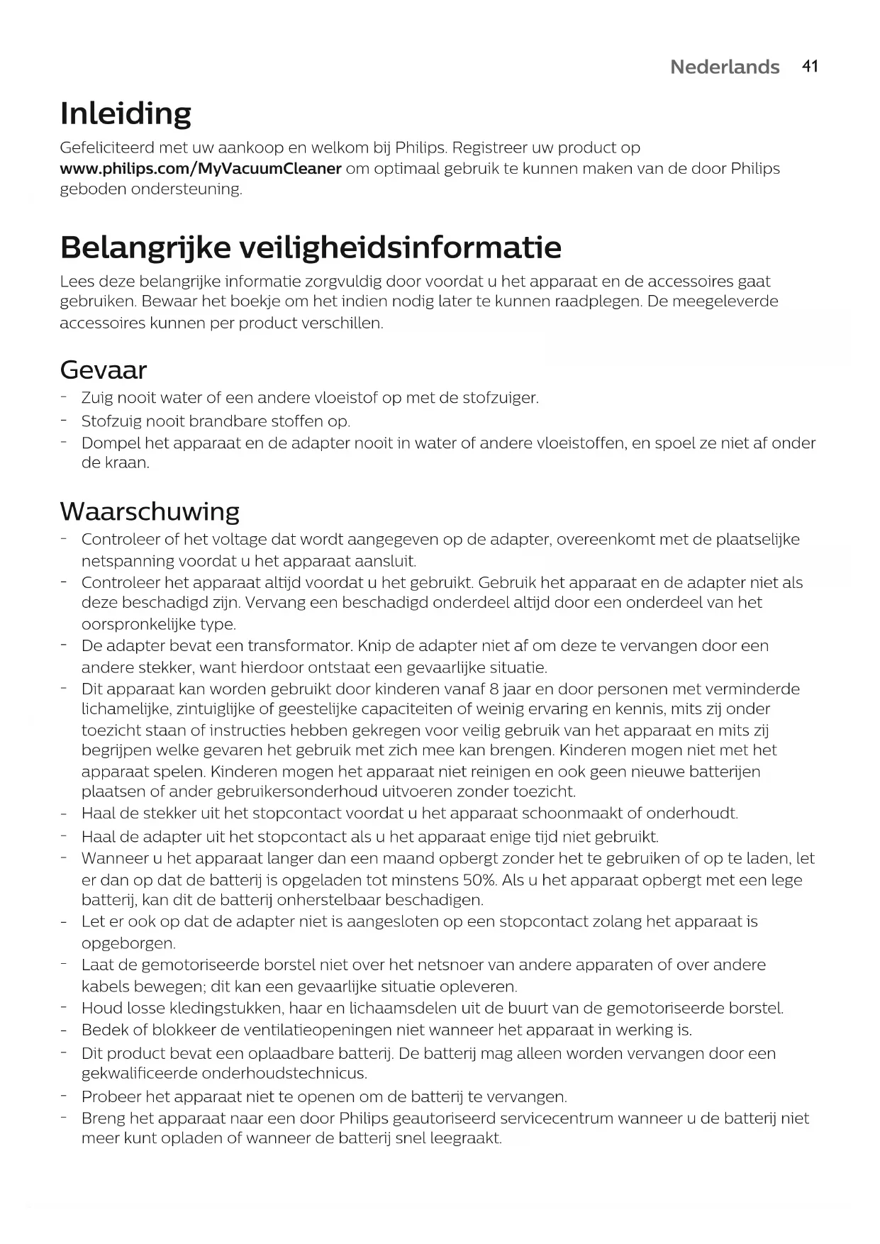Nederlands Inleiding Gefeliciteerd met uw aankoop en welkom bij Philips. Registreer uw product op www.philips.com/MyVacuumCleaner om optimaal gebruik te kunnen maken van de door Philips geboden ondersteuning. Belangrijke veiligheidsinformatie Lees deze belangrijke informatie zorgvuldig door voordat u het apparaat en de accessoires gaat gebruiken. Bewaar het boekje om het indien nodig later te kunnen raadplegen. De meegeleverde accessoires kunnen per product verschillen. Gevaar