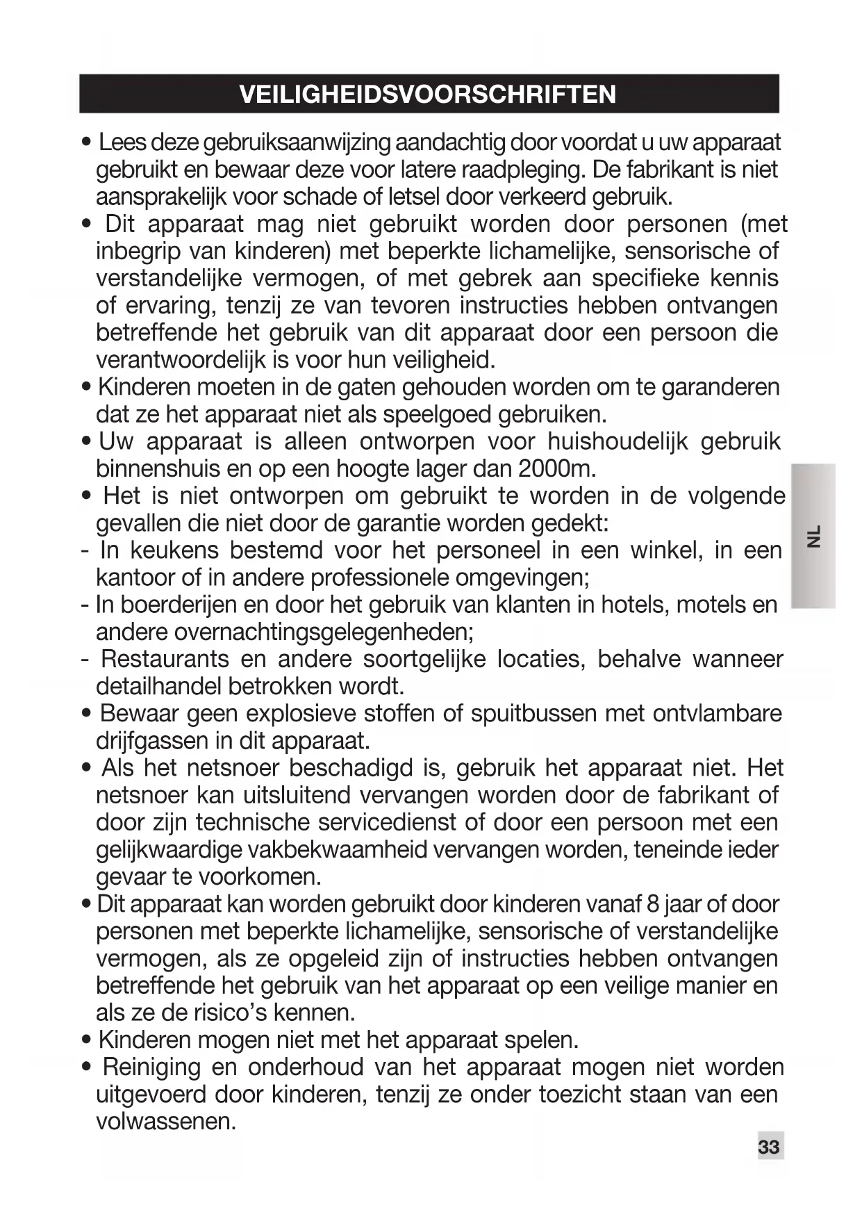 - Dit apparaat kan worden gebruikt door kinderen vanaf 8 jaar of door personen met beperkte lichamelijke, sensorische of verstandelijke vermogen, als ze opgeleid zijn of instructies hebben ontvangen betreffende het gebruik van het apparaat op een veilige manier en als ze de risico’s kennen.