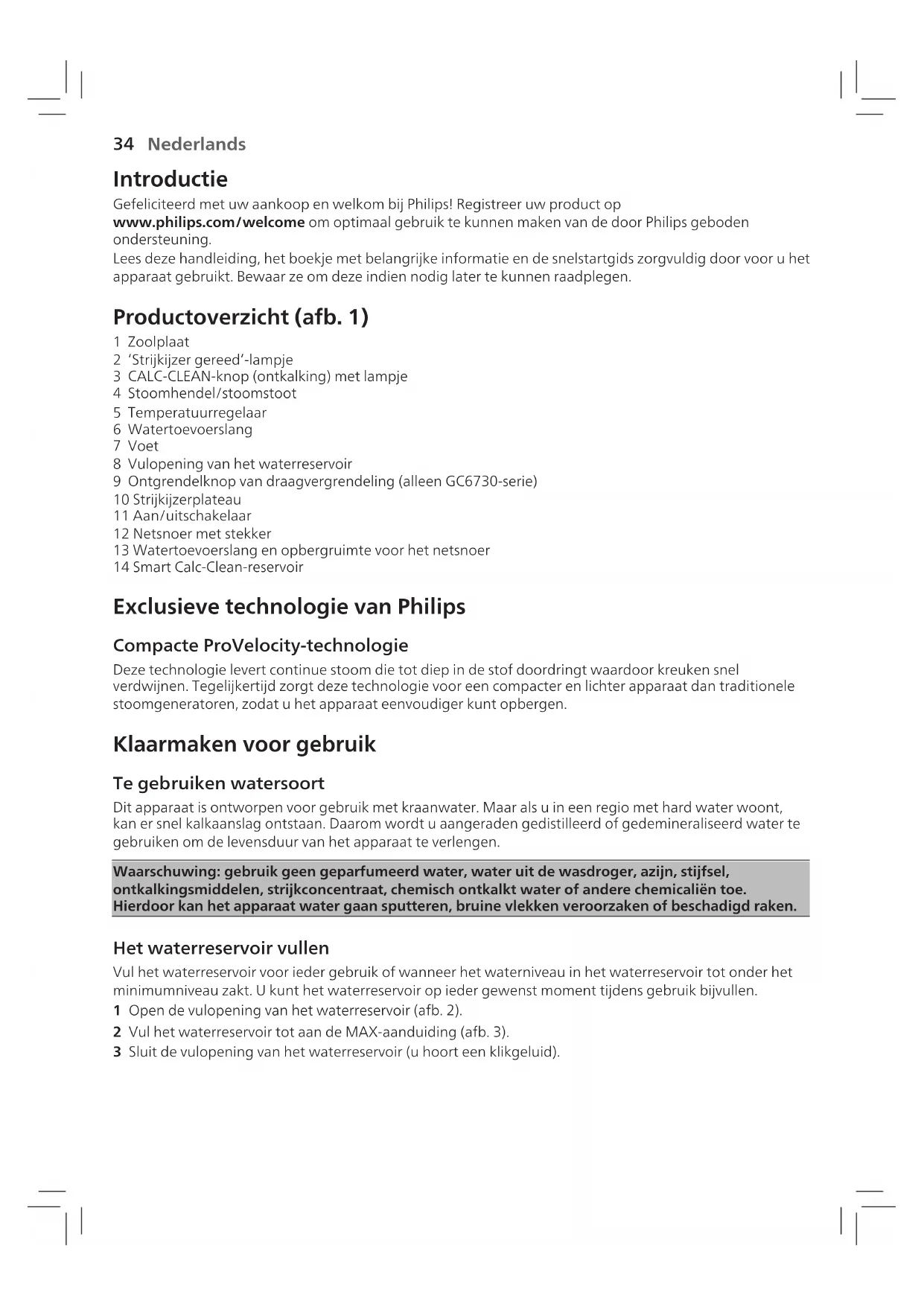 1 Zoolplaat 2 ‘Strijkijzer gereed’-lampje 3 CALC-CLEAN-knop )ontkalking( met lampje 4 Stoomhendel/stoomstoot 5 Temperatuurregelaar 6 Watertoevoerslang 7 Voet 8 Vulopening van het waterreservoir 9 Ontgrendelknop van draagvergrendeling )alleen GC6730-serie( 10 Strijkijzerplateau 11 Aan/uitschakelaar 12 Netsnoer met stekker 13 Watertoevoerslang en opbergruimte voor het netsnoer 14 Smart Calc-Clean-reservoir Exclusieve technologie van Philips Compacte ProVelocity-technologie Deze technologie levert continue stoom die tot diep in de stof doordringt waardoor kreuken snel verdwijnen. Tegelijkertijd zorgt deze technologie voor een compacter en lichter apparaat dan traditionele stoomgeneratoren, zodat u het apparaat eenvoudiger kunt opbergen. Klaarmaken voor gebruik Te gebruiken watersoort Dit apparaat is ontworpen voor gebruik met kraanwater. Maar als u in een regio met hard water woont, kan er snel kalkaanslag ontstaan. Daarom wordt u aangeraden gedistilleerd of gedemineraliseerd water te gebruiken om de levensduur van het apparaat te verlengen. Waarschuwing: gebruik geen geparfumeerd water, water uit de wasdroger, azijn, stijfsel, ontkalkingsmiddelen, strijkconcentraat, chemisch ontkalkt water of andere chemicaliën toe.