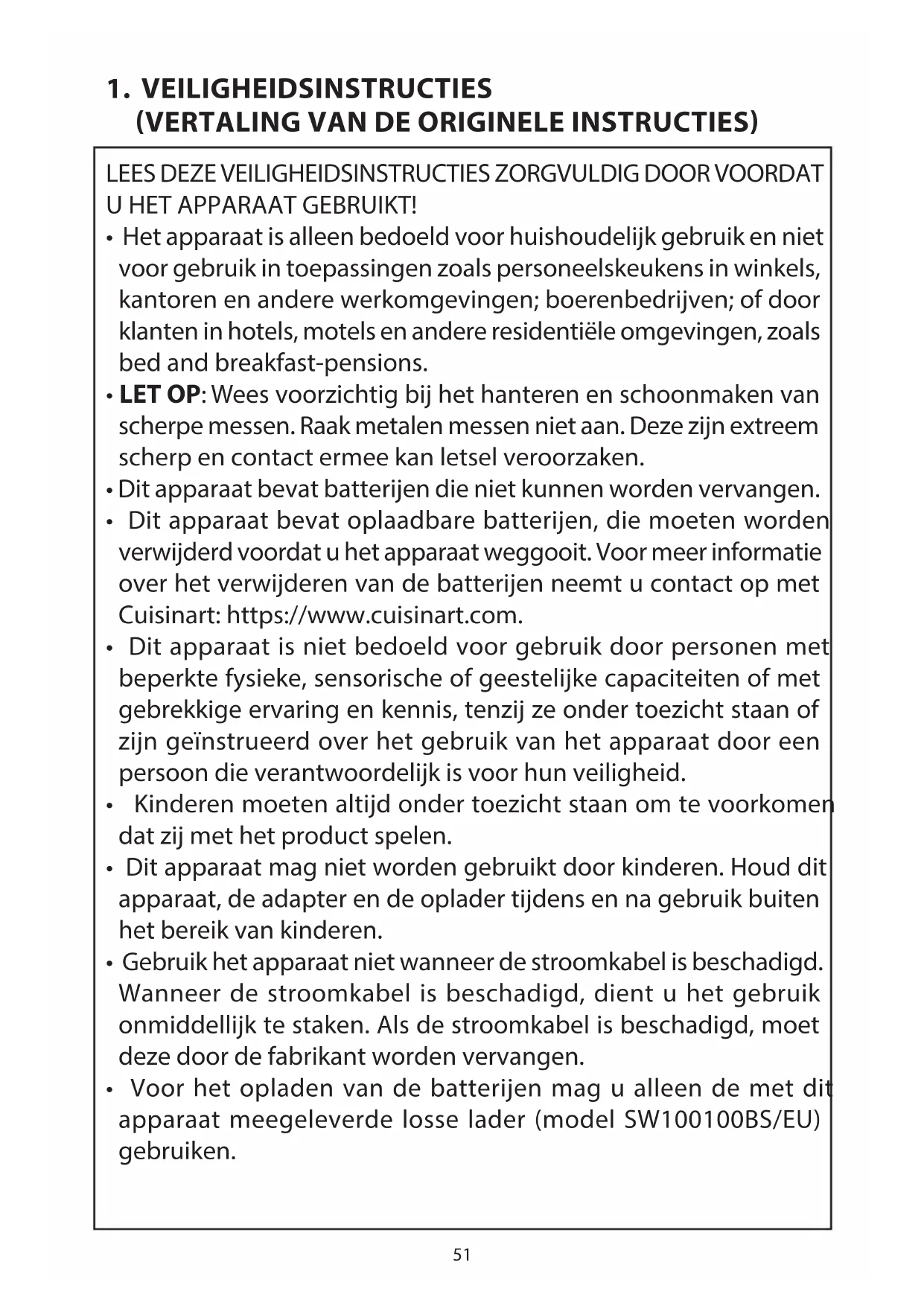 - Dit apparaat bevat oplaadbare batterijen, die moeten worden verwijderd voordat u het apparaat weggooit. Voor meer informatie over het verwijderen van de batterijen neemt u contact op met Cuisinart: https://www.cuisinart.com.