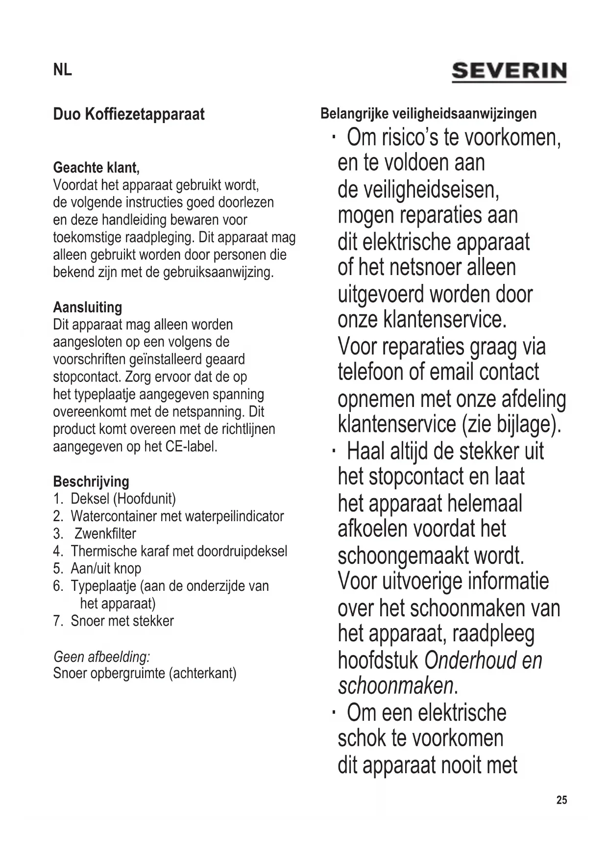 Draai na het uitschenken de deksel met de klok mee totdat de twee pijltjes tegenover elkaar staan. ∙ Hetkofezetapparaatzalautomatisch uitschakelen wanneer de brouwcyclus is voltooid. ∙ Onderbreken van de brouwcyclus: Om de brouwcyclus te onderbreken, nogmaals op de aan/uit knop drukken om het apparaat uit te schakelen. ∙ Uitschakelen van het kofezetapparaat: Haal de stekker uit het stopcontact zodra het brouwen voltooid is. Thermische karaf ∙ Men kan de thermische karaf technisch gezien niet hermetisch afsluiten omdat de dop zich dan vast zou zuigen. Daarom de karaf, indien gevuld, altijd rechtop houden. ∙ Kofe heet houden: Een thermische karaf verzamelt hitte energie. Indien u de karaf voor gebruik even met heet water vult zal de warmhoudtijd aanzienlijk langer zijn (Wanneer men de karaf maar voor de helft vult zal de warmhoudtijd korter zijn). ∙ De thermische karaf is voorzien van een hoogwaardige dubbelwandige glazen binnenes. ∙ Nerven of blaasjes die er ook uit kunnen zien als barsten of scheurtjes hebben geen enkele invloed op het gebruik en de warmhoudfunctie van de karaf. ∙ Voor een optimale isolatie is er tussen de glaswanden een vacuüm ruimte. ∙ In het geval dat het glas door één van de hierboven vermelde redenen beschadigd wordt, bestaat het gevaar dat de glazen binnenes implodeert. Dit kan heel goed op een later tijdstip gebeuren,langnadatdebinnenes beschadigd was. ∙ Drink daarom nooit direct uit of plaats uw hand in de karaf. Omschadeaandeglazeneste voorkomen: ∙ Schokken, stoten en grote temperatuurverschillen vermijden. ∙ Roer de vloeistof in de kan niet om met metalen of andere harde voorwerpen, zoals een metalen lepel. ∙ Geen harde borstel of schurende reinigingsmiddelen gebruiken. ∙ Nooit de binnenkant met een doek schoonmaken. In de doek kunnen scherpe glasdeeltjes zitten.(Gelijk aan een glassnijder). ∙ Niet in de vaatwasser reinigen. ∙ Niet in de magnetron gebruiken. Ontkalken ∙ Afhangend van de waterkwaliteit (kalkgehalte) in uw woonplaats en de hoeveelheid watergebruik, moeten alle apparaten die heet water gebruiken regelmatig ontkalkt worden (verwijderen van kalkaanslag). ∙ Een langere bereidingstijd, restwater in het reservoir of meer lawaai tijdens hetkofezettengeeftaandatontkalken nodig is. ∙ Een grote hoeveelheid kalkaanslag is zeer moeilijk te verwijderen zelfs wanneer men sterke ontkalkingsmiddelen gebruikt. Dit kan30 104 x 142 mm ook lekken van het brouwsysteem veroorzaken. Om eventuele schade te voorkomen raden we sterk aan het apparaat te ontkalken nadat men deze dertig tot veertig keer gebruikt heeft. ∙ Iedere garantie claim zal ongeldig zijn wanneer het apparaat niet werkt vanwege onvoldoende ontkalken. ∙ Voor het ontkalken moet men de volgende azijnoplossing gebruiken: ∙ Meng 80 ml schoonmaakazijn met de maximale aangegeven hoeveelheid koud water. ∙ Giet dit mengel in beide waterreservoirs. Plaatsdepapierenlterinde lterhouderzonderdatmengemalen kofetoevoegtzoalswordtbeschreven in het hoofdstuk Het maken van lterkofe, en laat het apparaat de completeltercyclusdoorlopen.Herhaal dit proces wanneer nodig. Tijdens het ontkalken moet men ervoor zorgen dat er genoeg ventilatie is zodat men geen azijndamp inhaleert. ∙ Zet het apparaat na 2-3 minuten uit en laat de ontkalkingsoplossing gedurende 10 minuten inwerken. Zet het apparaat vervolgens weer aan. ∙ Om beide kanten van het apparaat na het ontkalken schoon te maken, het apparaat 2-3 keer uitsluitend met schoon, koud water laten doorlopen (zondergemalenkofe). ∙ Giet geen ontkalker in geëmailleerde gootstenen. Onderhoud en schoonmaken ∙ Haal altijd de stekker uit het stopcontact en laat het apparaat helemaal afkoelen voordat deze schoongemaakt wordt. ∙ Om een elektrische schok te voorkomen ditkofezetapparaatnooitinwater onderdompelen. Het apparaat mag schoongemaakt worden met een vochtige doek en een zachte zeep. Veeg hem goed droog. ∙ Gebruik geen schuurmiddel of bijtende schoonmaak producten. ∙ Verwijderdepapierenltermetde gebruiktekofedrapenmaakde lterhouderschoonmetwater.De kofedrapkangecomposteerdworden. Thermische karaf: ∙ Haal de karaf niet uit elkaar, plaats deze nooit in de vaatwasser en dompel hem niet onderwater. ∙ De binnenkant van de karaf mag uitgespoeld worden met water en de buitenkant mag men na gebruik schoonvegen met een schone vochtige doek. ∙ Omkoferestenvandebinnenkantvan de thermische karaf te verwijderen moet men de karaf met heet water en een eetlepel vaatwasmachine zeep vullen. Schroef de deksel op de karaf en laat deze gedurende een paar uur gesloten. Spoel de karaf hierna goed uit met schoon water. ∙ Doordruipdeksel: Om het doordruipdeksel te reinigen, moet het worden aangebracht voordat het water (met of zonder reinigingsmiddel) begint te stromen,104 x 142 mm