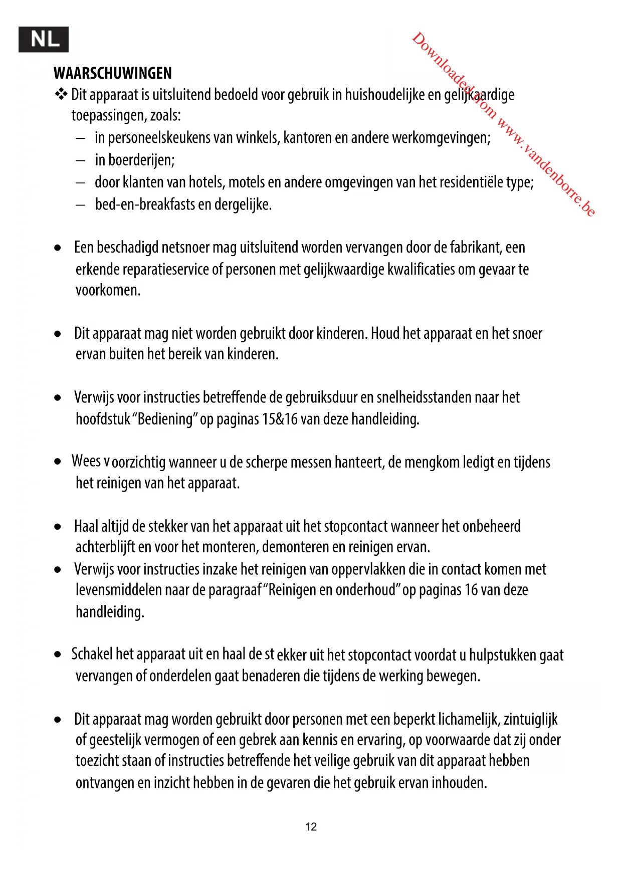 Downloaded from www.vandenborre.beWAARSCHUWINGEN Dit apparaat is uitsluitend bedoeld voor gebruik in huishoudelijke en gelijkaardige toepassingen, zoals: in personeelskeukens van winkels, kantoren en andere werkomgevingen; in boerderijen; door klanten van hotels, motels en andere omgevingen van het residentiële type; bed-en-breakfasts en dergelijke. Een beschadigd netsnoer mag uitsluitend worden vervangen door de fabrikant, een erkende reparatieservice of personen met gelijkwaardige kwalificaties om gevaar te voorkomen. Dit apparaat mag niet worden gebruikt door kinderen. Houd het apparaat en het snoer ervan buiten het bereik van kinderen. Verwijs voor instructies betreffende de gebruiksduur en snelheidsstanden naar het hoofdstuk “Bediening” op paginas 15&16 van deze handleiding. Wees v oorzichti g wanneer u d e scherpe messen hant eert, de mengkom ledigt en tijdens het reinigen van het apparaat. Haal altijd de stekker van het apparaat uit het stopcontact wanneer het onbeheerd achterblijft en voor het monteren, demonteren en reinigen ervan. Verwijs voor instructies inzake het reinigen van oppervlakken die in contact komen met levensmiddelen naar de paragraaf “Reinigen en onderhoud” op paginas 16 van deze handleiding. Schakel het apparaat uit en haal de st ekker uit het stopcontact voordat u hulpstukken gaat vervangen of onderdelen gaat benaderen die tijdens de werking bewegen. Dit apparaat mag worden gebruikt door personen met een beperkt lichamelijk, zintuiglijk of geestelijk vermogen of een gebrek aan kennis en ervaring, op voorwaarde dat zij onder toezicht staan of instructies betreffende het veilige gebruik van dit apparaat hebben ontvangen en inzicht hebben in de gevaren die het gebruik ervan inhouden.