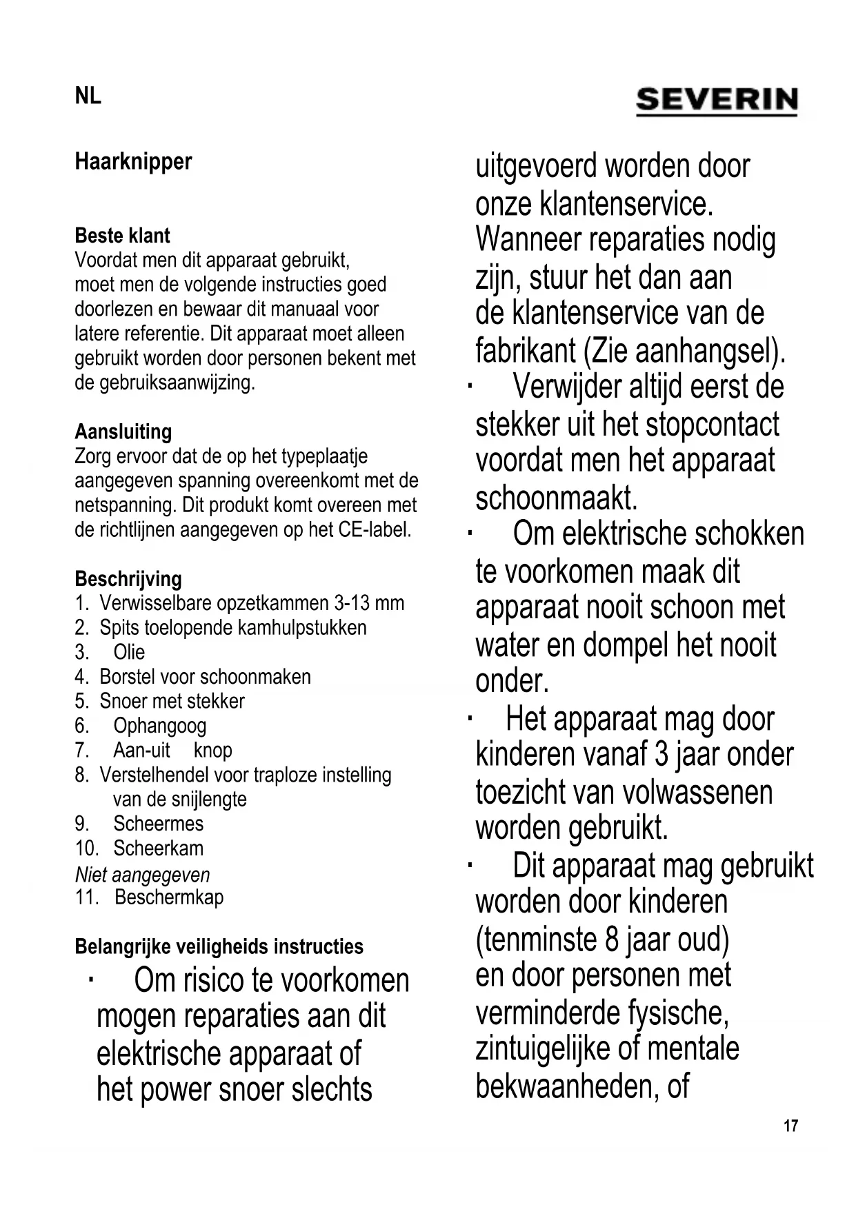 Belangrijke veiligheids instructies ∙ Om risico te voorkomen mogen reparaties aan dit elektrische apparaat of het power snoer slechts uitgevoerd worden door onze klantenservice. Wanneer reparaties nodig zijn, stuur het dan aan de klantenservice van de fabrikant (Zie aanhangsel). ∙ Verwijder altijd eerst de stekker uit het stopcontact voordat men het apparaat schoonmaakt. ∙ Om elektrische schokken te voorkomen maak dit apparaat nooit schoon met water en dompel het nooit onder. ∙ Het apparaat mag door kinderen vanaf 3 jaar onder toezicht van volwassenen worden gebruikt. ∙ Dit apparaat mag gebruikt worden door kinderen (tenminste 8 jaar oud) en door personen met verminderde fysische, zintuigelijke of mentale bekwaanheden, of NL18 gebrek van ervaring en kennis, wanneer deze onder begeleiding zijn of instructies ontvangen hebben over het gebruik van dit apparaat en volledig de gevaren en veiligheidsvoorschriften begrijpen. ∙ Kinderen mogen niet met het apparaat spelen. ∙ Reiniging en onderhoud door de gebruiker mag niet door kinderen worden uitgevoerd zonder toezicht van volwassenen. ∙ Het apparaat en het snoer moeten altijd goed weggehouden worden van kinderen jonger dan 3 jaar. ∙ Waarschuwing: houdt kinderen weg van inpakmateriaal, daar deze een bron van gevaar zijn b.v. door verstikking. ∙ Waarschuwing: gebruik dit apparaat nooit in de omgeving van een bad, wastafel met water, of andere containers gevult met water. ∙ Waarschuwing: bescherm het apparaat tegen vocht en gebruik het nooit met natte handen. ∙ Wanneer het apparaat gebruikt wordt in de badkamer, zal de aanwezigheid van water een gevaar veroorzaken zelfs wanneer het apparaat uitgeschakeld is. Daarom, verwijder altijd de stekker uit het stopcontact na gebruik. Extra bescherming kan verkregen worden door een aardlekschakelaar te installeren in het elektrische systeem van je huis met een vastgestelde stroombreeker van niet meer dan 30 mA.Vraag een bevoegd elektricien. ∙ Voordat het apparaat wordt gebruikt moet zowel de hoofdeenheid als gelijk welk hulpstuk, dat wordt aangebracht, eerst zorgvuldig op eventuele defecten worden gecontroleerd. Ingeval het apparaat, bij voorbeeld, op een hard oppervlak is gevallen mag het niet meer worden gebruikt: zelfs onzichtbare beschadiging kan ongewenste effecten hebben op de gebruiksveiligheid van het apparaat. ∙ Schakel het apparaat altijd uit en verwijder de stekker uit het stopcontact wanneer - het apparaat niet juist werkt en - tijdens het schoonmaken. ∙ Trek de stekker niet aan het snoer uit het stopcontact, trek aan de stekker zelf. ∙ Waarschuwing: het scheermes is zeer scherp; om letsel te voorkomen moet ervoor worden gezorgd dat tijdens het gebruik het mes de huid niet aanraakt. ∙ Gebruik de apparaat nooit zonder begeleiding.19 ∙ De fabrikant heeft geen verantwoordelijkheid wanneer dit apparaat verkeerd gebruikt word of wanneer de veiligheidsinstructies niet gevolgd worden. ∙ Gebruik dit apparaat nooit op huisdieren of andere beesten. Gebruik Kniplengte fi jn verstelbaar De verstellingshefboom aan de zijkant zorgt voor een gelijkmatige instelling van de kniplengte tussen 1 en 1.6 mm, tevens tijdens gebruik. Trimkoppen De opzetkammen zorgen voor een groter bereik in kniplengtes. Pas het gewenste trimhulpstuk op de trimkop, druk het stevig vast totdat het hoorbaar in plaats klikt. Na gebruik, ontsluit het hulpstuk aan de achterkant en verwijder het. Trimkoppen 3-13 mm De trimkoppen leveren kniplengtes van 3, 6, 9 en 13 mm. Spits toelopende trimkoppen De spits toelopende trimkoppen zijn ontworpen voor het knippen van het haar terwijl men een ‚trapgevend‘ effect voorkomt. Op deze manier, zal het haar boven de oren korter geknipt zijn, terwijl het haar naar de bovenkant van het hoofd langer blijft. Bediening ∙ Voordat het haar wordt geknipt moet het eerst schoon en goed gekamd zijn. ∙ Voor lang haar gebruikt men een opzetkam of een gewone kam. ∙ Begin altijd met de grootste opzetkam, omdat dit zal u helpen aan te voelen waar het haar op de gewenste lengte te knippen. ∙ Om het haar korter te knippen daarna verder gaan met de kleinere opzetkam of zonder enig kamhulpstuk. ∙ Stop de steker in het stopcontact en zet het apparaat aan. ∙ Knip van beneden naar boven met de scheerkop plat tegen het hoofd gedrukt, leidt het apparaat omhoog door het haar en verwijder het langzaam weg van het hoofd. ∙ De spits toelopende trimkoppen zijn ontworpen voor het knippen van haar rond de oren terwijl men een ‘trapgevend’ effect voorkomt. Voor de rechterzijde van het hoofd, moet men het hulpstuk gemerkt ‘Right Taper’ (Rechts Toelopen) gebruiken; voor de andere zijde moet men degene gemerkt ‘Left Taper’ (Links Toelopen) gebruiken. Begin met knippen aan de achterkant van het hoofd en knip het haar tegen de natuurlijke groei in naar de slaap. ∙ Om bij te knippen houdt men het apparaat ondersteboven en maakt men het haar korter van boven naar beneden zonder opzetkam. ∙ Schakel het apparaat na gebruik altijd uit en verwijder de stekker uit het stopcontact.20 Reiniging en onderhoud ∙ Het is belangrijk dat men het apparaat uitschakeld en de stekker uit het stopcontact verwijderd voordat men het schoonmaakt en inolied. ∙ Om het risico van een elektrische schok te voorkomen het apparaat niet met water reinigen of in water onderdompelen. ∙ Geen schuurmiddelen of ruwe reinigingsmiddelen gebruiken. ∙ Maak het apparaat, indien nodig, alleen maar met een droge en pluisvrije doek schoon. Scheerkam en scheermes ∙ Na ieder gebruik moet men het haar verwijderen, met de borstel, dat zich tussen het scheermes en de scheerkam bevindt ∙ Na het schoonmaken en tevens wanneer men het apparaat voor ongeveer 20 minuten gebruikt heeft plaatst men een paar druppels zuurvrije olie tussen de scheerkam en het scheermes. Schakel nu het apparaat voor een korte periode aan om te zorgen dat de olie gelijkmatig verspreid wordt. Regelmatig inoliëen zorgt voor goede knip
