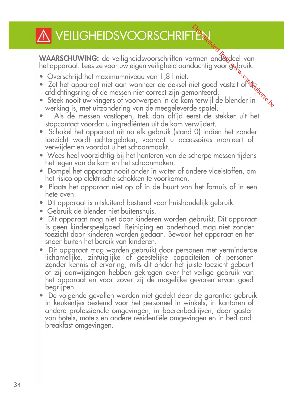 - De volgende gevallen worden niet gedekt door de garantie: gebruik in keukentjes bestemd voor het personeel in winkels, in kantoren of andere professionele omgevingen, in boerenbedrijven, door gasten van hotels, motels en andere residentiële omgevingen en in bed-and- breakfast omgevingen Downloaded from www.vandenborre.be35 VEILIGHEIDSVOORSCHRIFTEN