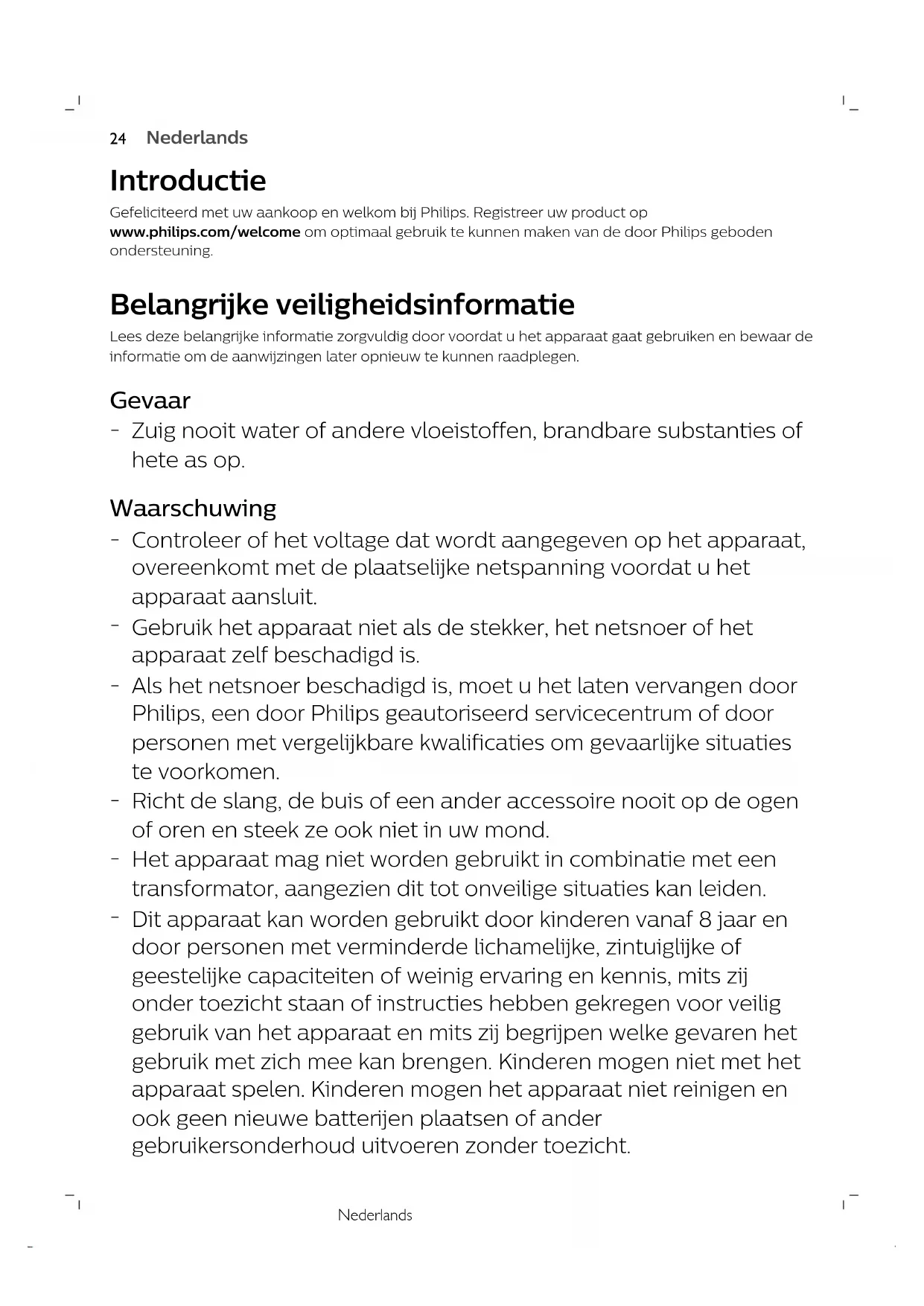 ItalianoNederlands Introductie Gefeliciteerd met uw aankoop en welkom bij Philips. Registreer uw product opwww.philips.com/welcome om optimaal gebruik te kunnen maken van de door Philips gebodenondersteuning. Belangrijke veiligheidsinformatie Lees deze belangrijke informatie zorgvuldig door voordat u het apparaat gaat gebruiken en bewaar deinformatie om de aanwijzingen later opnieuw te kunnen raadplegen. Gevaar