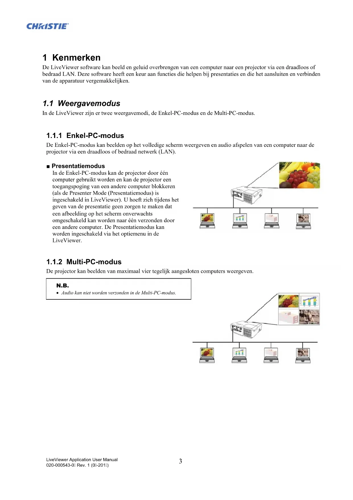 32-bits versie. LiveViewer Application User Manual 020-000543-0 Rev. 1 (0-201)6 N.B. voor de computer Een incorrecte versie van het besturingssysteem of van de stuurprogrammatuur (driver) voor de netwerkadapter kan ertoe leiden dat de beelden niet correct kunnen worden overgebracht. Wij bevelen u daarom aan uw besturingssysteem, stuurprogrammatuur (driver) en eventuele updates zorgvuldig te controleren. Afhankelijk van het type draadloze netwerkapparatuur en de computer die u gebruikt, kan de projector misschien niet in staat zijn om goed te communiceren met uw computer, zelfs als de computer die u gebruikt uitgerust is met een ingebouwde LAN-functionaliteit. Om communicatieproblemen te elimineren kunt u het beste een gecertificeerd Wi-Fi netwerkapparaat gebruiken. Als u LiveViewer gebruikt onder Windows Vista