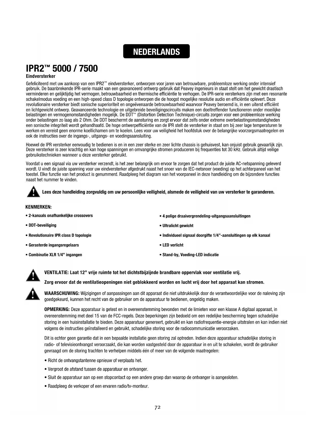 (Distortion Detection Technique)-circuits zorgen voor een probleemloze werking onder belastingen zo laag als 2 Ohm. De DDT beschermt de aansturing en zorgt ervoor dat zelfs onder extreme overbelastingomstandigheden een sonische integriteit wordt gehandhaafd. De hoge ontwerpefficiëntie van de IPR stelt de versterker in staat om bij zeer lage temperaturen te werken en vereist geen enorme koellichamen om te koelen. Lees voor uw veiligheid het hoofdstuk over de belangrijke voorzorgsmaatregelen en ook de instructies over de ingangs-, uitgangs- en voedingsaansluiting. Hoewel de IPR versterker eenvoudig te bedienen is en in een zeer sterke en zeer lichte chassis is gehuisvest, kan onjuist gebruik gevaarlijk zijn. Deze versterker is zeer krachtig en kan hoge spanningen en omvangrijke stromen produceren bij frequenties tot 30 kHz. Gebruik altijd veilige gebruikstechnieken wanneer u deze versterker gebruikt. Voordat u een signaal via uw versterker verzendt, is het zeer belangrijk om ervoor te zorgen dat het product de juiste AC-netspanning geleverd wordt. U vindt de juiste spanning voor uw eindversterker afgedrukt naast het snoer van de IEC-netsnoer (voeding) op het achterpaneel van het toestel. Elke functie van het product is genummerd. Raadpleeg het diagram van het voorpaneel in deze handleiding om de bijzondere functies naast het nummer te vinden. Lees deze handleiding zorgvuldig om uw persoonlijke veiligheid, alsmede de veiligheid van uw versterker te garanderen. NEDERLANDS VENTILATIE: Laat 12” vrije ruimte tot het dichtstbijzijnde brandbare oppervlak voor ventilatie vrij. Zorg ervoor dat de ventilatieopeningen niet geblokkeerd worden en lucht vrij door het apparaat kan stromen. KENMERKEN: