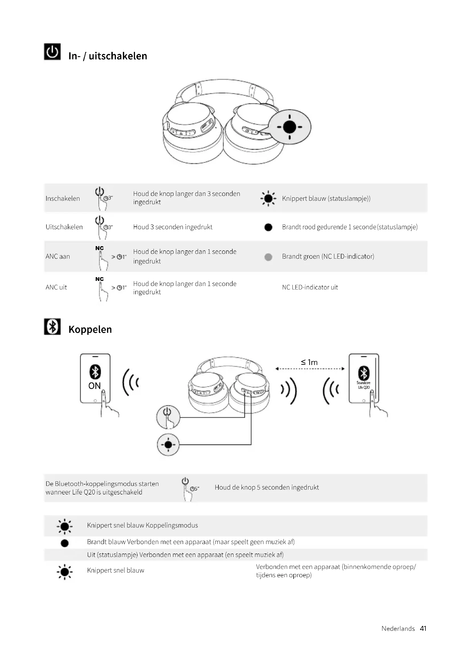 ≤ 1m Soundcore Life Q20 De Bluetooth-koppelingsmodus starten wanneer Life Q20 is uitgeschakeld