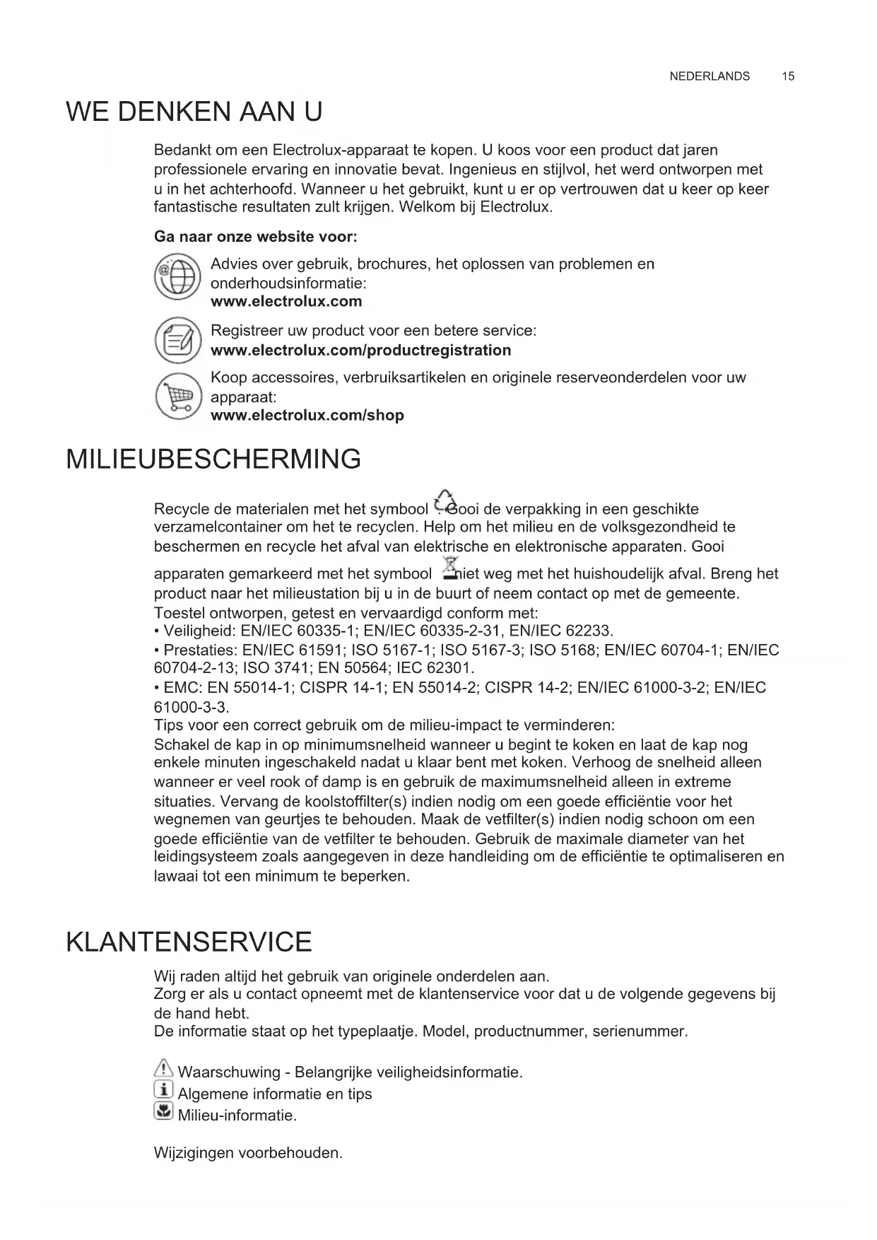 - EMC: EN 55014-1; CISPR 14-1; EN 55014-2; CISPR 14-2; EN/IEC 61000-3-2; EN/IEC 61000-3-3. Tips voor een correct gebruik om de milieu-impact te verminderen: Schakel de kap in op minimumsnelheid wanneer u begint te koken en laat de kap nog enkele minuten ingeschakeld nadat u klaar bent met koken. Verhoog de snelheid alleen wanneer er veel rook of damp is en gebruik de maximumsnelheid alleen in extreme situaties. Vervang de koolstoffilter(s) indien nodig om een goede efficiëntie voor het wegnemen van geurtjes te behouden. Maak de vetfilter(s) indien nodig schoon om een goede efficiëntie van de vetfilter te behouden. Gebruik de maximale diameter van het leidingsysteem zoals aangegeven in deze handleiding om de efficiëntie te optimaliseren en lawaai tot een minimum te beperken. KLANTENSERVICE Wij raden altijd het gebruik van originele onderdelen aan. Zorg er als u contact opneemt met de klantenservice voor dat u de volgende gegevens bij de hand hebt. De informatie staat op het typeplaatje. Model, productnummer, serienummer. Waarschuwing - Belangrijke veiligheidsinformatie. Algemene informatie en tips Milieu-informatie. Wijzigingen voorbehouden. NL GEBRUIKSAANWIJZINGwww.electrolux.com