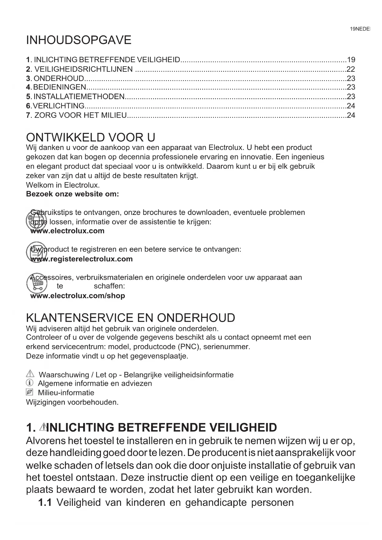 Wij adviseren altijd het gebruik van originele onderdelen. Controleer of u over de volgende gegevens beschikt als u contact opneemt met een erkend servicecentrum: model, productcode (PNC), serienummer. Deze informatie vindt u op het gegevensplaatje. Waarschuwing / Let op - Belangrijke veiligheidsinformatie Algemene informatie en adviezen Milieu-informatie Wijzigingen voorbehouden.