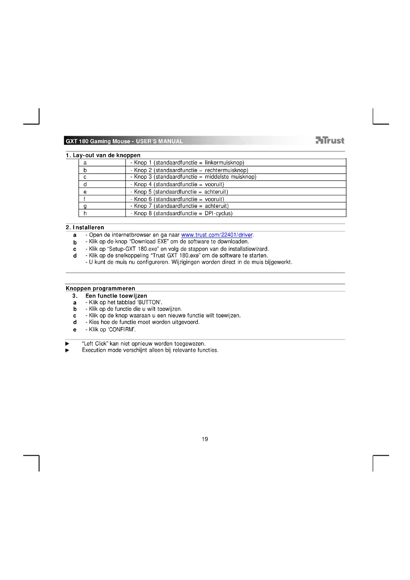 “Left Click” kan niet opnieuw worden toegewezen. Execution mode verschijnt alleen bij relevante functies.GXT 180 Gaming Mouse - USER’S MANUAL