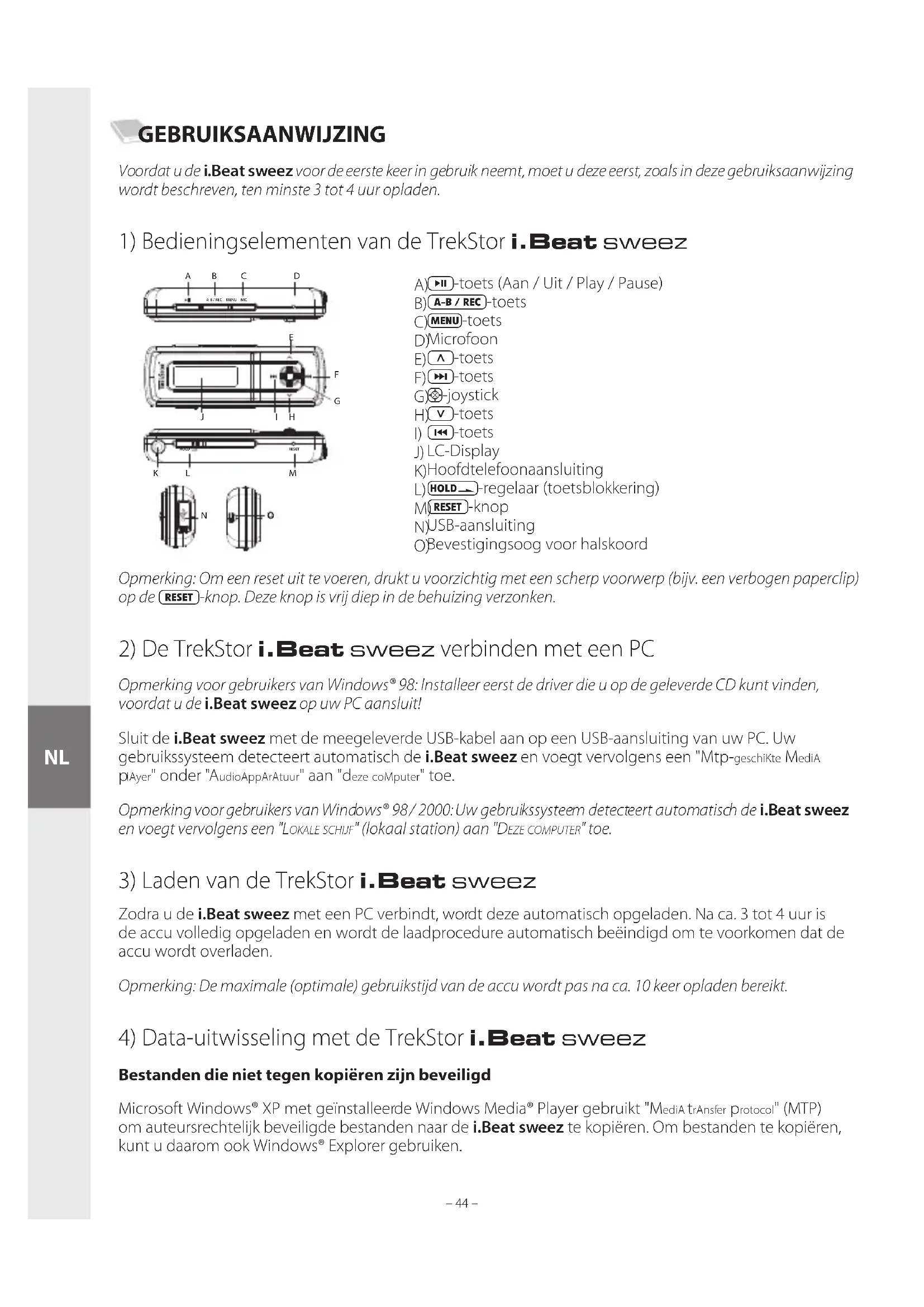 Hierbij gaat u als volgt te werk: a) Sluit de i.Beat sweez via de mini-USB-aansluiting met de meegeleverde USB-kabel aan op een vrije USB-aansluiting op uw PC. b) Het venster "Mtp M ediA plAyer" wordt weergegeven. c) Selecteer "g een Actie uitvoeren" en klik op "oK". d) Open "Deze computer". e) Markeer met de muis de gewenste bestanden op uw harde schijf. f ) Druk op de rechter muisknop en selecteer de optie "K opiëren". g) Selecteer in "Deze computer" onder "A udioAppArAtuur" de "sweez" en ga naar de directory "MediA". WMA-DRM9 resp. DRM10-beveiligde bestanden Voor het kopiëren van DRM9 resp. DRM10-beveiligde bestanden gebruikt u Windows Media® Player 10 of hoger. a) Sluit de i.Beat sweez via de mini-USB-aansluiting met de meegeleverde USB-kabel aan op een vrije USB-aansluiting op uw PC. b) Start Windows Media® Player 10. c) Klik in de taakbalk van de Media® Players op "s ynchroniseren". Opmerking: Als de taakbalk niet zichtbaar is, gaat u naar "beeld" + "opties Voor tAAkbAlk" + "tAAkbAlk WeergeVen" en verwijdert u het vinkje door op de muis te klikken. Eventueel kunt u het benodigde dialoogvenster ook als volgt openen: "bestAnd" + "cd's en AppArAten" + "synchroniseren...". d) Sleep de gewenste bestanden middels Drag&Drop naar de lijst "s ynchronisAtieliJst" aan de linkerzijde. e) Selecteer in het vervolgkeuzemenu rechtsboven de i.Beat sweez onder "ondersteunde drAAgbAre AppArAten en stuurprogrAMMA's...". f) Klik vervolgens linksboven op de knop "b eginnen Met synchroniseren". g) De geselecteerde bestanden worden vervolgens automatisch naar de i.Beat sweez gekopieerd. h) Wacht totdat de synchronisatie is voltooid. Opmerking: Koppel tijdens de dataoverdracht in geen enkel geval de USB-verbinding los! Data-uitwisseling onder Windows® 98 / 2000 / ME a) Markeer met de muis de gewenste bestanden, (bijv. MP3). Kopieer deze door op de rechter muisknop te drukken ("Kopiëren"). b) Selecteer in "d eze coMputer" de lokale schijf "treKstor i.beAt sweez". c) Druk op de rechter muisknop en selecteer de optie "i nvoegen" om het kopiëren te starten. Als het kopiëren voltooid is, staan de bestanden op de i.Beat sweez.– 46 –