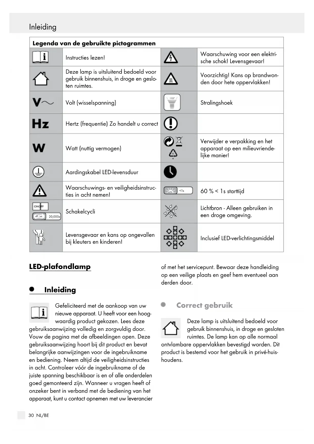 Verwijder e verpakking en het apparaat op een milieuvriende- lijke manier! Aardingskabel LED-levensduur Waarschuwings- en veiligheidsinstruc- ties in acht nemen! <1s 60% 60 % < 1s starttijd ON OFF 20,000x Schakelcycli Lichtbron - Alleen gebruiken in een droge omgeving. Levensgevaar en kans op ongevallen bij kleuters en kinderen! Inclusief LED-verlichtingsmiddel LED-plafondlamp Inleiding Gefeliciteerd met de aankoop van uw nieuwe apparaat. U heeft voor een hoog- waardig product gekozen. Lees deze gebruiksaanwijzing volledig en zorgvuldig door. Vouw de pagina met de afbeeldingen open. Deze gebruiksaanwijzing hoort bij dit product en bevat belangrijke aanwijzingen voor de ingebruikname en bediening. Neem altijd de veiligheidsinstructies in acht. Controleer vóór de ingebruikname of de juiste spanning beschikbaar is en of alle onderdelen goed gemonteerd zijn. Wanneer u vragen heeft of onzeker bent in verband met de bediening van het apparaat, kunt u contact opnemen met uw leverancier of met het servicepunt. Bewaar deze handleiding op een veilige plaats en geef hem eventueel aan derden door. Correct gebruik Deze lamp is uitsluitend bedoeld voor gebruik binnenshuis, in droge en gesloten ruimtes. De lamp kan op alle normaal ontvlambare oppervlakken bevestigd worden. Dit product is bestemd voor het gebruik in privé-huis- houdens.31 NL/BE Inleiding Inleiding / Veiligheid Omvang van de levering Controleer de levering altijd direct na het uitpakken op volledigheid en optimale staat van het product. 1 LED-plafondlamp, model 14134909L / 14135002L / 14135102L 1 glasplaat (14134909L) 3 lampenringen (14135002L / 14135102L) 2 pluggen 2 schroeven (montagebeugel) 2 isolatiekousen 1 montage- en bedieningshandleiding Beschrijving van de onderdelen