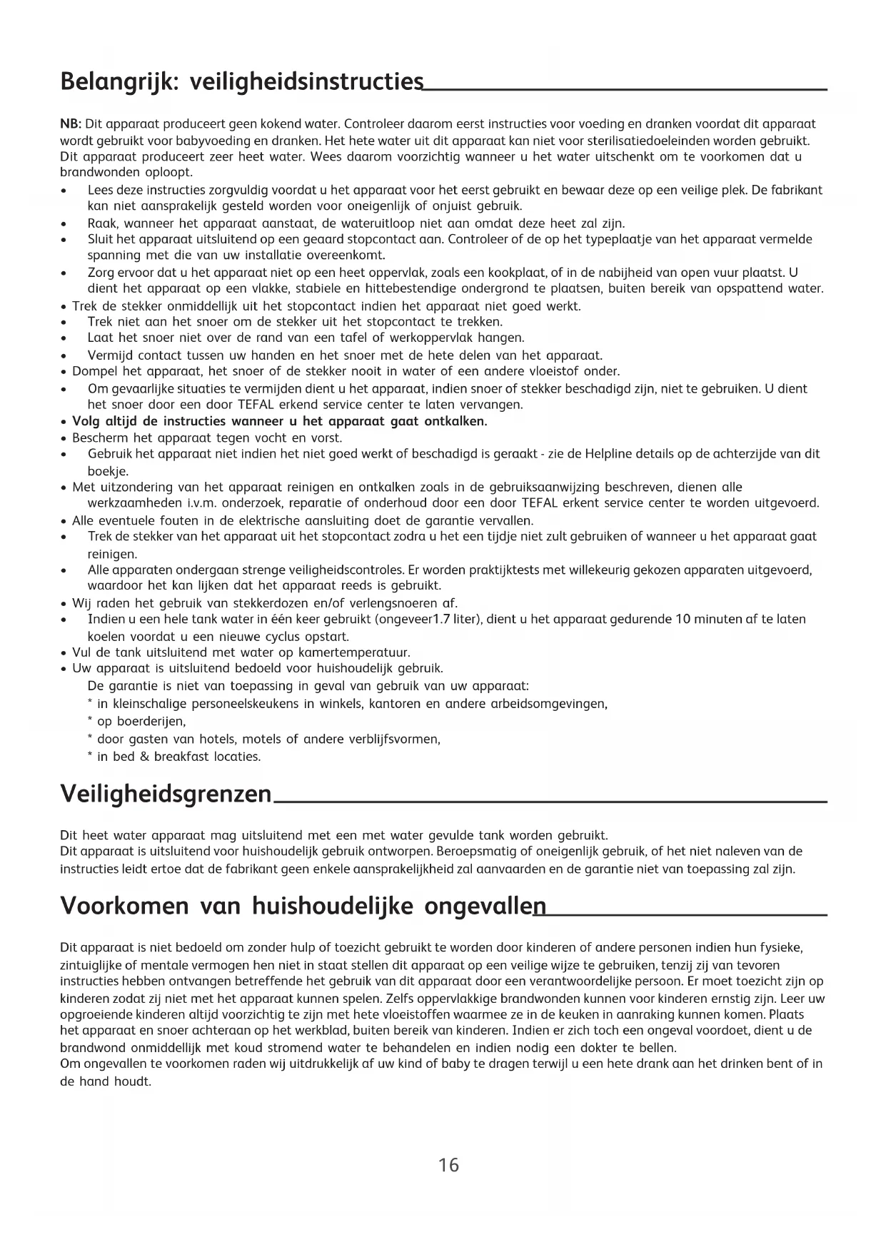 - in bed & breakfast locaties. Veiligheidsgrenzen Dit heet water apparaat mag uitsluitend met een met water gevulde tank worden gebruikt. Dit apparaat is uitsluitend voor huishoudelijk gebruik ontworpen. Beroepsmatig of oneigenlijk gebruik, of het niet naleven van de instructies leidt ertoe dat de fabrikant geen enkele aansprakelijkheid zal aanvaarden en de garantie niet van toepassing zal zijn. Voorkomen van huishoudelijke ongevallen Dit apparaat is niet bedoeld om zonder hulp of toezicht gebruikt te worden door kinderen of andere personen indien hun fysieke, zintuiglijke of mentale vermogen hen niet in staat stellen dit apparaat op een veilige wijze te gebruiken, tenzij zij van tevoren instructies hebben ontvangen betreffende het gebruik van dit apparaat door een verantwoordelijke persoon. Er moet toezicht zijn op kinderen zodat zij niet met het apparaat kunnen spelen. Zelfs oppervlakkige brandwonden kunnen voor kinderen ernstig zijn. Leer uw opgroeiende kinderen altijd voorzichtig te zijn met hete vloeistoffen waarmee ze in de keuken in aanraking kunnen komen. Plaats het apparaat en snoer achteraan op het werkblad, buiten bereik van kinderen. Indien er zich toch een ongeval voordoet, dient u de brandwond onmiddellijk met koud stromend water te behandelen en indien nodig een dokter te bellen. Om ongevallen te voorkomen raden wij uitdrukkelijk af uw kind of baby te dragen terwijl u een hete drank aan het drinken bent of in de hand houdt.
