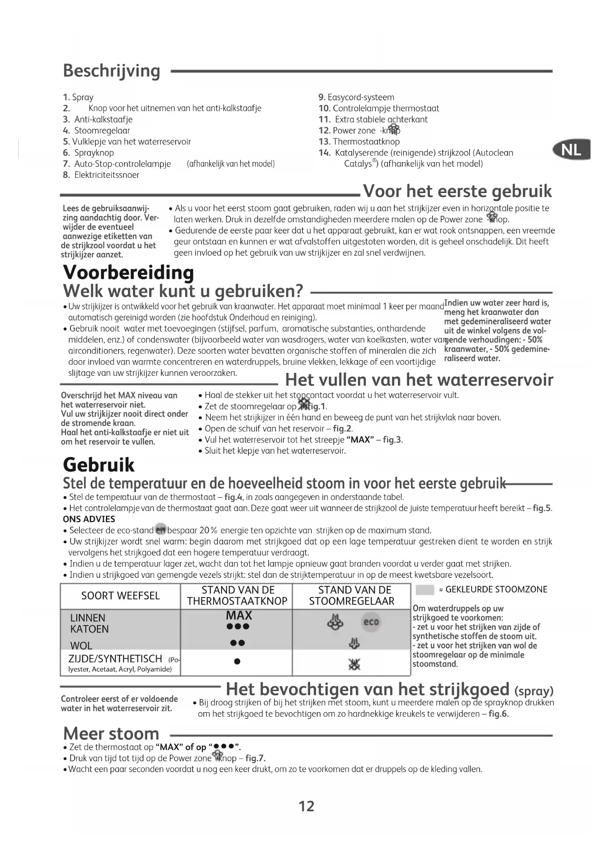 - Stel de temperatuur in aan de hand van de te strijken stof.• Zet de stoomregelaar op – fig.1.• U kunt gaan strijken als het controlelampje uitgaat. Extra functies Autoclean Catalys